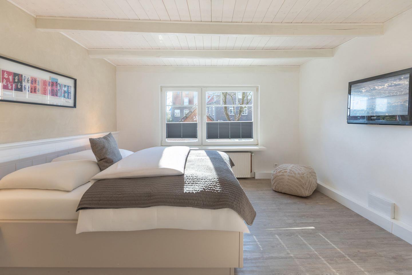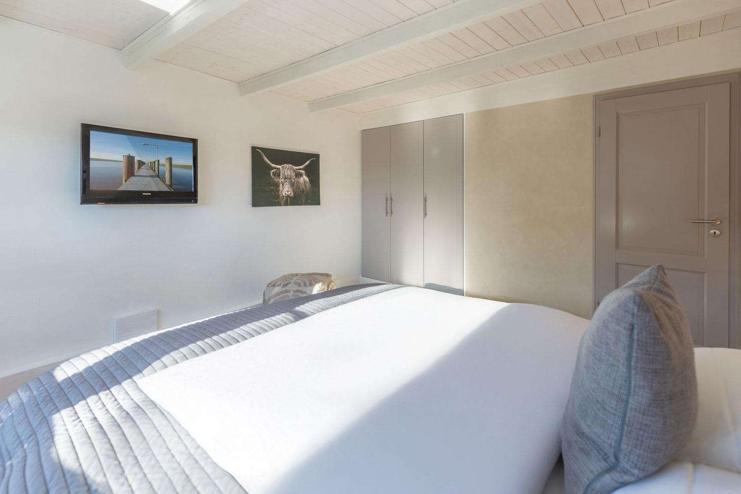 Im Obergeschoss befinden sich zwei Schlafzimmer, das größere ist zusätzlich mit einem TV ausgestattet sind.