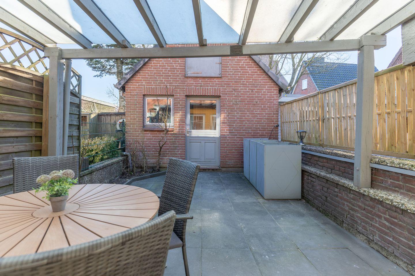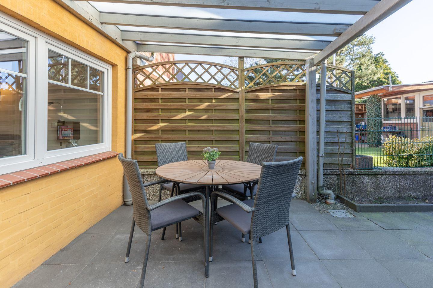 Auf der überdachten Terrasse mit den Gartenmöbeln können Sie den Tag gemütlich ausklingen lassen.