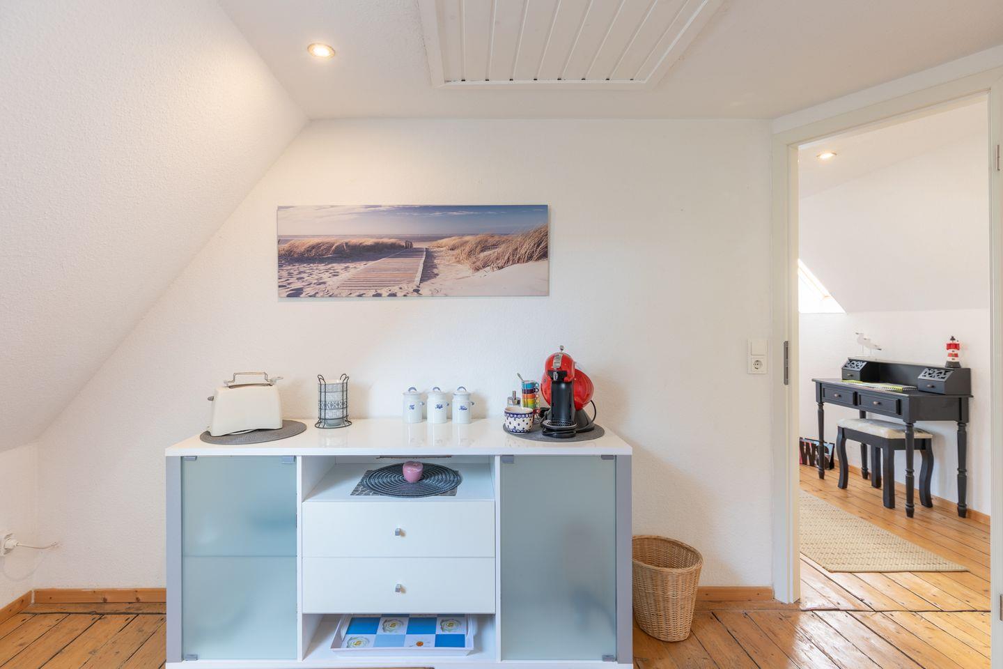 Die kleine aber feine Ferienwohnung ist mit schönen Holzdielenboden ausgestattet. Das Wohnzimmer bietet Ihnen ein gemütliches Sofa (mit Schlaffunktion), einen Sessel und einen Fernseher. In der separaten Küche finden Sie einen großzügigen Essbereich. In der Küchenzeile stehen Kühlschrank mit Gefrierfach, Geschirrspülmaschine, Kaffeemaschine (Filtergröße 4), Herd mit Backofen, Wasserkocher und Toaster für Sie bereit.