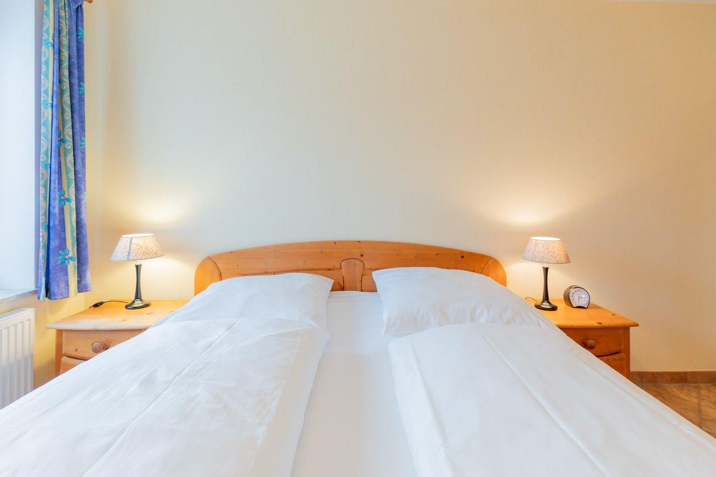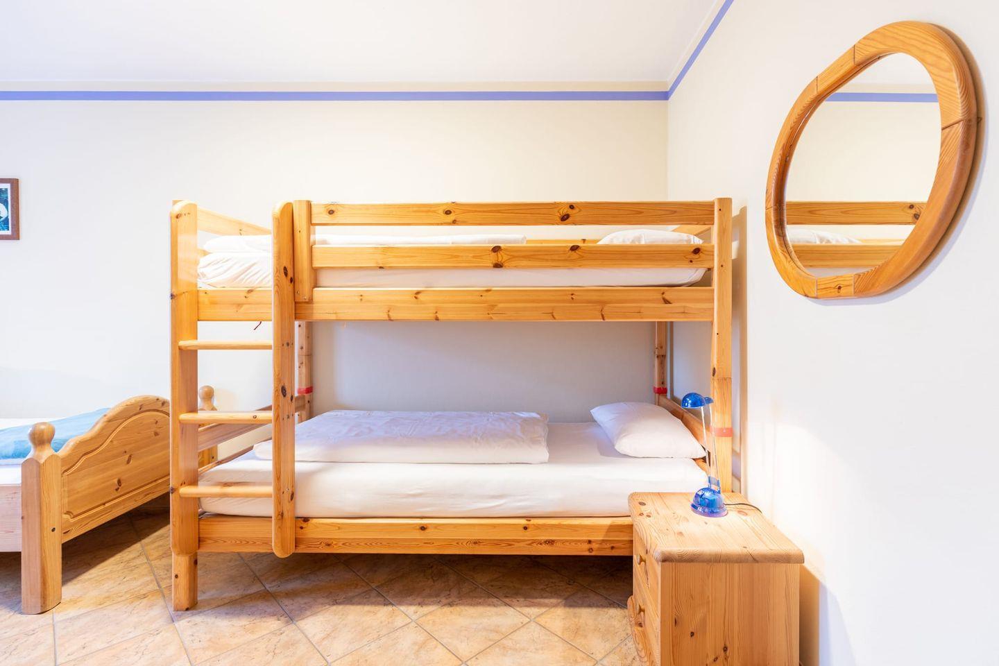 Der helle Wohnraum bietet Ihnen eine gemütliche Sofaecke mit TV, einen Essbereich und eine offene Küchenzeile mit Geschirrspüler, Glaskeramikherd, Backofen, Kühlschrank mit Gefrierfach, Mikrowelle, Kaffeemaschine und Wasserkocher. Im Schlafzimmer steht Ihnen ein Doppelbett (180 x 200) für Ihren erholsamen Schlaf zur Verfügung. Das zweite Schlafzimmer ist mit einem Etagenbett und einem Einzelbett, das 3. mit einem Einzelbett ausgestattet. Das Badezimmer mit der bodengleichen Dusche rundet das Bild ab.