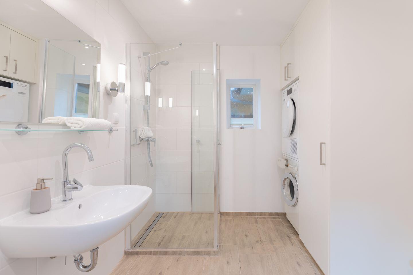 Die Ferienwohnung ist schön eingerichtet: im Erdgeschoss befindet sich das geräumige Wohnzimmer mit Essbereich, TV und Zugang zu der überdachten Terrasse. Die separate Küche ist sehr komfortabel mit Ceranfeld, Backofen, Geschirrspülmaschine, Kühl- und Gefrierschrank und Kaffeemaschine (Filtergröße 4) ausgestattet. Das großzügige Duschbad mit Waschmaschine und Trockner rundet das Bild ab.
