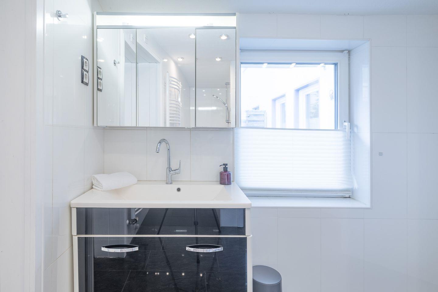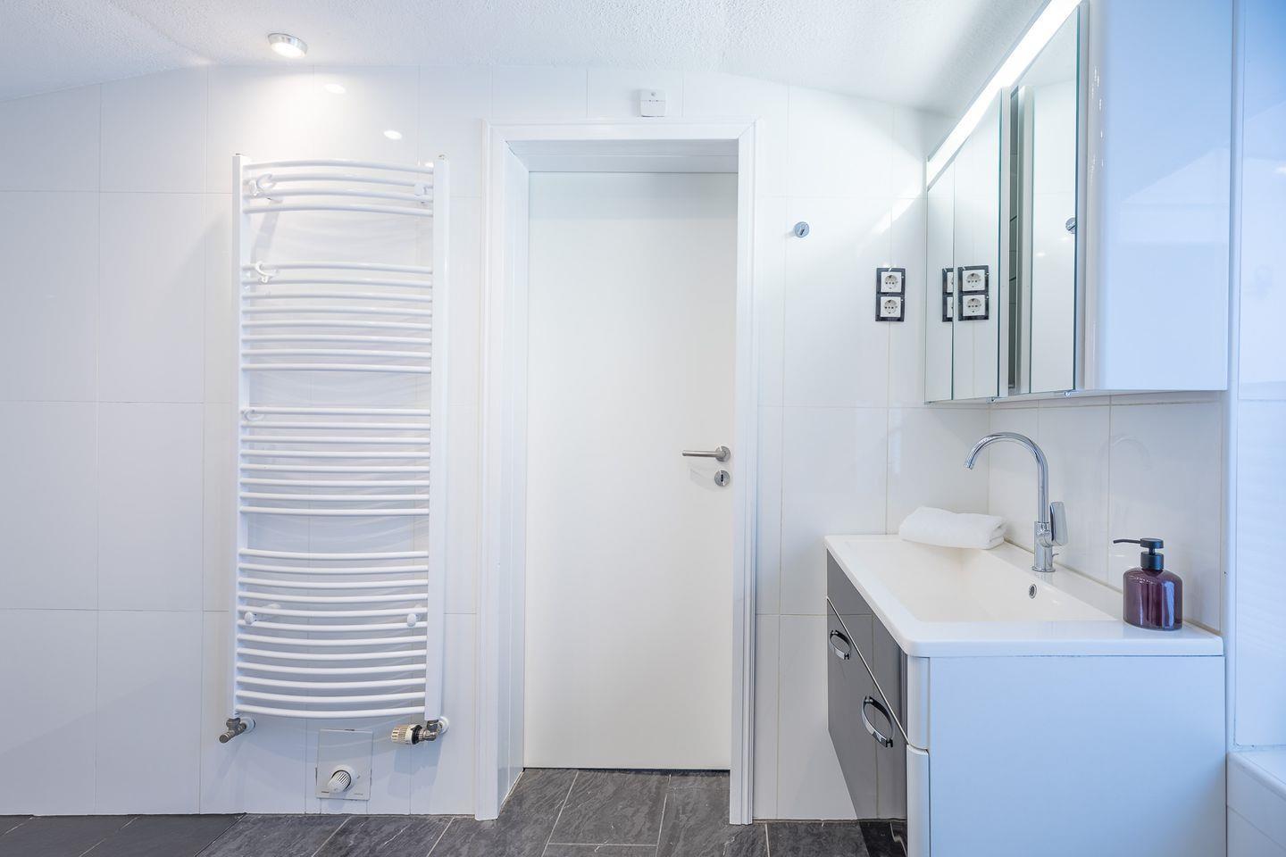 Das große, moderne Badezimmer verfügt über eine ebenerdige Dusche und ein separates WC. Eine Waschmaschine steht Ihnen im Flur zur gemeinschaftlichen Nutzung zur Verfügung.