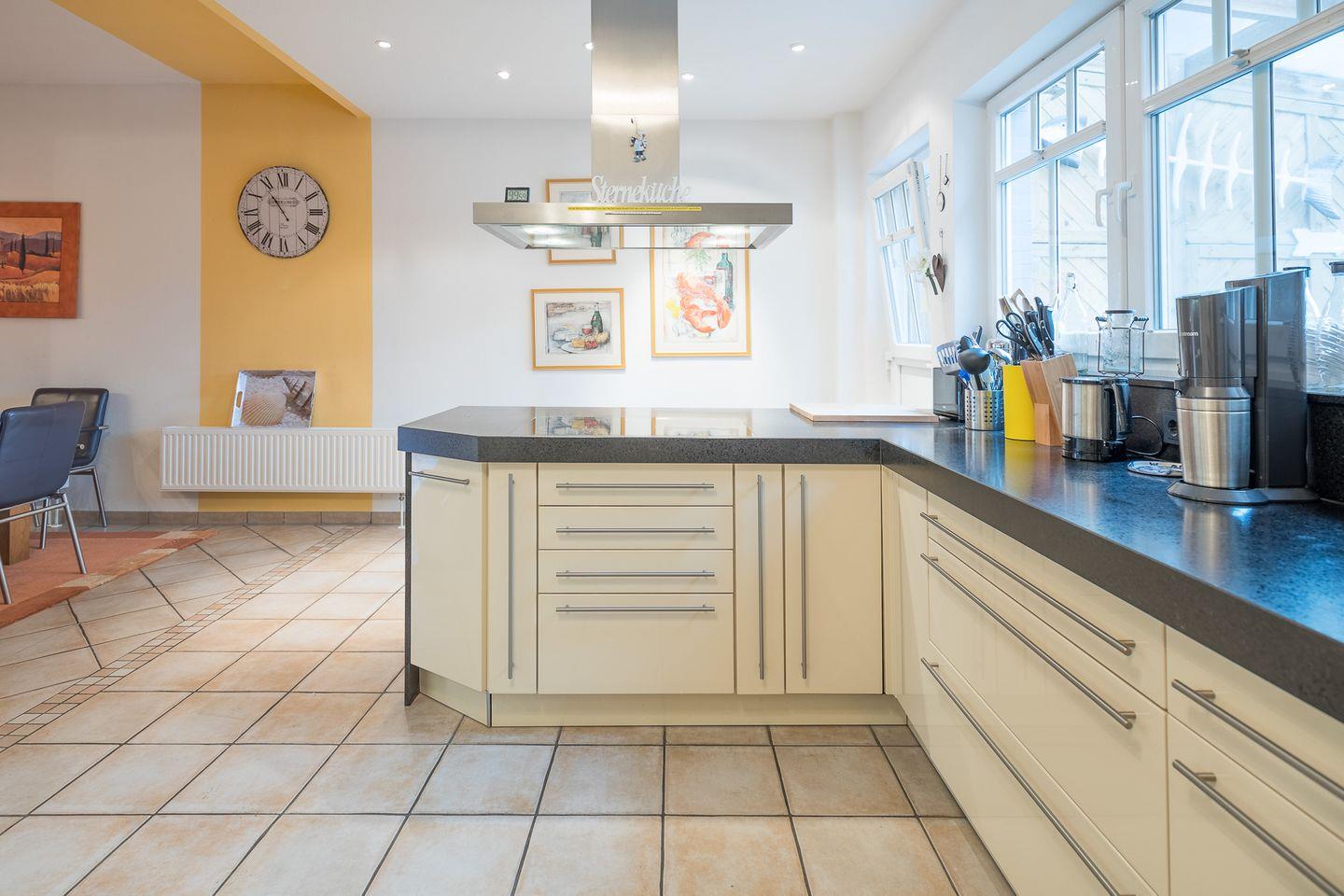 Im Erdgeschoss befindet sich das Wohnzimmer mit einer gemütlichen Sitzecke, Kaminofen, SAT Anlage mit Smart-TV einer Musikanlage und einer Playstation. Die offene Küche ist hochwertig, mit Induktionsherd, Backofen, Geschirrspüler, Kühlschrank mit Gefrierfach, Wasserkocher, Toaster, Kaffeemaschine, Mikrowelle, einem Soda-Stream uvm. ausgestattet. Der großzügige Esstisch lädt zu geselligen Abenden ein.