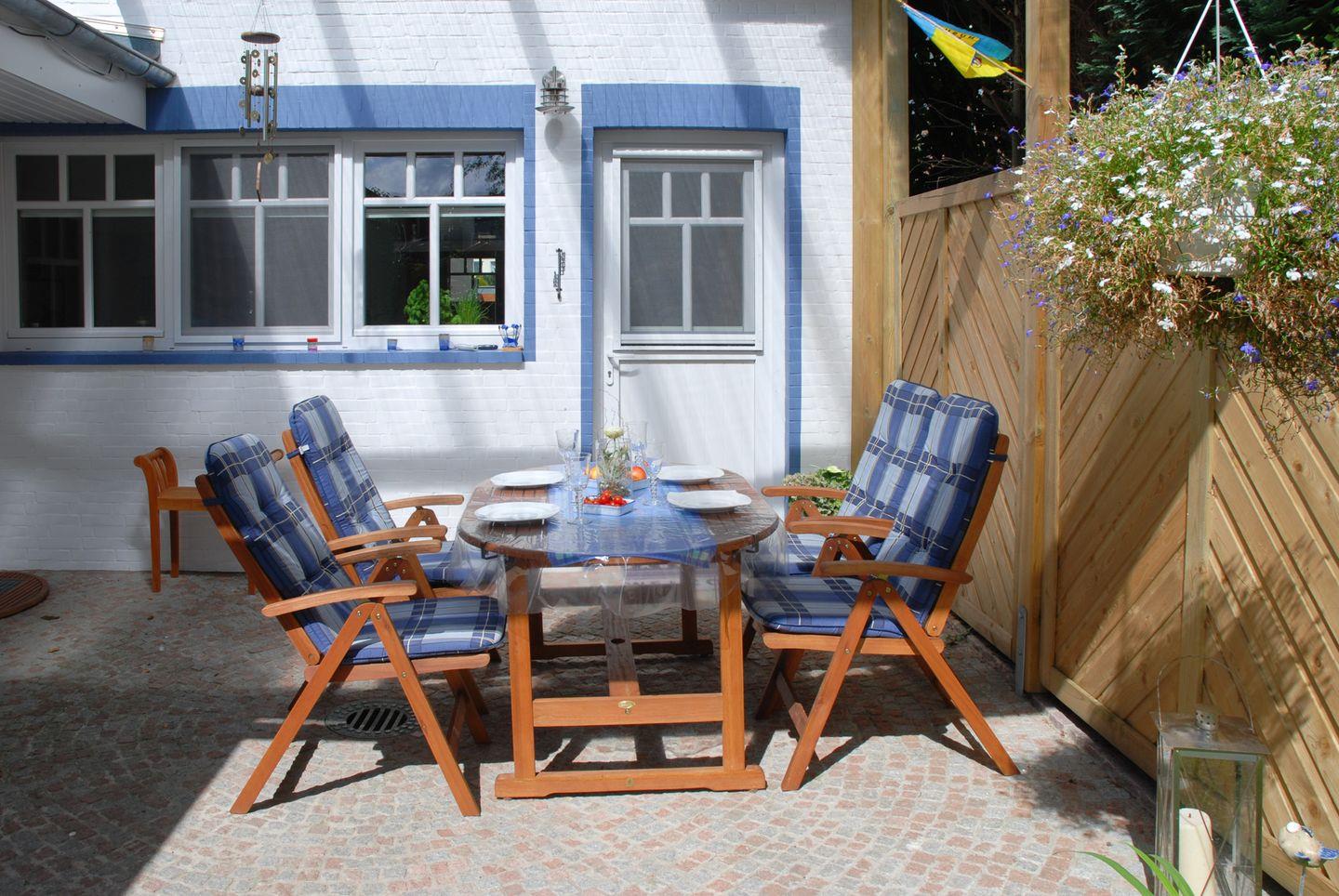 Im Garten mit seiner überdachten Terrasse können Sie auf bequemen Gartenmöbeln den erlebnisreichen Tag gemütlich ausklingen lassen. Ein Holzkohle-Grill steht Ihnen zur Verfügung.