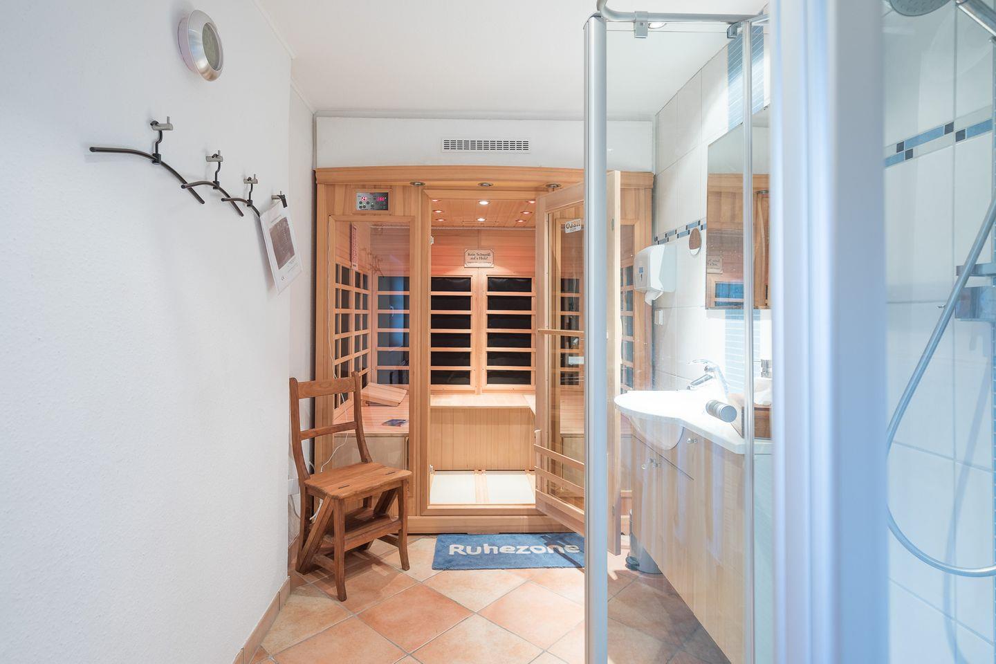 Das geräumige Badezimmer mit einer bodengleichen Dusche mit Massagedüsen bietet Ihnen zusätzlich noch den Komfort einer Infrarotkabine (gegen Gebühr) für die perfekte Entspannung. Hier stehen auch eine Waschmaschine und ein Wäschetrockner für Sie bereit.