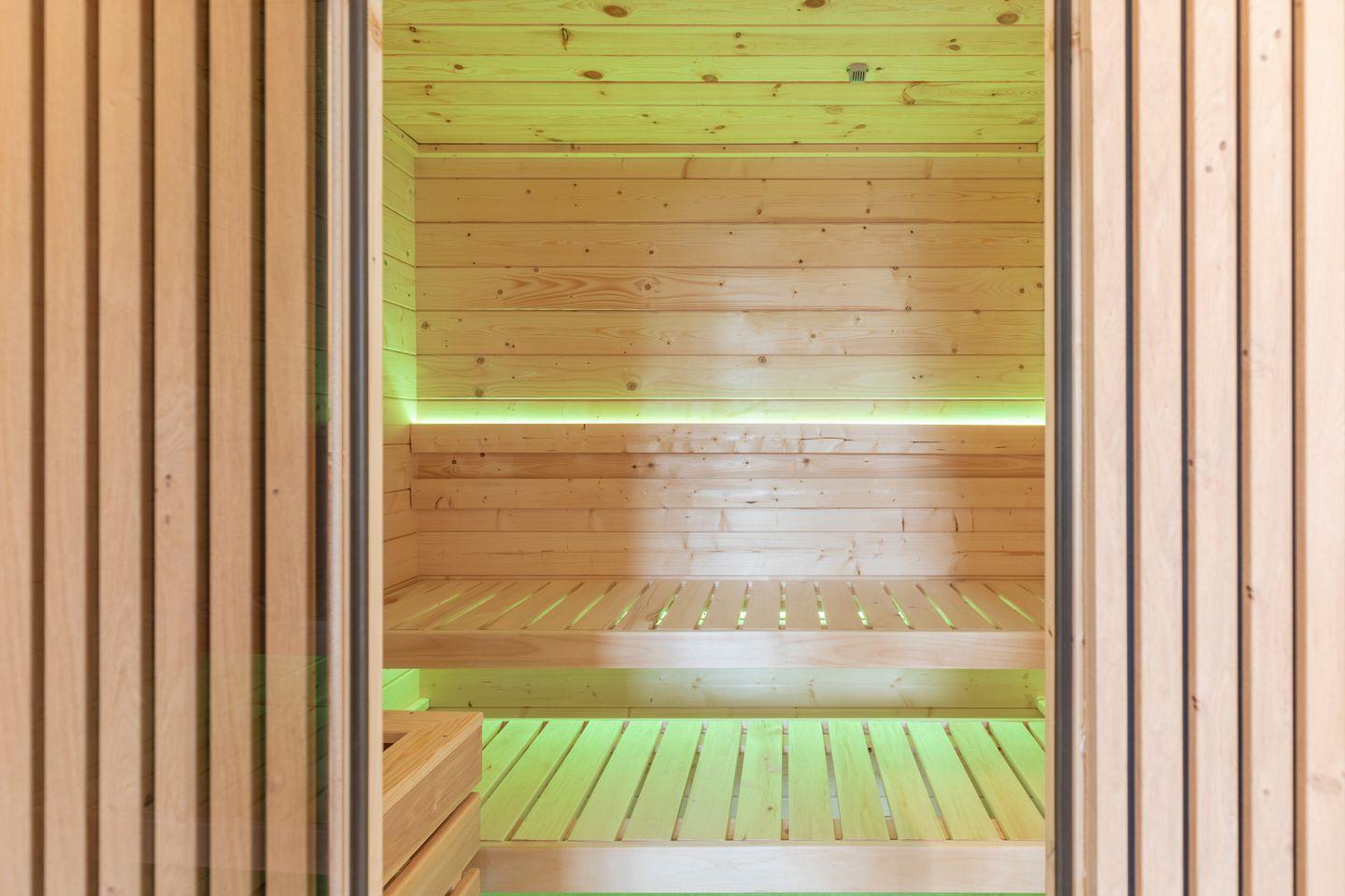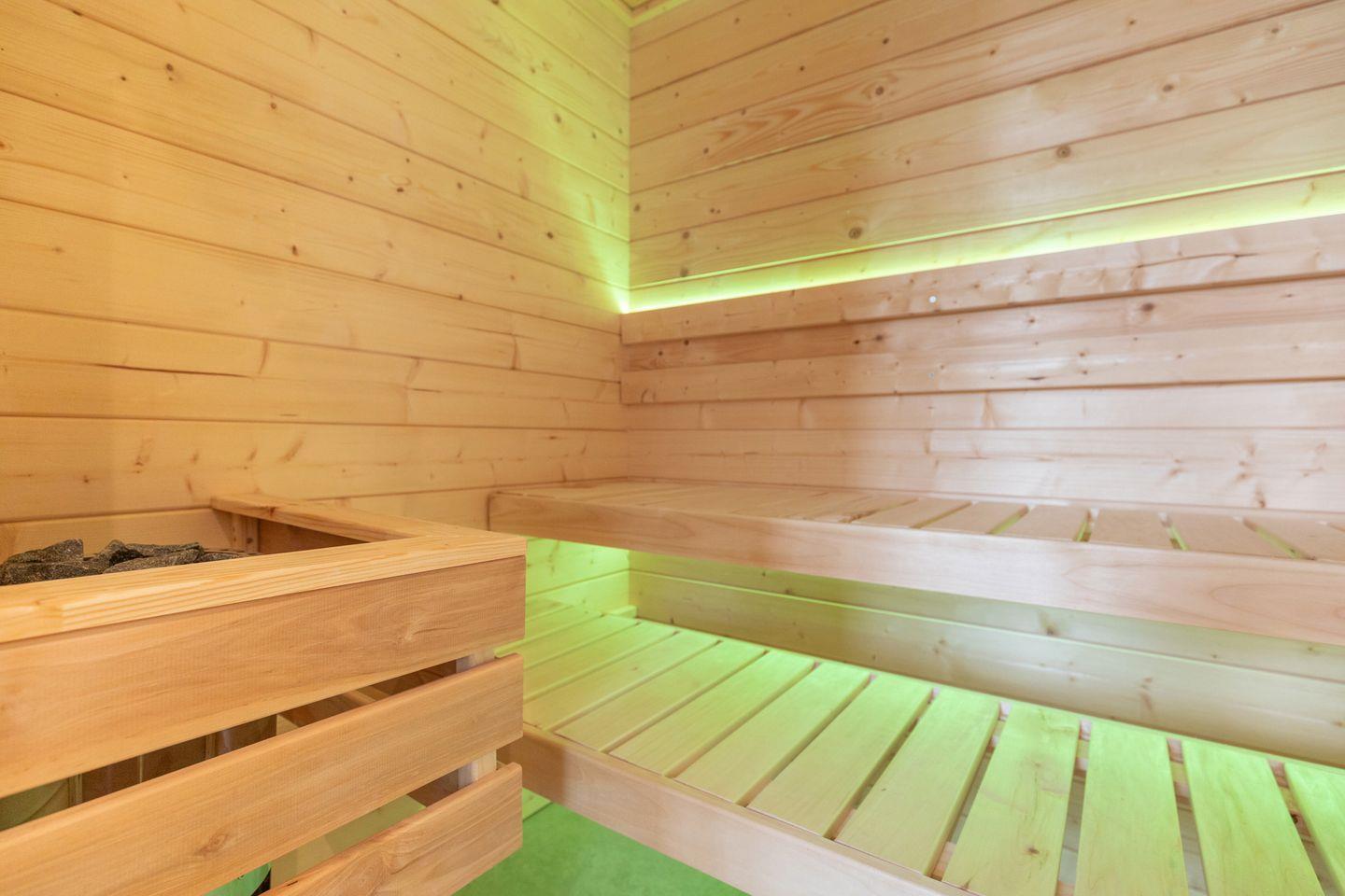 Genießen Sie entspannte Wellnesszeiten in unserer geräumigen Sauna und lassen Sie den Alltagsstress hinter sich.