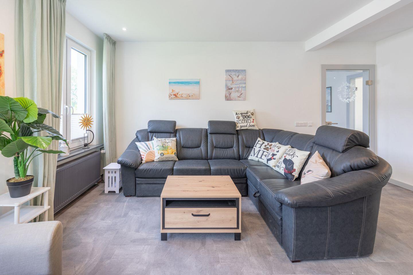 Im unteren Wohnbereich lädt ein großer Esstisch zu gemeinsamen, gemütlichen Stunden ein. Von hier aus gelangen Sie auch auf die Terrasse des Hauses und dem umzäunten Außenbereich. Im angrenzenden Wohnzimmer steht Ihnen eine gemütliche Sofaecke mit Flatscreen-TV und ein Schlafsofa (140x200) zur Verfügung.