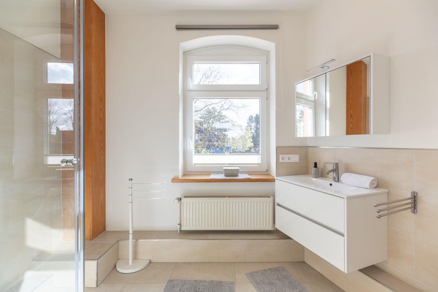 Ein modernes Duschbad mit Dusche, WC und einem Fenster mit Blick in den Garten rundet das Bild ab.