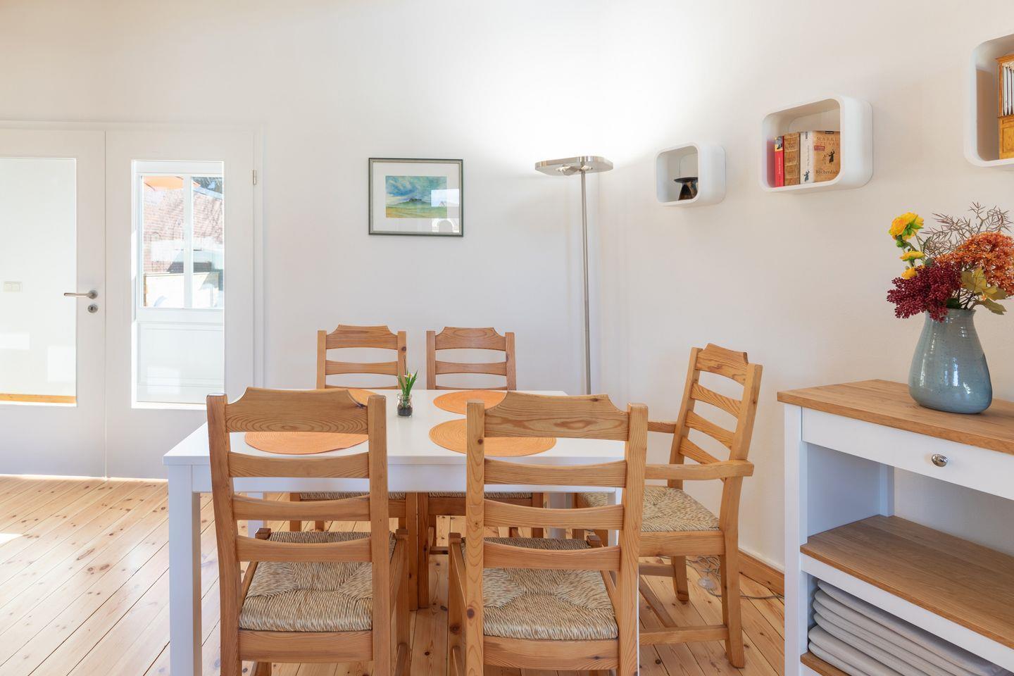 Die großzügige Ferienwohnung mit ca. 90qm Wohnfläche bietet alles, was Sie für einen gelungenen Nordseeurlaub benötigen: Die moderne Küche verfügt über einen Herd mit Ceranfeld, einen Backofen, eine Filterkaffeemaschine (Filtergröße 4), einen Wasserkocher, einen Toaster und eine Vielzahl von Küchenutensilien. Der einladende Wohn- und Essbereich lädt zu gemeinsamen Stunden und gemütlichem Verweilen ein. Auch ein Gäste-WC befindet sich auf dieser Etage.