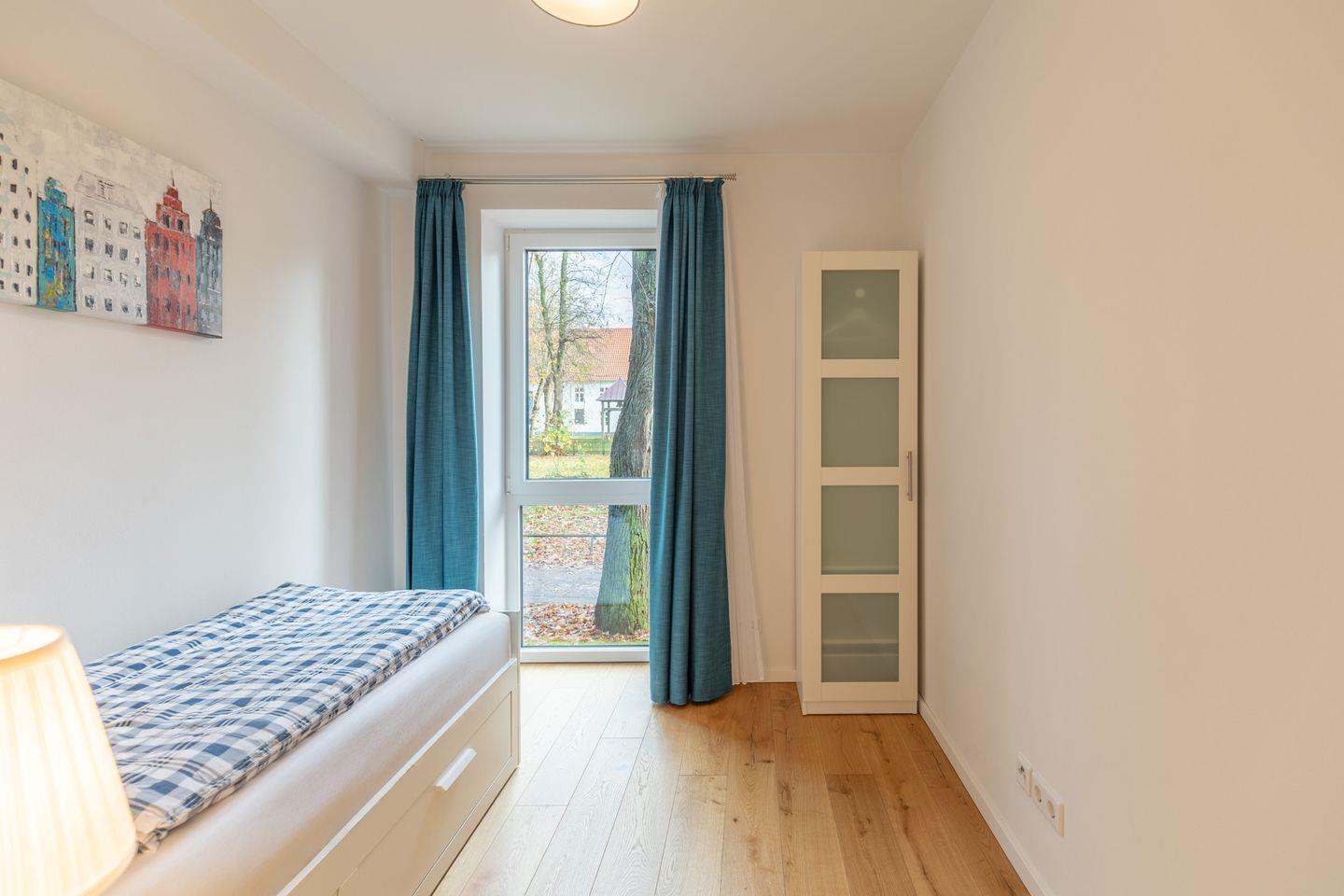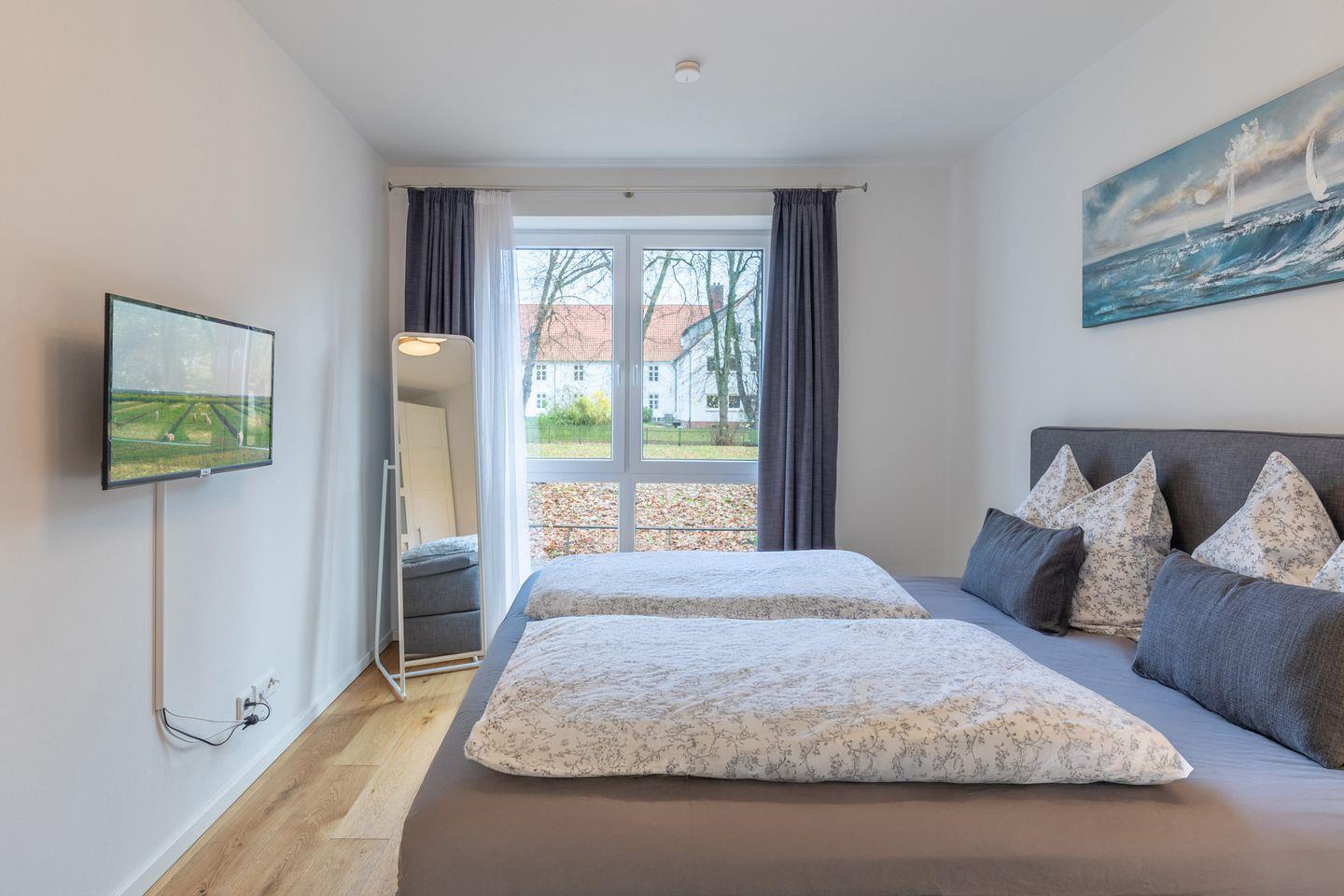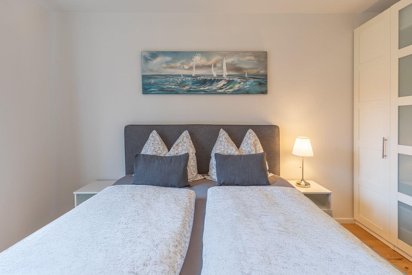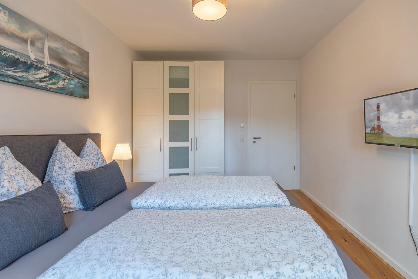 Die zwei Schlafzimmer sind wie folgt aufgeteilt. Ein Schlafzimmer mit einem Boxspringbett (1,80 m x 2,00 m – ohne Fußende) und Kleiderschrank und ein Schlafzimmer mit einem Einzelbett (0,80 x 2,00 m, ohne Fußende) welches zu einem Doppelbett (1,60 m x 2,00 m) umgewandelt werden kann und einem Kleiderschrank. Das Badezimmer ist mit einer bodentiefen Dusche, WC, und einem Handtuchwärmer ausgestattet. Vom Küchenbereich gelangen Sie auf den Balkon mit Blick in Storms ehemaligen Garten und herrlicher Ruhe. Alle Zimmer sind mit einer Fußbodenheizung ausgestattet.