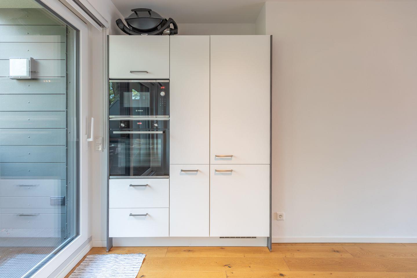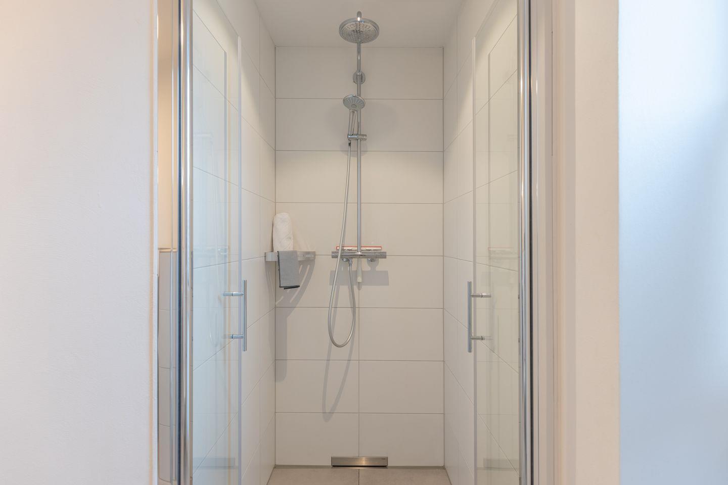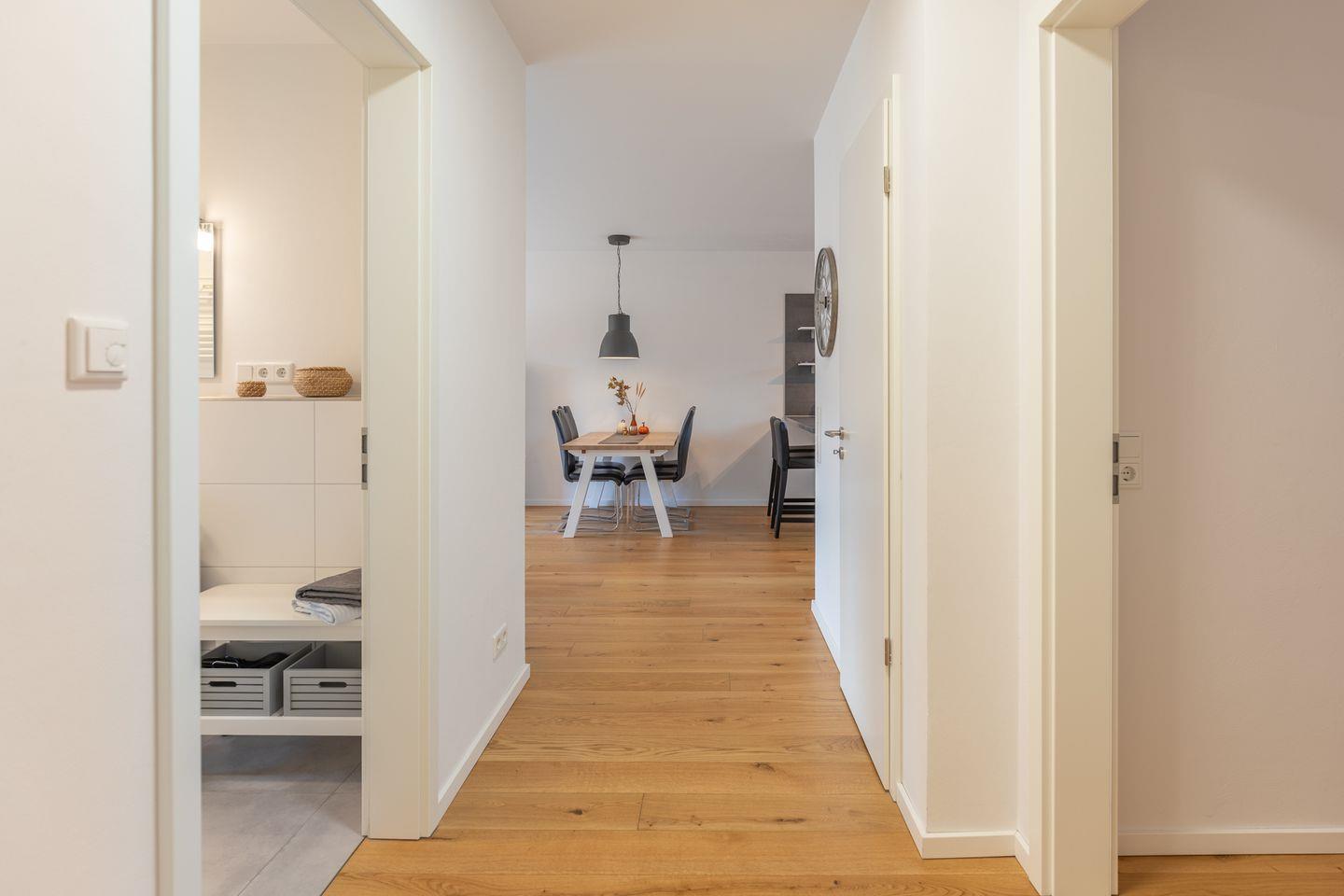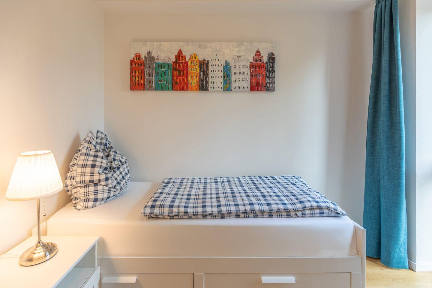 Die zwei Schlafzimmer sind wie folgt aufgeteilt. Ein Schlafzimmer mit einem Boxspringbett (1,80 m x 2,00 m – ohne Fußende) und Kleiderschrank und ein Schlafzimmer mit einem Einzelbett (0,80 x 2,00 m, ohne Fußende) welches zu einem Doppelbett (1,60 m x 2,00 m) umgewandelt werden kann und einem Kleiderschrank. Das Badezimmer ist mit einer bodentiefen Dusche, WC, und einem Handtuchwärmer ausgestattet. Vom Küchenbereich gelangen Sie auf den Balkon mit Blick in Storms ehemaligen Garten und herrlicher Ruhe. Alle Zimmer sind mit einer Fußbodenheizung ausgestattet.