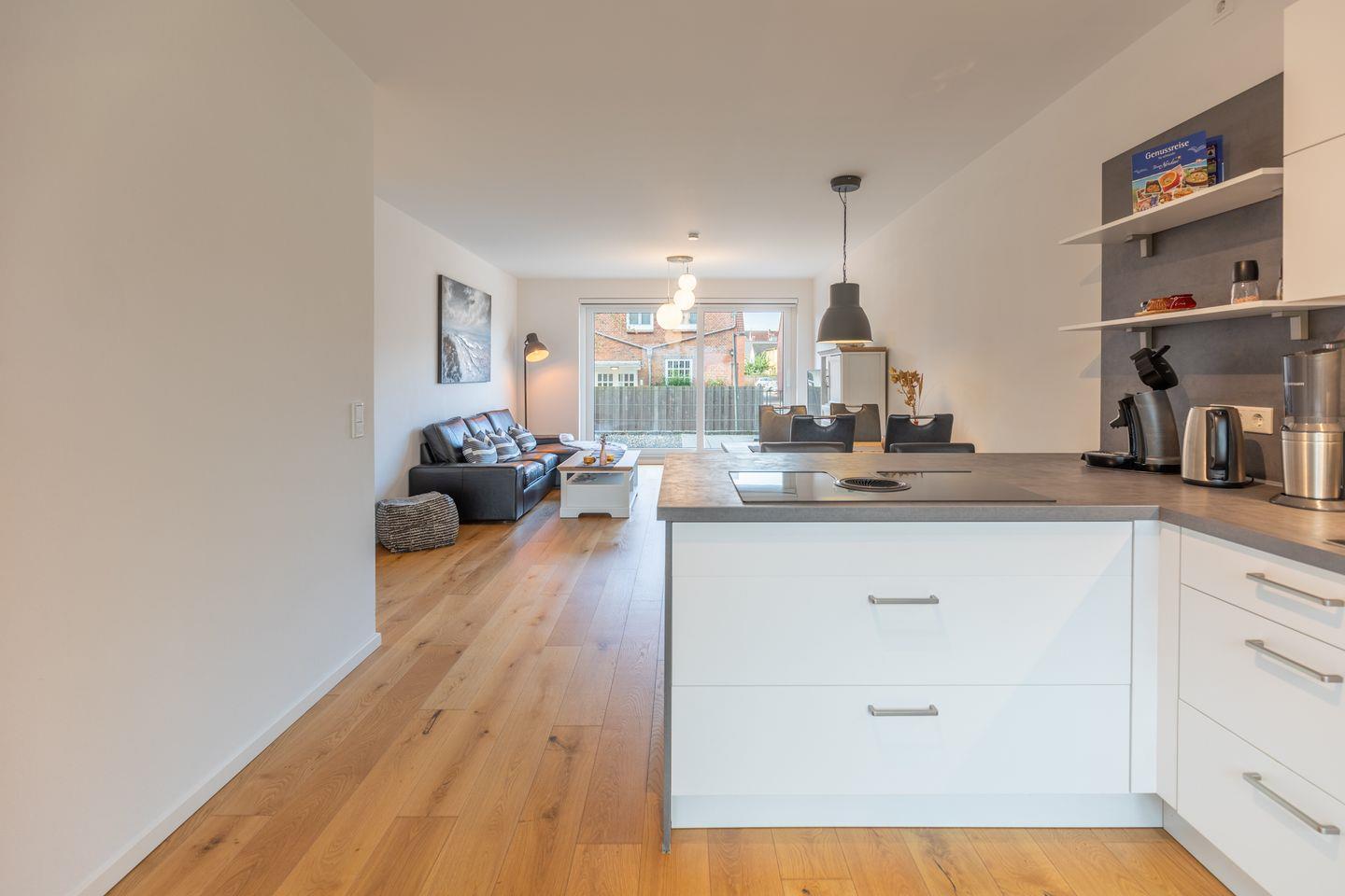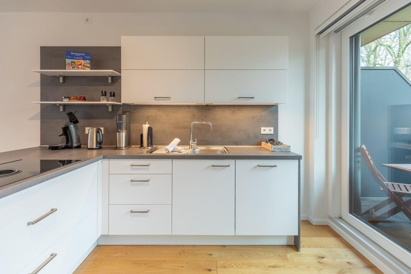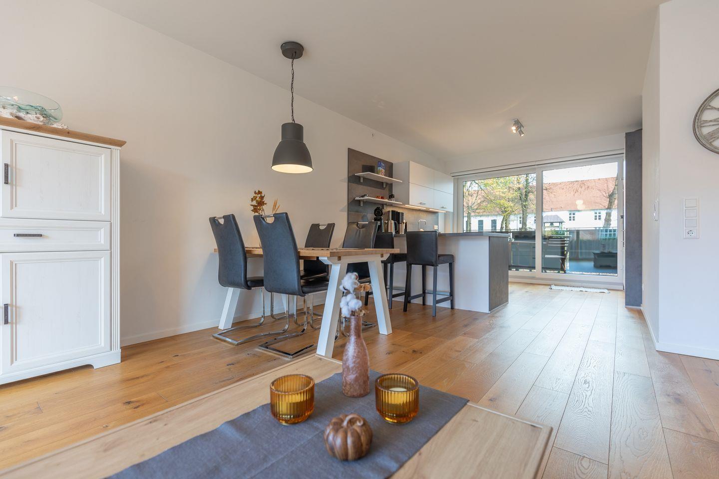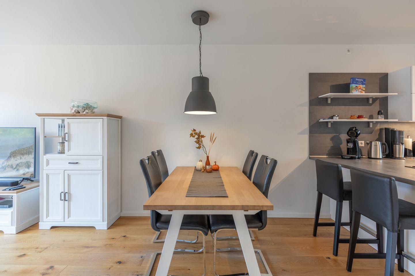 Die modern und geschmackvoll eingerichtete Ferienwohnung Theo's Garten ist ca. 80 m² groß, liegt im Erdgeschoss und bietet Platz für vier Personen. Die Ferienwohnung ist aufgeteilt in einen kombinierten Wohn-/ Ess- und Küchenbereich, zwei Schlafzimmern, einem Badezimmer und Gäste-WC. Der helle lichtdurchflutete Wohnbereich ist mit einer Ledercouch, einem TV-Gerät, Soundbar mit Amazon Alexa Funktion und einem Essplatz für vier Personen eingerichtet. Direkt angrenzend ist der großzügige offene Küchenbereich, welcher mit einem Herd mit Induktionsfeld, Backofen, Geschirrspüler, Mikrowelle, Kühlschrank, Gefrierschrank, Kaffeepad-Maschine, Wasserkocher, Toaster und SodaStream Gerät ausgestattet ist.
