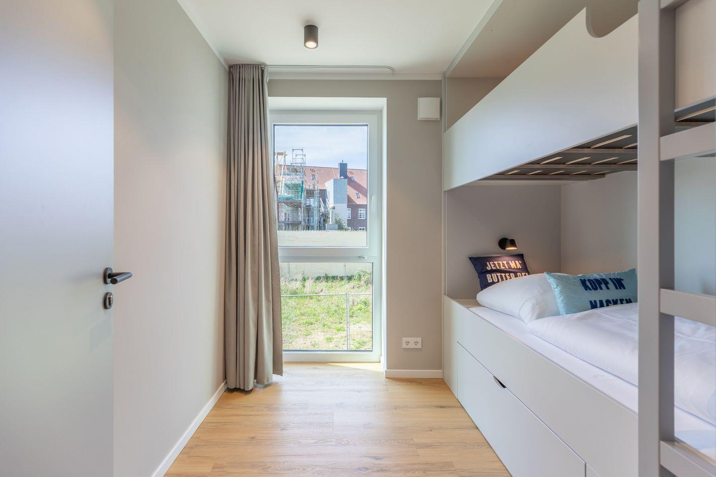 Das Badezimmer (Zugang über eines der Schlafzimmer) verfügt über eine ebenerdige Dusche, WC, Kosmetikspiegel und Föhn. Zudem ist das Apartment komplett mit Fußbodenheizung ausgestattet und bietet im Schlafzimmer Verdunkelungsgardinen für einen entspannten Schlaf. Alle Apartments in den oberen Etagen sind über einen Aufzug erreichbar.