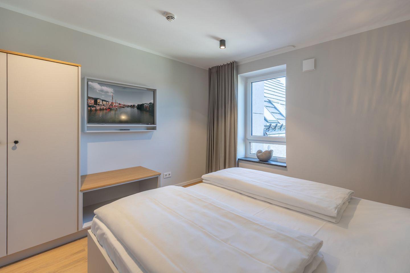 Das Schlafzimmer ist mit einem bequemen Doppelbett und einem weiteren TV ausgestattet.