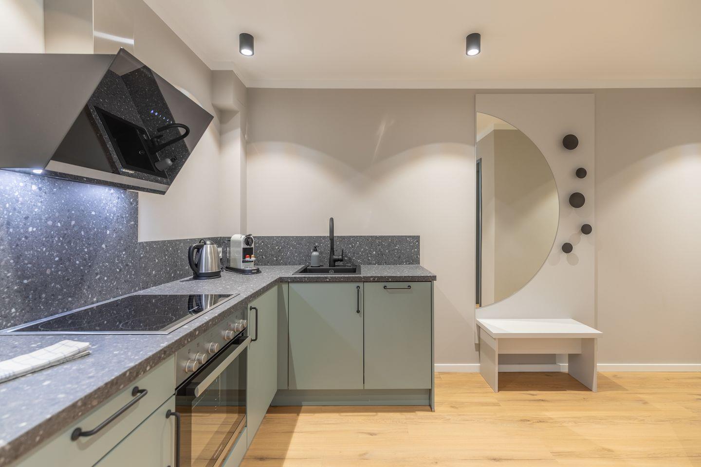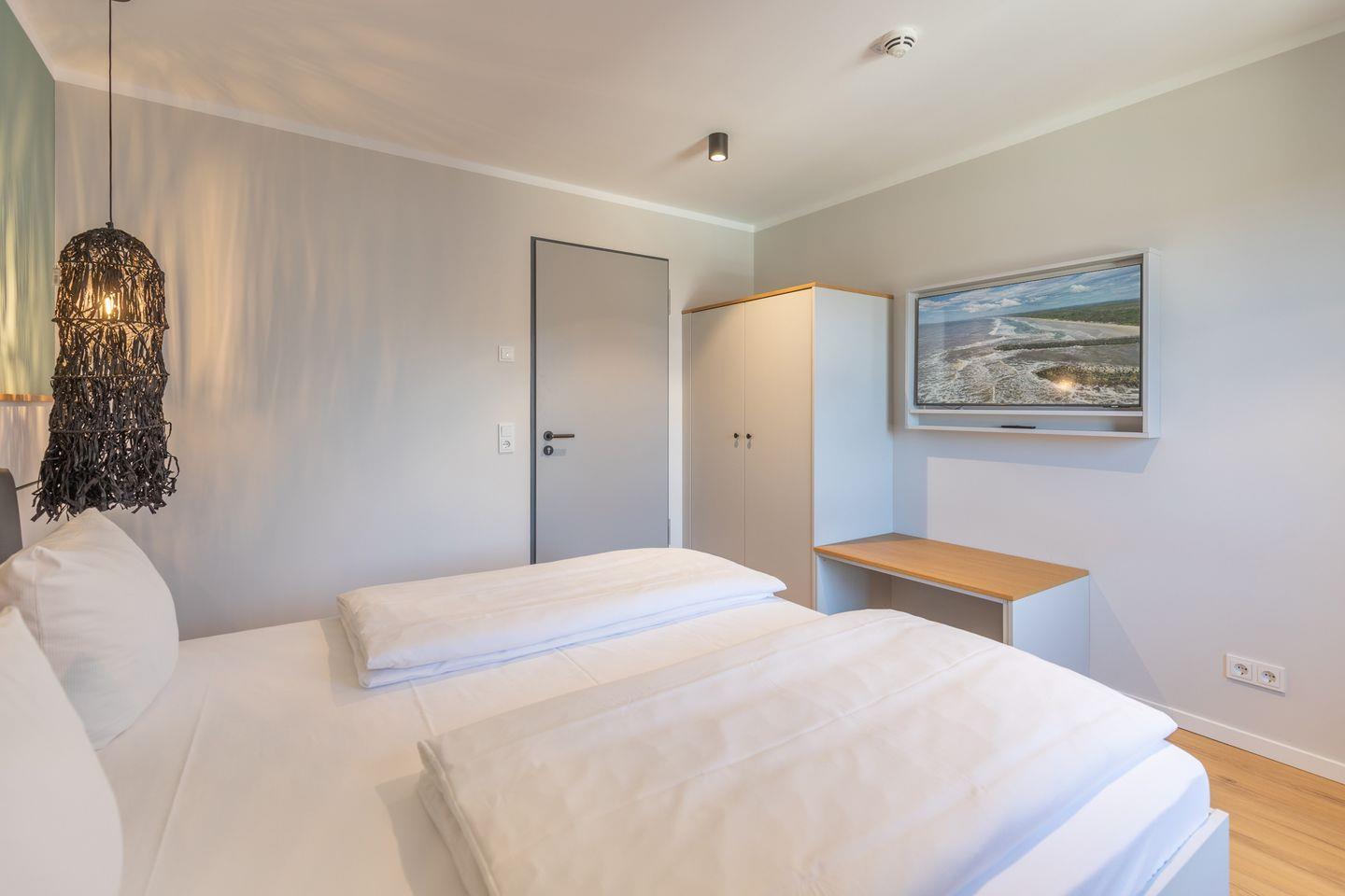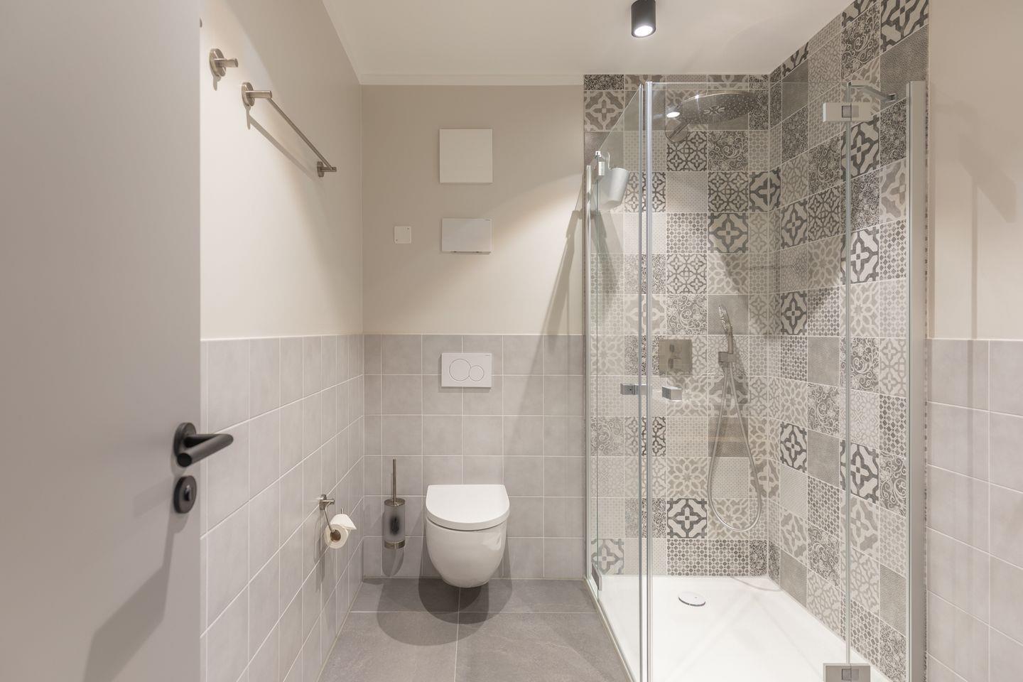 Das Badezimmer verfügt über eine ebenerdige Dusche, WC, Kosmetikspiegel und Föhn. Zudem ist das Apartment komplett mit Fußbodenheizung ausgestattet und bietet im Schlafzimmer Verdunkelungsgardinen für einen entspannten Schlaf. Alle Apartments in den oberen Etagen sind über einen Aufzug erreichbar.