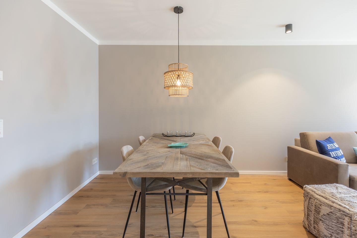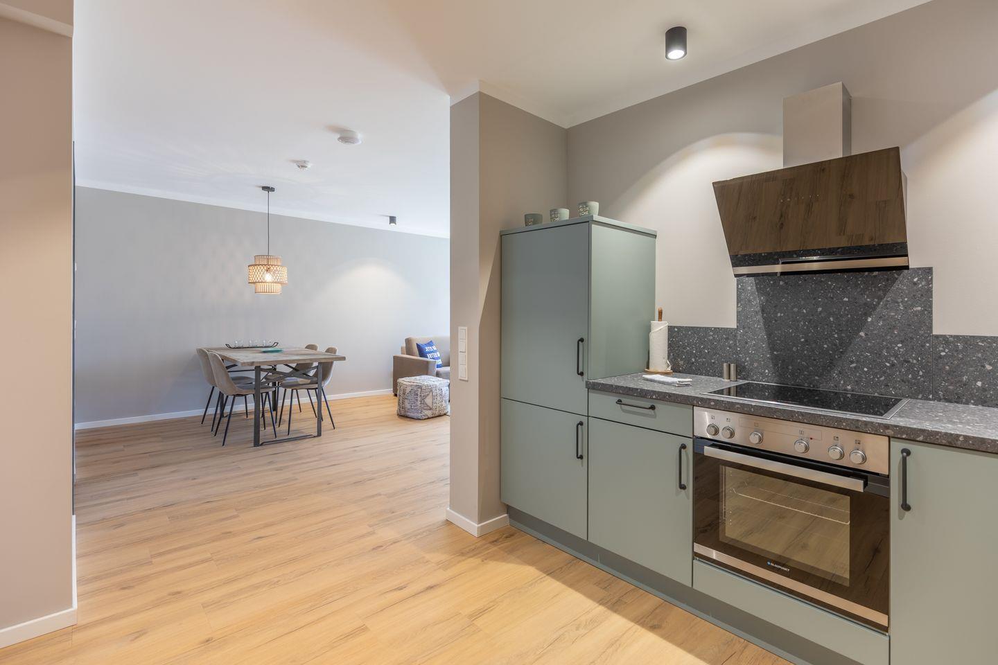 Direkt angeschlossen befindet sich die offene Küche mit Essbereich, Kühlschrank (mit Gefrierfach), Herd, Backofen, Spülmaschine (Tabs inklusive), Kaffeemaschine, Wasserkocher, Besteck, Geschirr plus Töpfe & Pfannen.