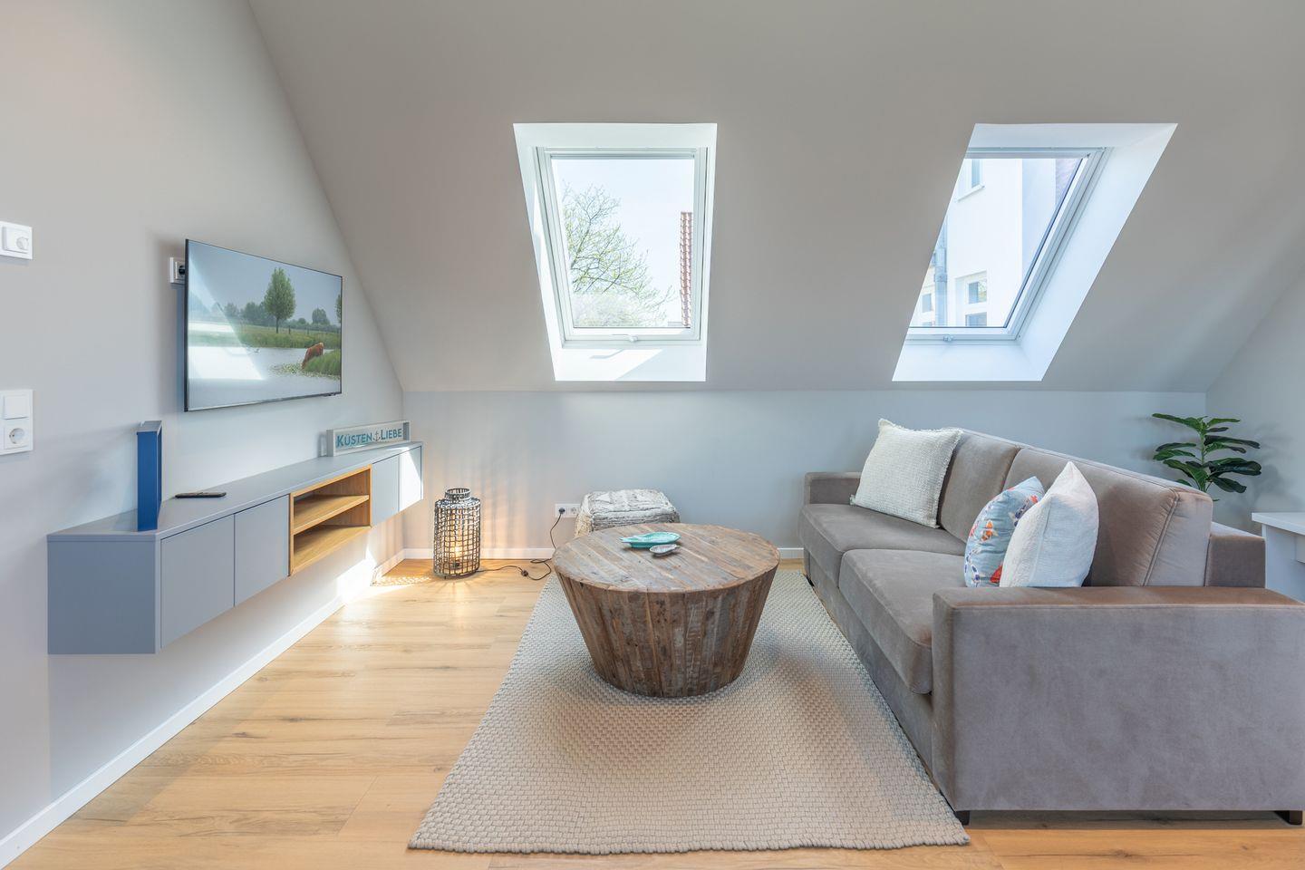 Der gemütliche Wohnbereich des Apartments ist mit einer bequemen Couch und einem Flachbildfernseher ausgestattet.