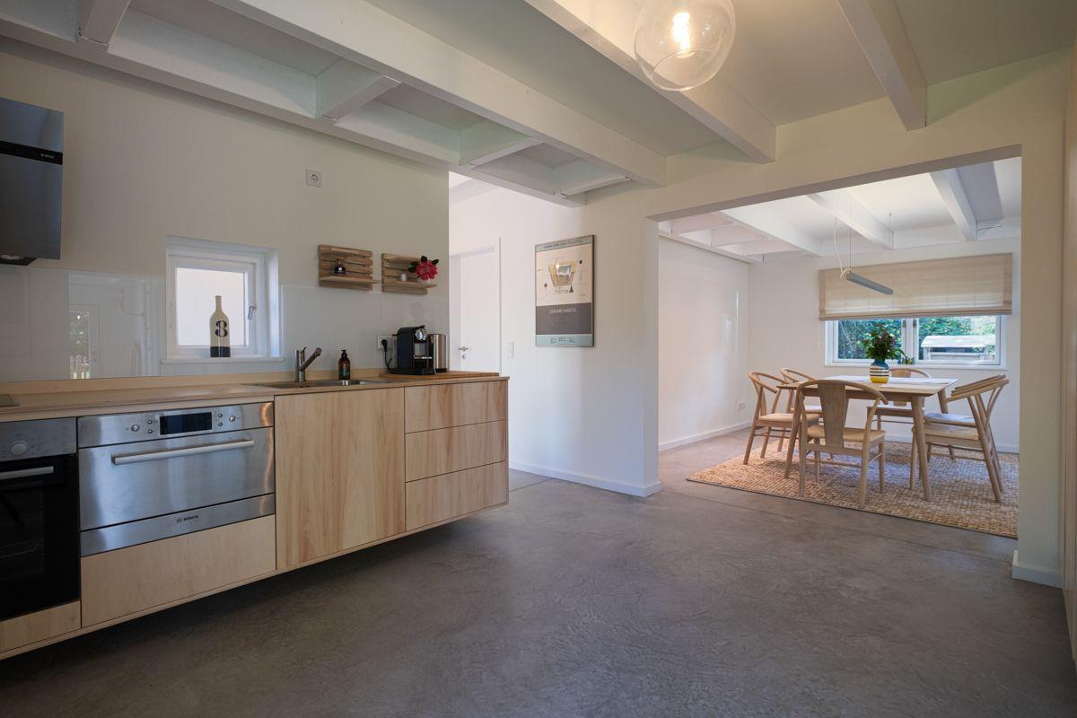 Der offene Grundriss des Ferienhauses schafft eine einladende Atmosphäre. Die Wohnküche ist offen zum Wohnzimmer gestaltet und mit einer umfassenden Auswahl an Küchenutensilien ausgestattet. Hier erwarten Sie einen Herd, Backofen, Kühlschrank mit Gefrierfach, Spülmaschine, Filterkaffeemaschine sowie Espressomaschine, Wasserkocher, Toaster und einen Mixer – perfekt für Selbstversorger, die gerne kochen. Am Esstisch können Sie Ihre Mahlzeiten gemeinsam genießen. Im angrenzenden Wohnzimmer laden ein gemütliches (Schlaf)Sofa sowie ein Schaukelstuhl und ein TV zu entspannten Abenden ein. Zudem stehen Ihnen Bücher zur Verfügung, die für zusätzliche Mußestunden sorgen. Für ein angenehmes Raumklima sorgt Luftreiniger.