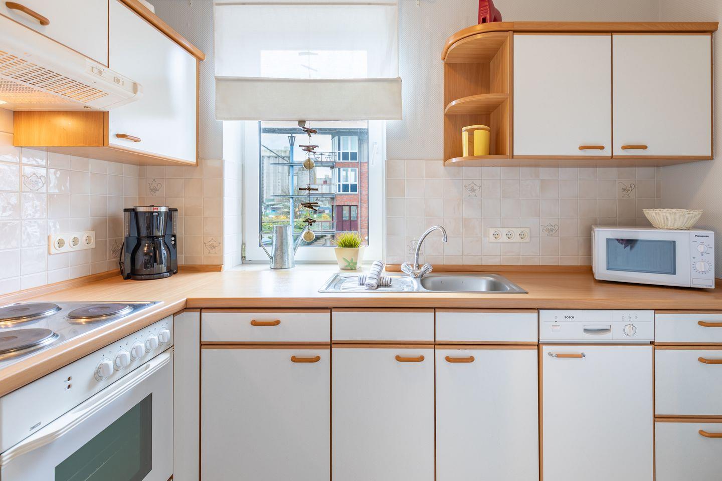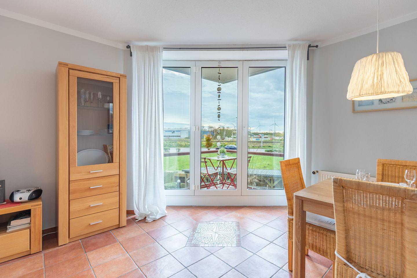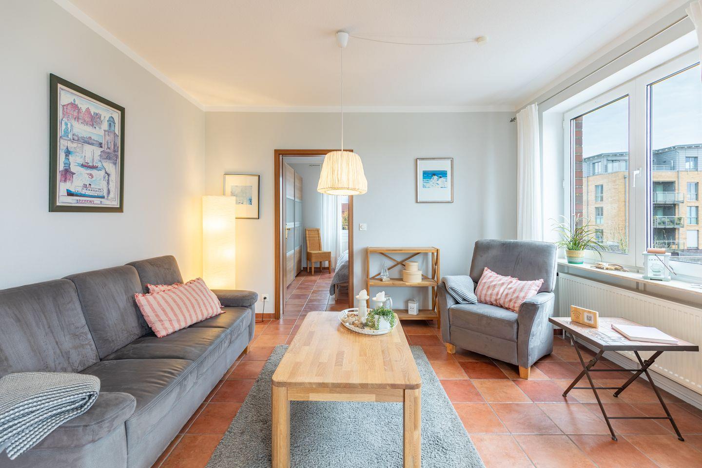 Moderne Ferienwohnung mit Balkon und Hafenblick im Herzen von Husum, ideal für entspannte Tage am Meer.