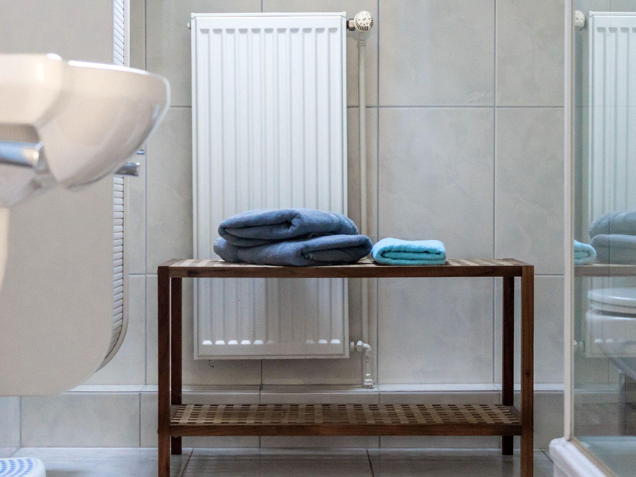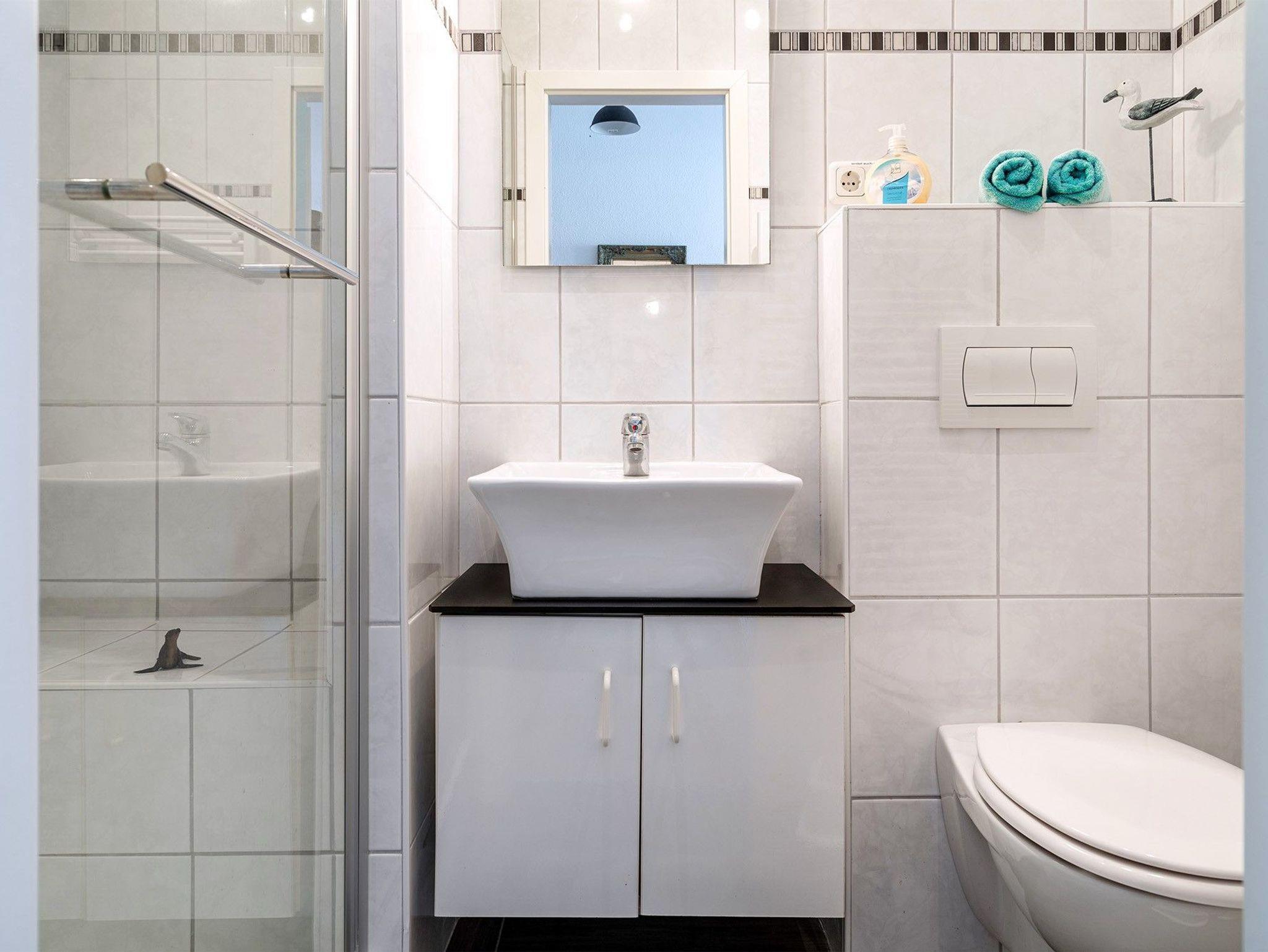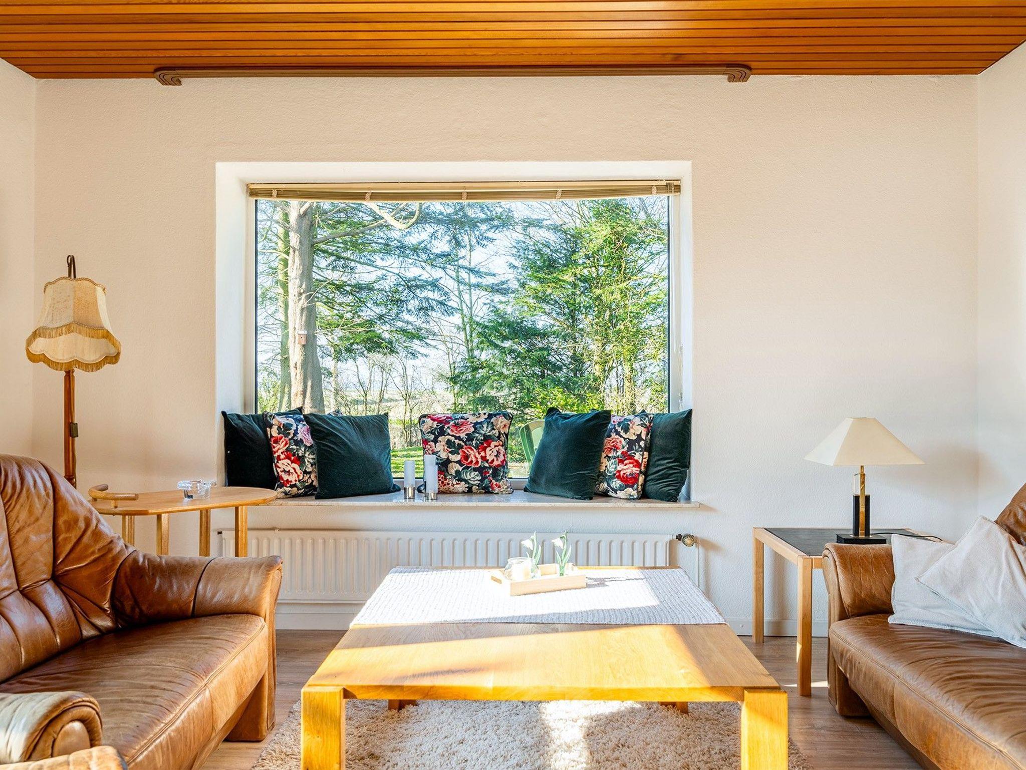 Im Erdgeschoss gibt es ein weiteres Badezimmer mit Dusche, eine geräumige Küche und ein großes Wohnzimmer mit einem Kamin, in dem aber leider kein Feuer mehr brennen darf.