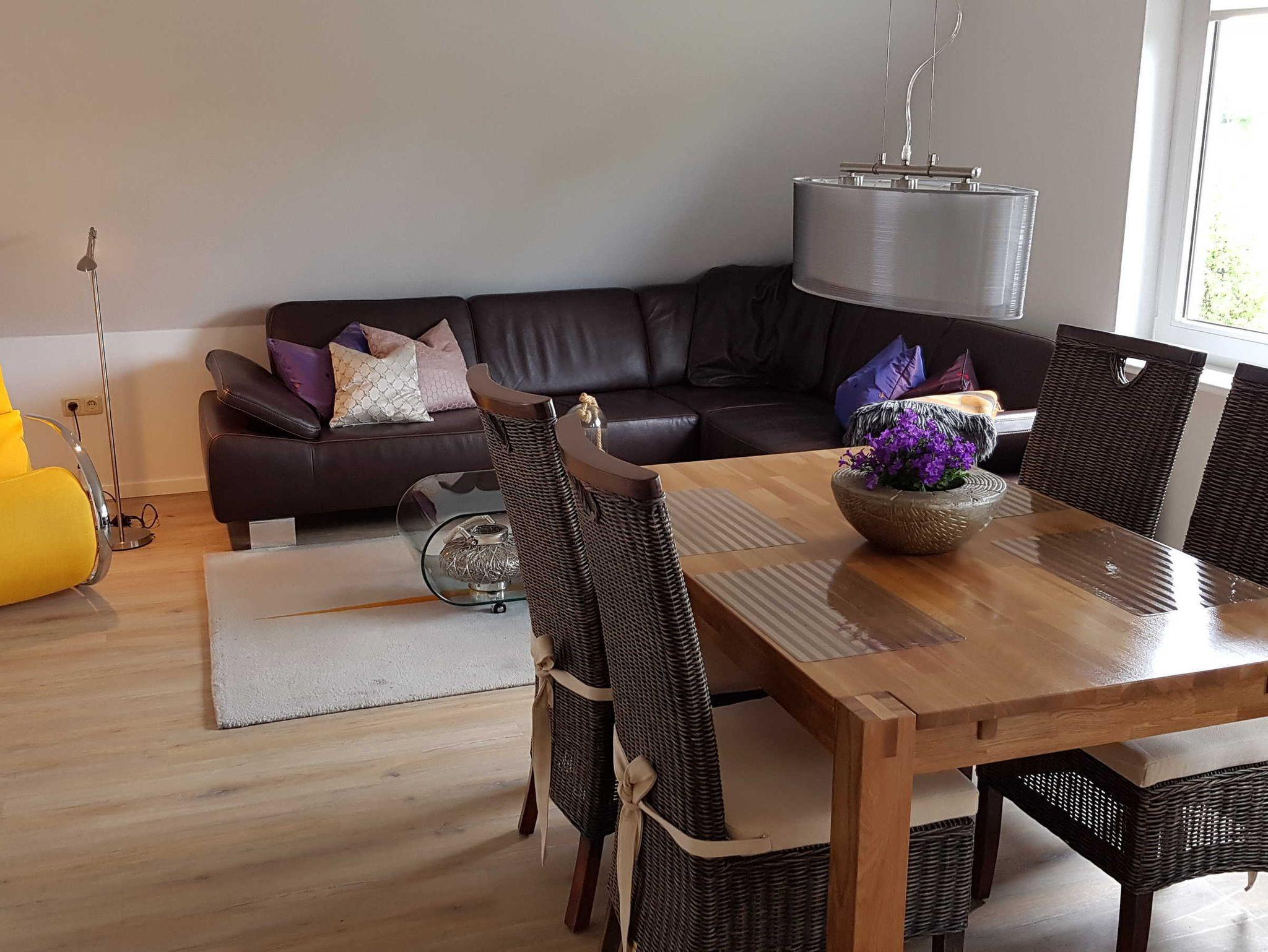 Die moderne, liebevoll eingerichtete Wohnung hat ein Schlafzimmer mit einem 1,60 m breiten Doppelbett und ein weiteres mit zwei 1m breiten Einzelbetten, die sich zusammenschieben lassen; die hochwertigen Matratzen haben sowohl eine weiche und eine harte Seite. Weitere Schlafplätze (z. B. Zustellbetten) sind nicht vorhanden und können auch nicht untergebracht werden. Die Einbauküche mit Spülmaschine und Mikrowelle ist voll ausgestattet und bietet zudem an einem Tisch Platz für zwei Personen. Ein kleiner Gefrierschrank befindet sich im Nebenraum. Das Badezimmer ist ausgestattet mit Dusche und WC. Den Mittelpunkt der Wohnung bildet das großzügige Wohn- & Esszimmer mit gemütlicher Sitzecke und TV; ein schöner Esstisch bietet Platz für vier Personen. Wäschepakete (Handtücher& Bettwäsche) können gegen Aufpreis hinzugebucht werden.