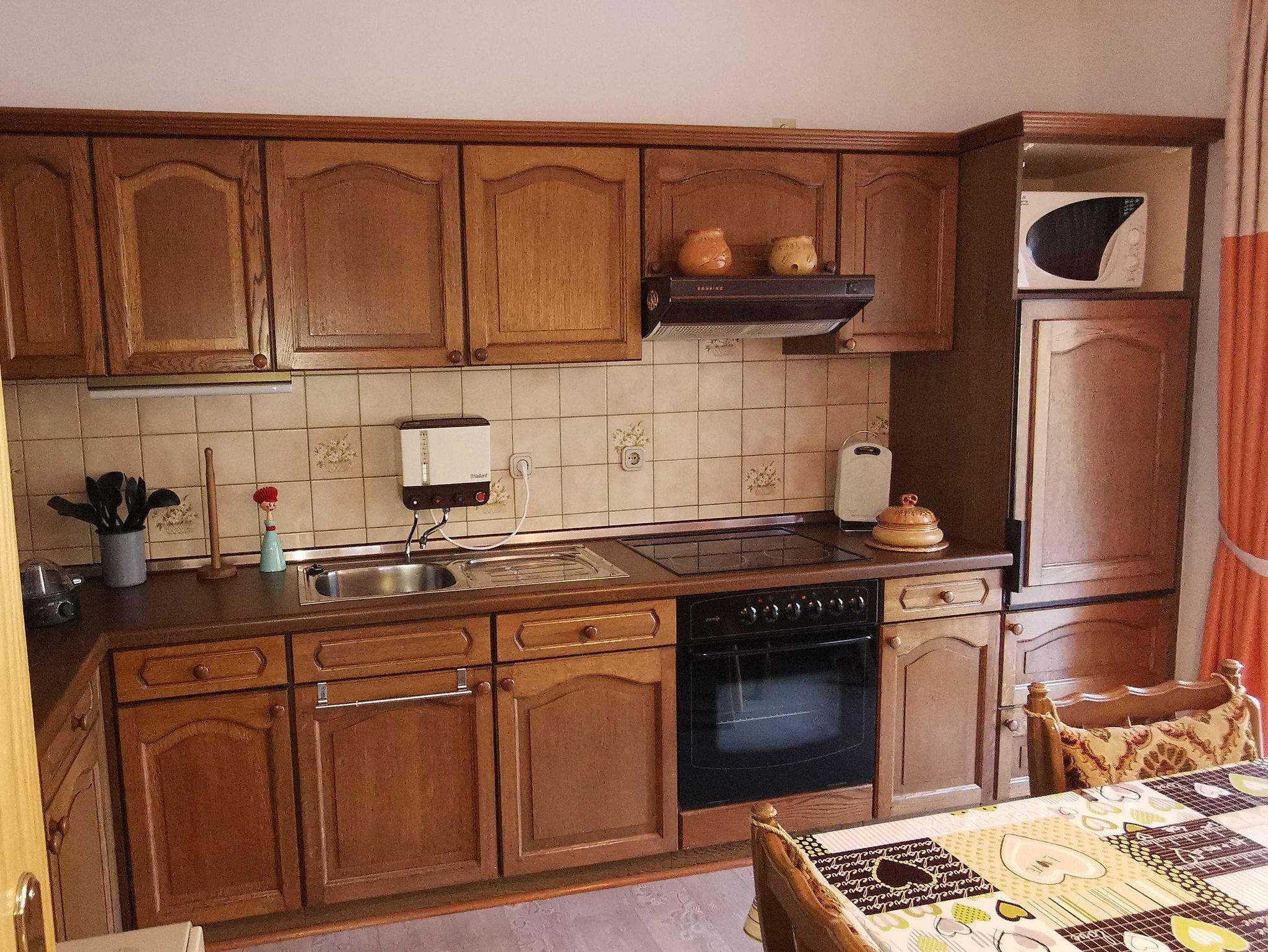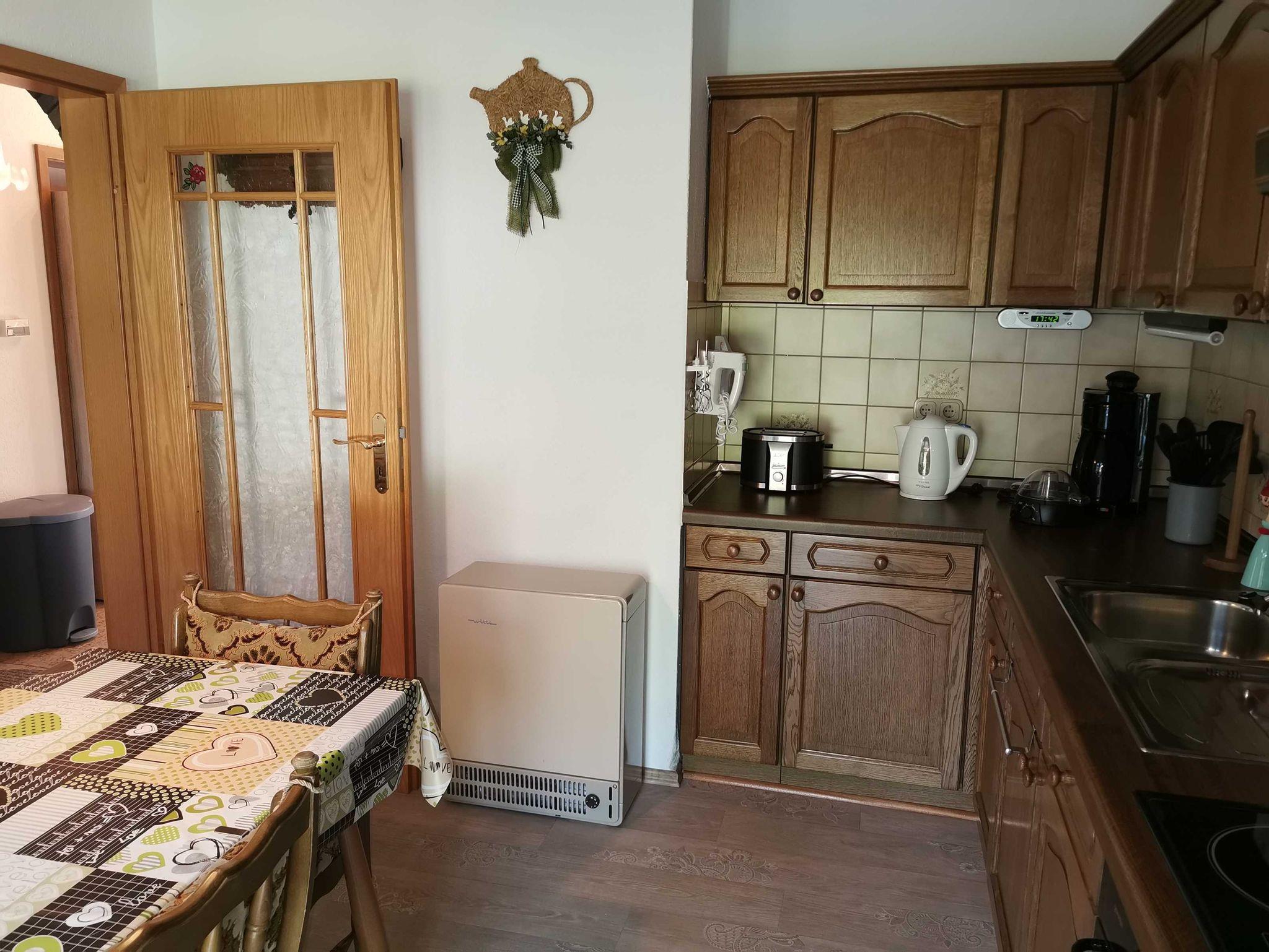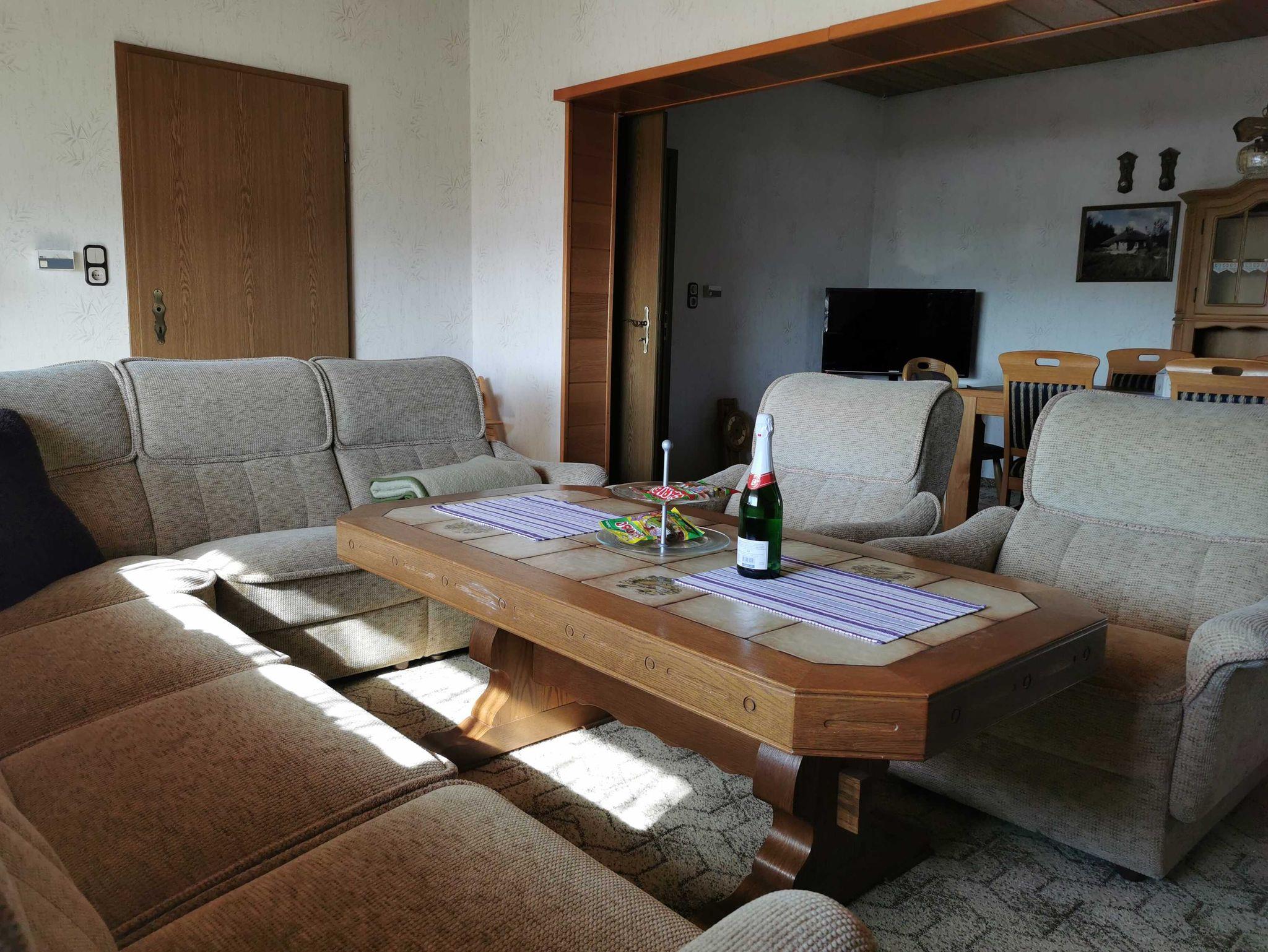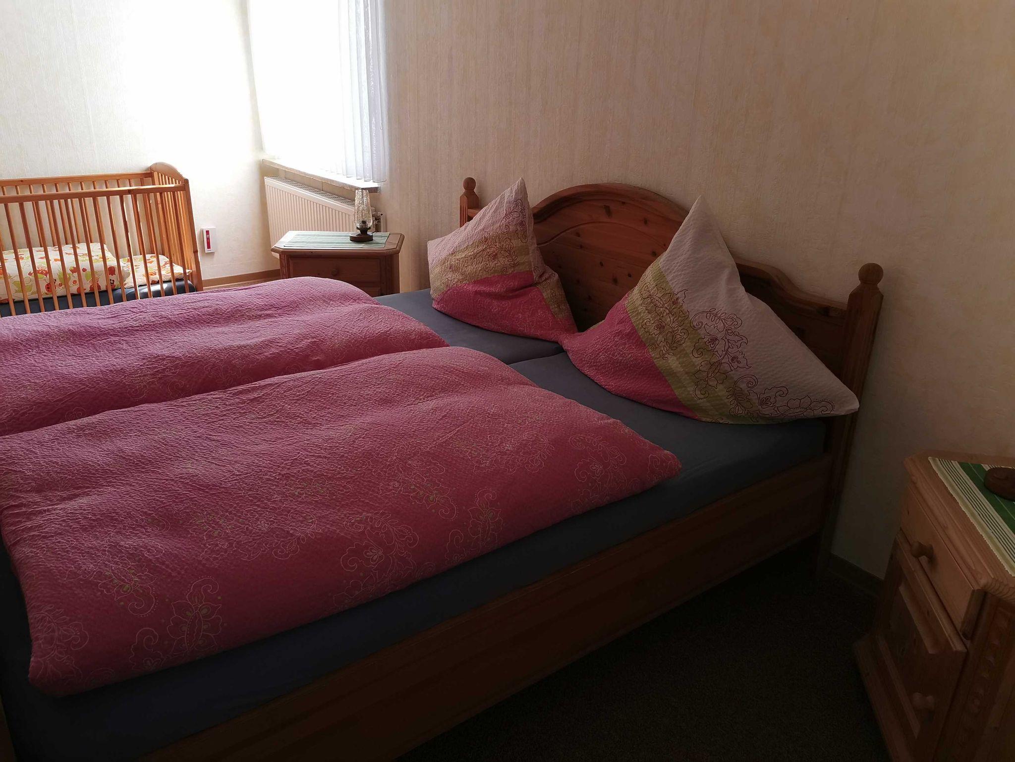 Das ca. 90 qm große Ferienhaus (Anbau) befindet sich im Erd- und Obergeschoss. Durch den separaten Eingang betreten Sie den Vorflur mit Garderobe. Links befindet sich das Schlafzimmer 1 mit Doppelbett (180x200 cm) und Kleiderschrank, geradeaus ist das WC. Weiter links befindet sich die vollausgestattete Küche u.a. mit Cerankochfeld, Backofen, Mikrowelle, Kaffeemaschine, Wasserkocher und Toaster mit Essecke und Terrassenzugang auf die überdachte Ostterrasse mit Gartenmöbeln. Rechts vom Flur aus kommen Sie in das große Wohnzimmer mit weiterer Essecke, Ecksofa und Flachbildfernseher. Über einen Treppenaufgang im Flur erreichen Sie das Obergeschoss. Links befindet sich das separate WC und das Schlafzimmer 2 mit Einzelbett (120x200 cm) und Kleiderschrank. Vom Treppenaufgang rechts befindet sich das Badezimmer mit Dusche und Badewanne sowie Waschtisch und Waschmaschine inkl. Handtücher, das Schlafzimmer 3 mit Einzelbett (90x200 cm) und Kommode und das Schlafzimmer 4 mit Doppelbett (180x200 cm) und Kleiderschrank. In allen Schlafräumen besteht räumlich die Möglichkeit ein Kinderbett aufzustellen.