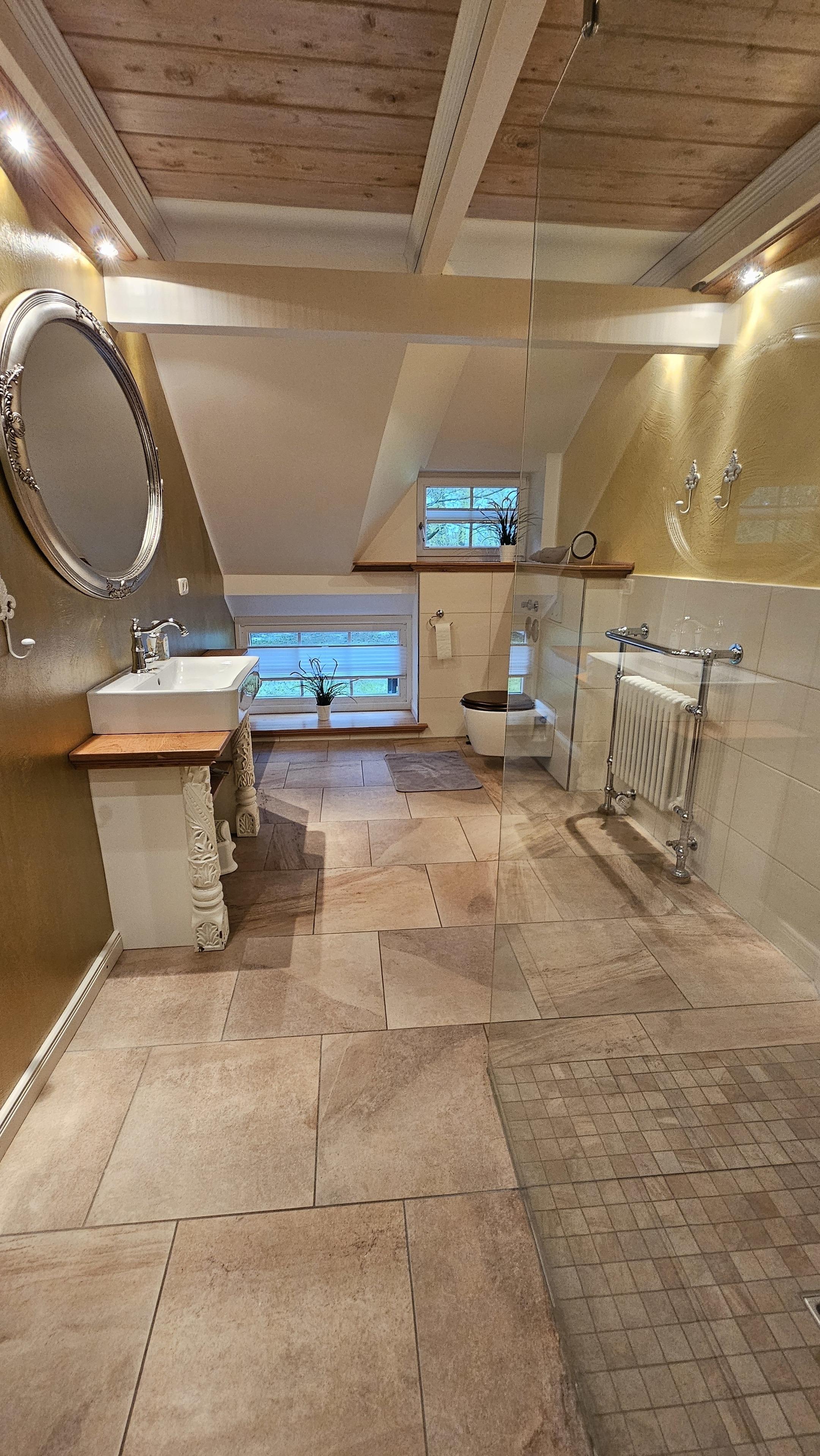 Das Badezimmer mit bodengleicher Dusche und Tageslicht ist ein absolutes Wohlfühlbad. Die Terrasse und der Garten laden zum Entspannen ein. Waschmaschine und Trockner stehen im separat zugänglichen Hauswirtschaftsraum selbstverständlich zur Verfügung.