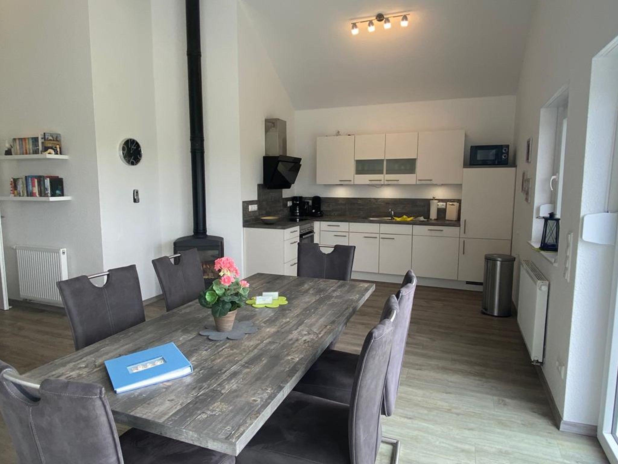 Herzlich Willkommen im Haus Weitblick. Es erwartet Sie ein helles, modern eingerichtetes Ferienhaus. Es gibt ein Schlafzimmer mit großem Doppelbett., eines mit Etagenbett und Schreibtisch. Weiter geht es zur Spielempore mit einem zusätzlichen Einzelbett. (Die steile Treppe zu der Empore ist nicht geeignet für Kleinkinder). Das Badezimmer hat eine ebenerdige Dusche. Der große Wohn/Essbereich ist das Herzstück des Hauses. Entspannen Sie vor dem Kaminofen. Die Küche hat alles an Ausstattung, was man zum entspannten Kochen benötigt. Genießen Sie den Weitblick schon beim Frühstück. Am Haus selbst ist Platz für zwei Fahrzeuge. Der Garten ist komplett eingezäunt und erlaubt Ihnen, den Kindern und ihren Hunden Toben und Entspannen.