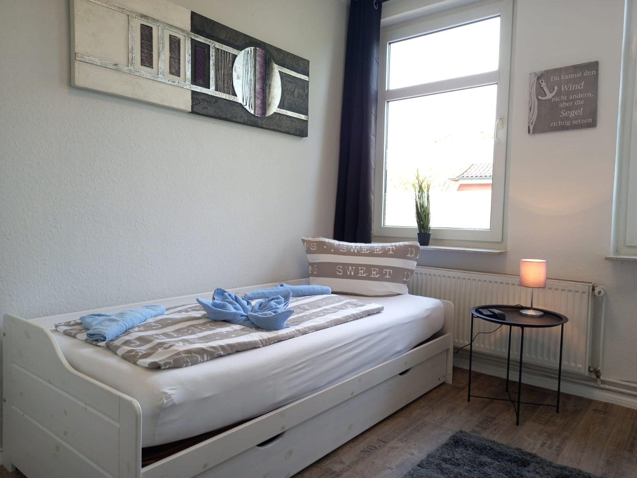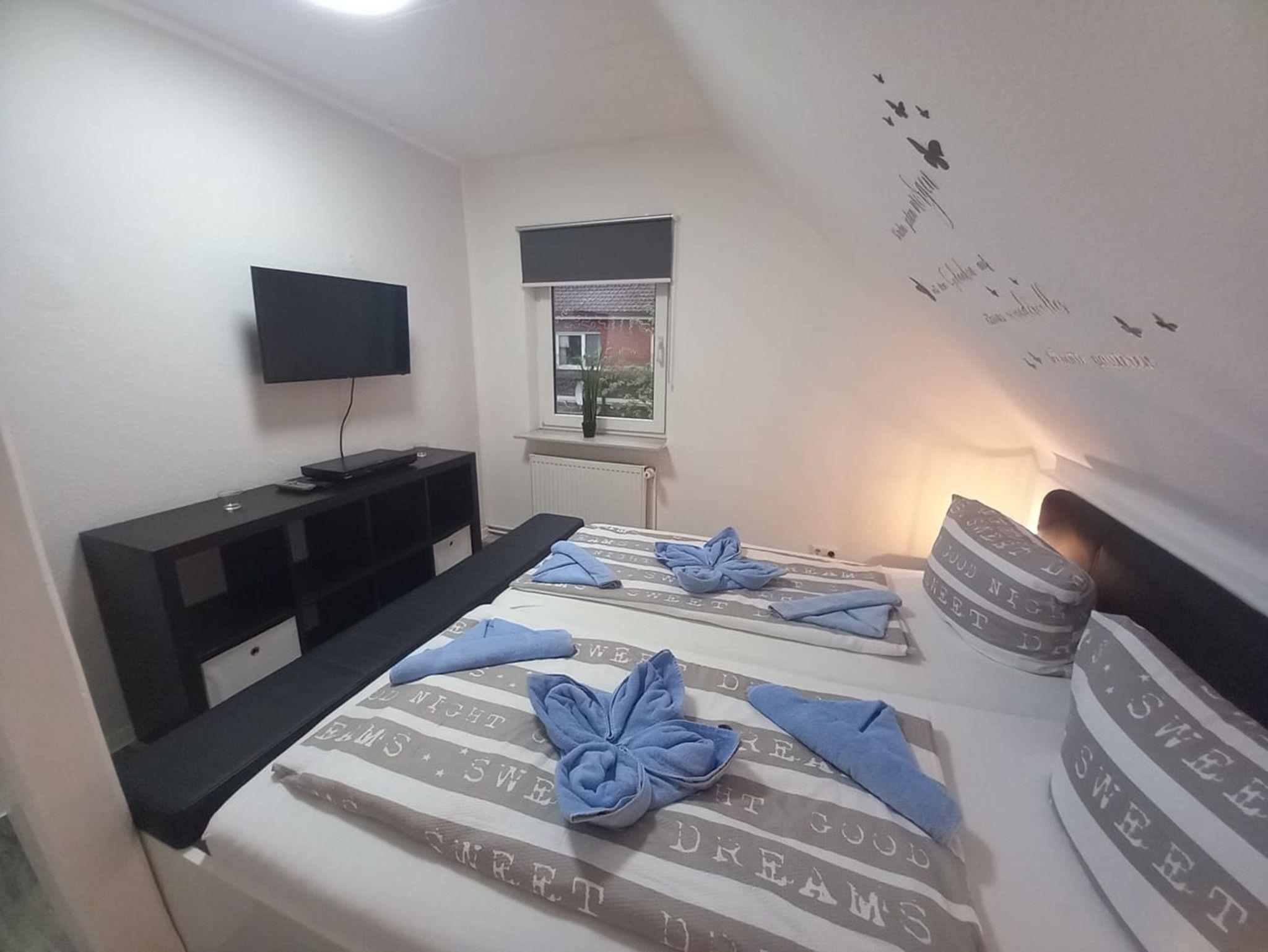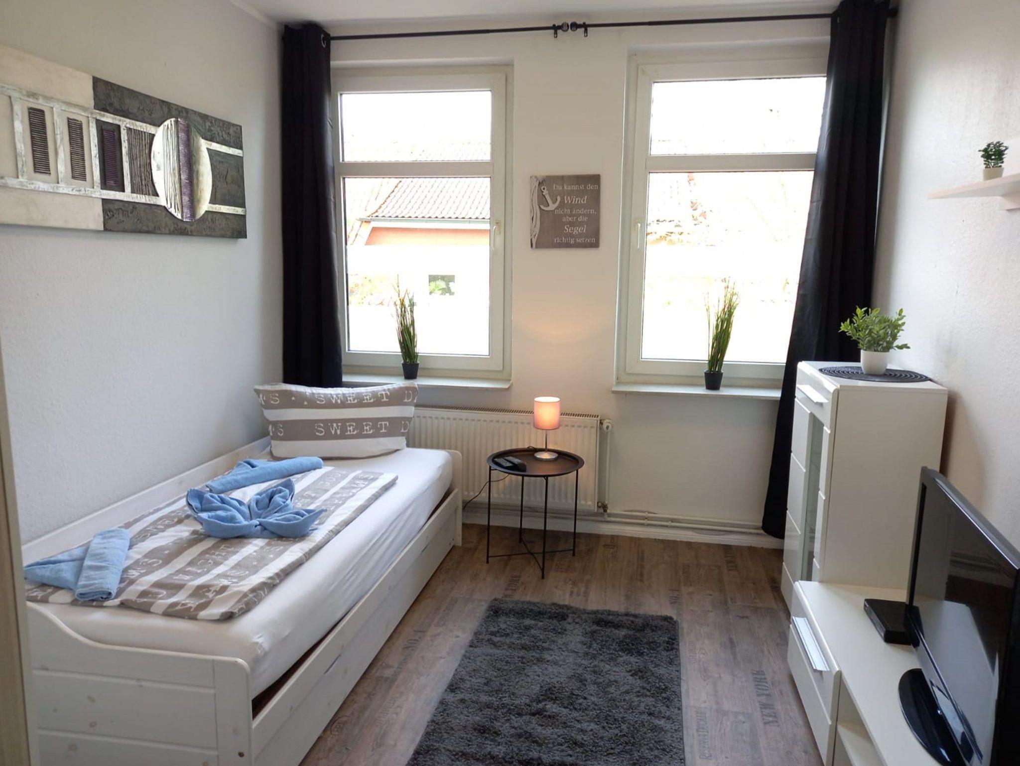 Hier fühlt man sich sofort wohl. Mit viel Liebe zum Detail haben die Eigentümer diese Ferienwohnung in einem Anfang des Jahrhunderts erbauten Einfamilienhaus eingerichtet. Eine geräumige Diele mit Holztreppe geht hinauf in den ersten Stock zur Ferienwohnung. Oben angekommen führen von der Wohndiele - mit Schreibtisch ausgtestattet - alle gemütlichen Räume ab: Die voll ausgestattete Küche mit Essbereich, 2 schicke Schlafräume - einer mit Doppelbett und einer mit 2 Einzelbetten und zusätzlichen TV-Geräten. Für die Raucher halten wir ein separates Zimmer bereit; hier besteht die Möglichkeit, bei Kicker und Dart zu entspannen. Im Außenbereich können sie die Terrasse mit Grillmöglichkeit und Liegewiese gerne nutzen.