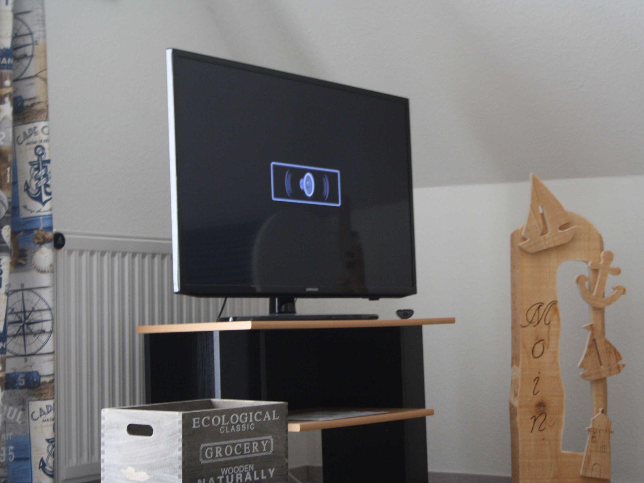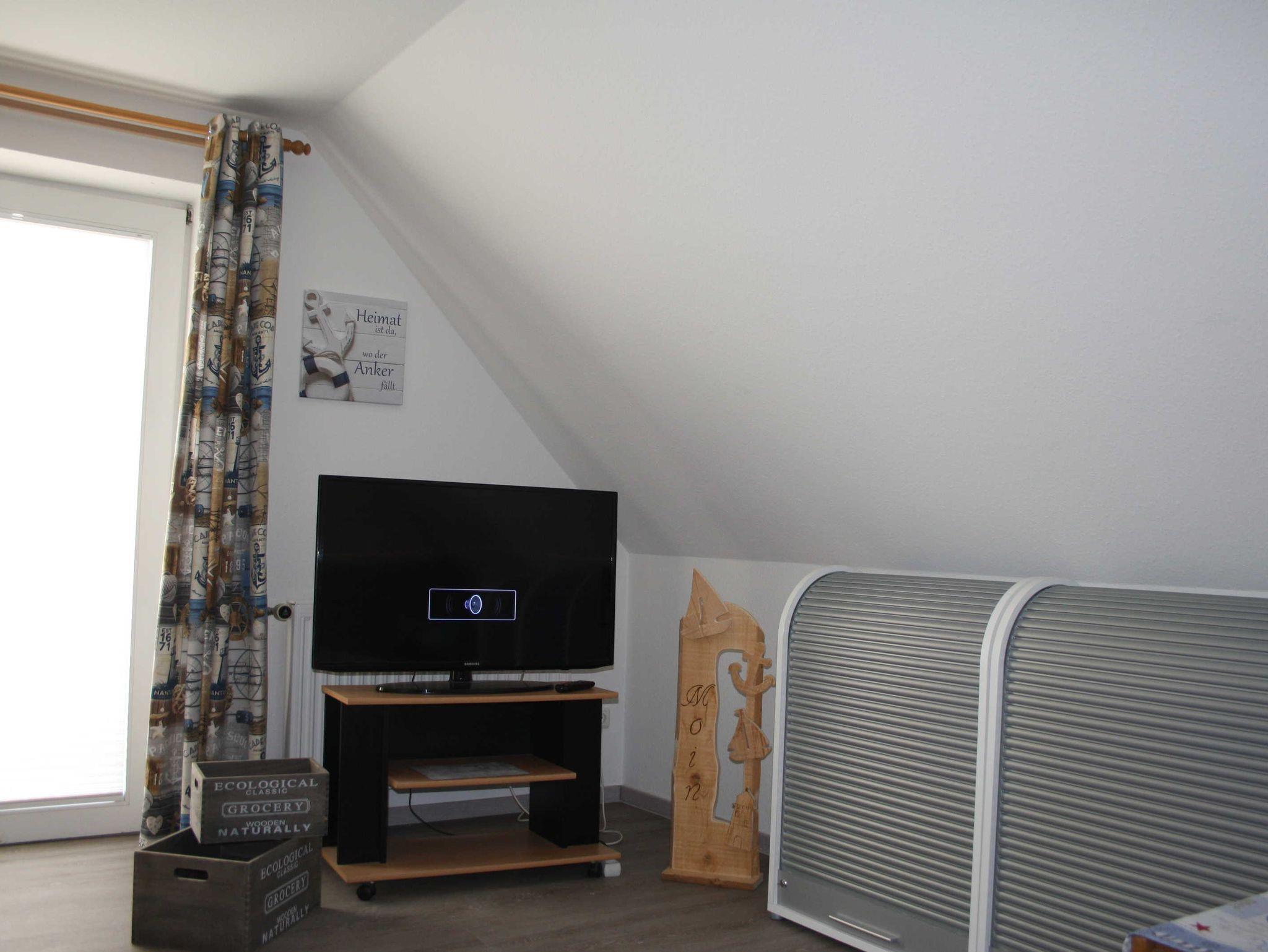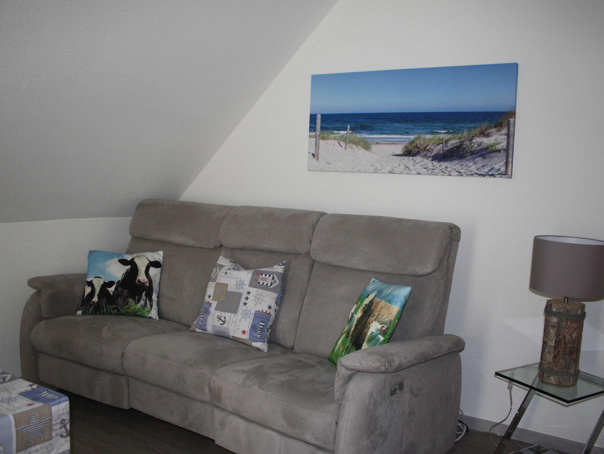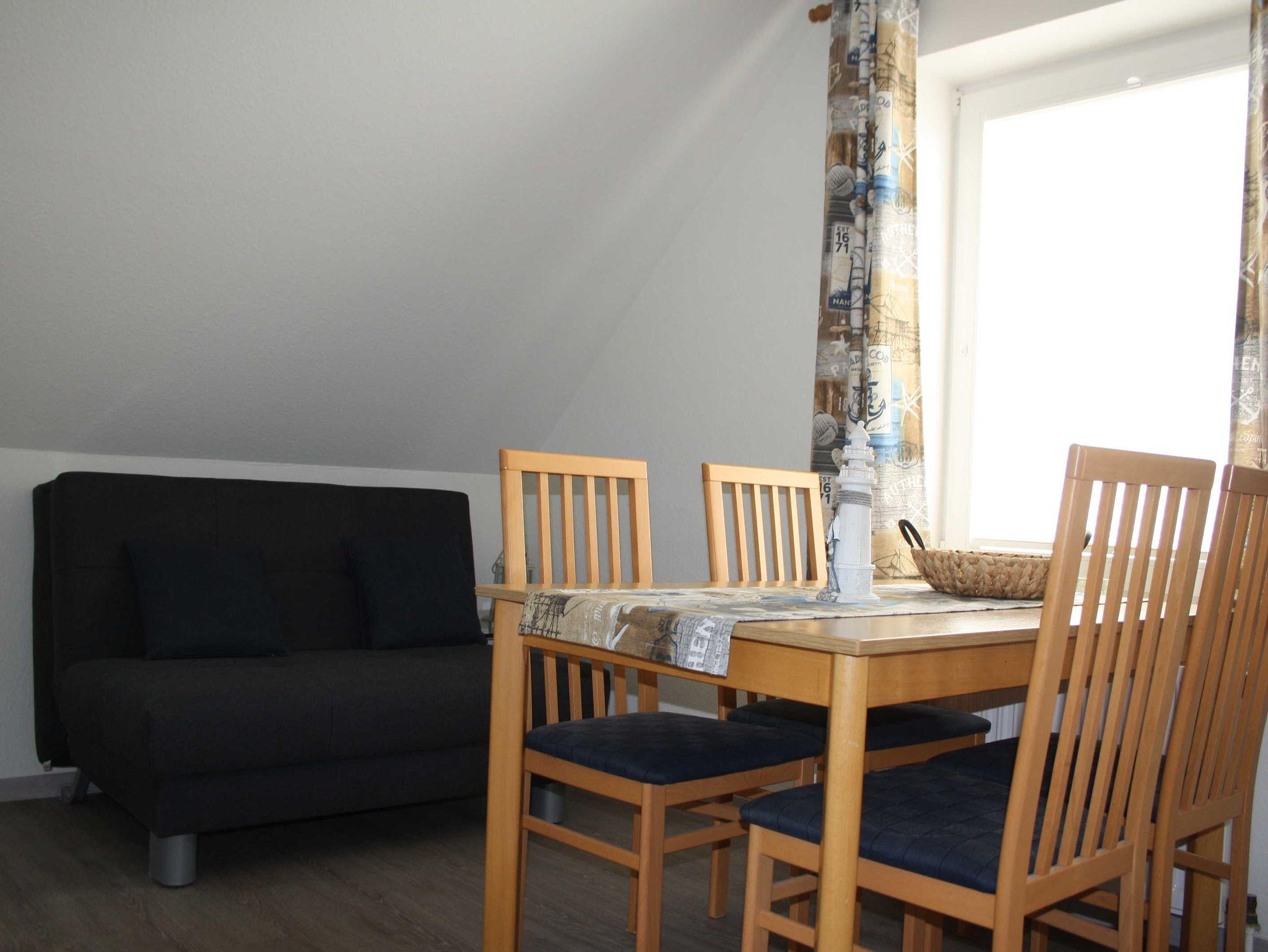 Wohn/Eßzimmer mit neuer Küche, Hochstuhl, gemütliches TV-Sofa, SAT-TV, eine Ausziehcouch ist bei Bedarf im Wohnbereich.