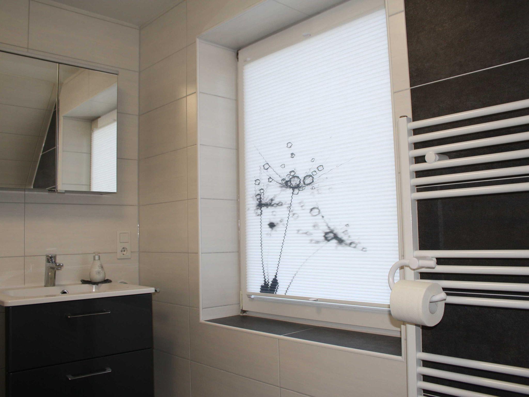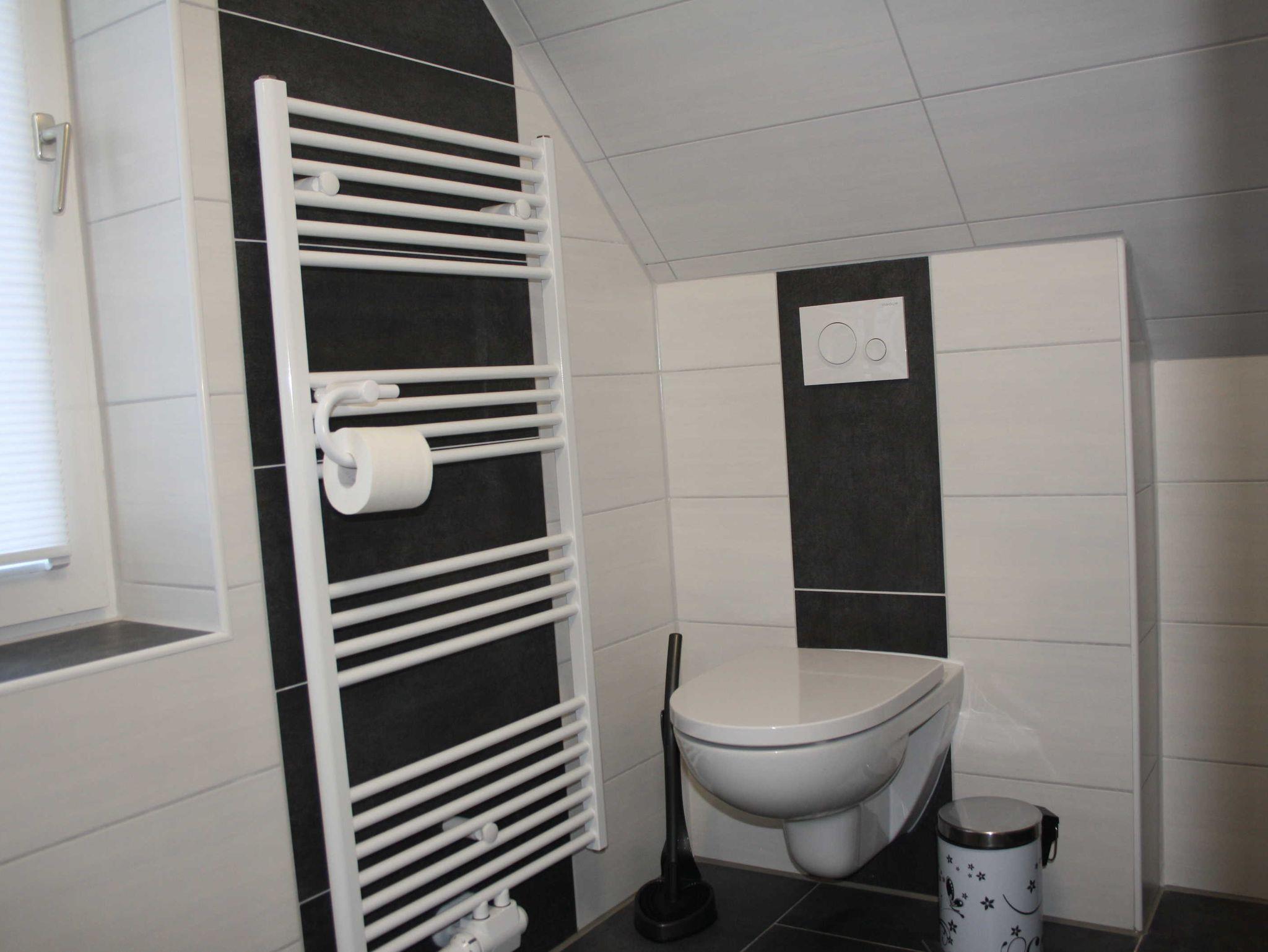 Schlafzimmer mit Doppelbett 2x90x200cm ohne Fußteil, neues Bad mit bodengleicher Dusche, Hängetoilette, Waschbecken mit Unter- und Spiegelschrank, Handtuchheizkörper und Fußbodenerwärmung.