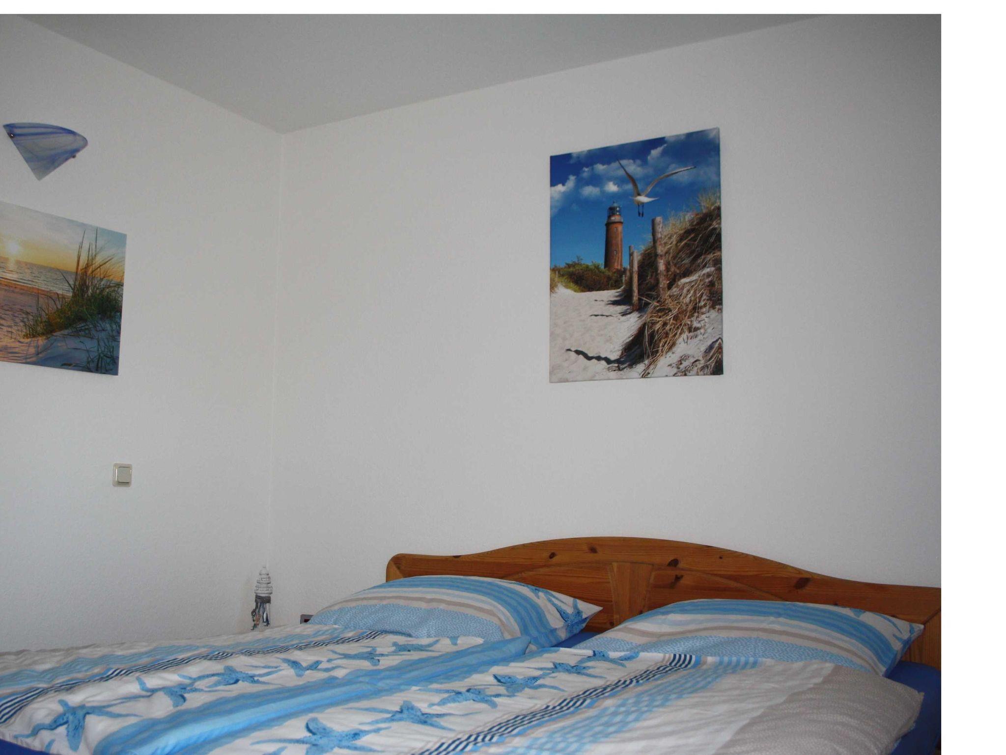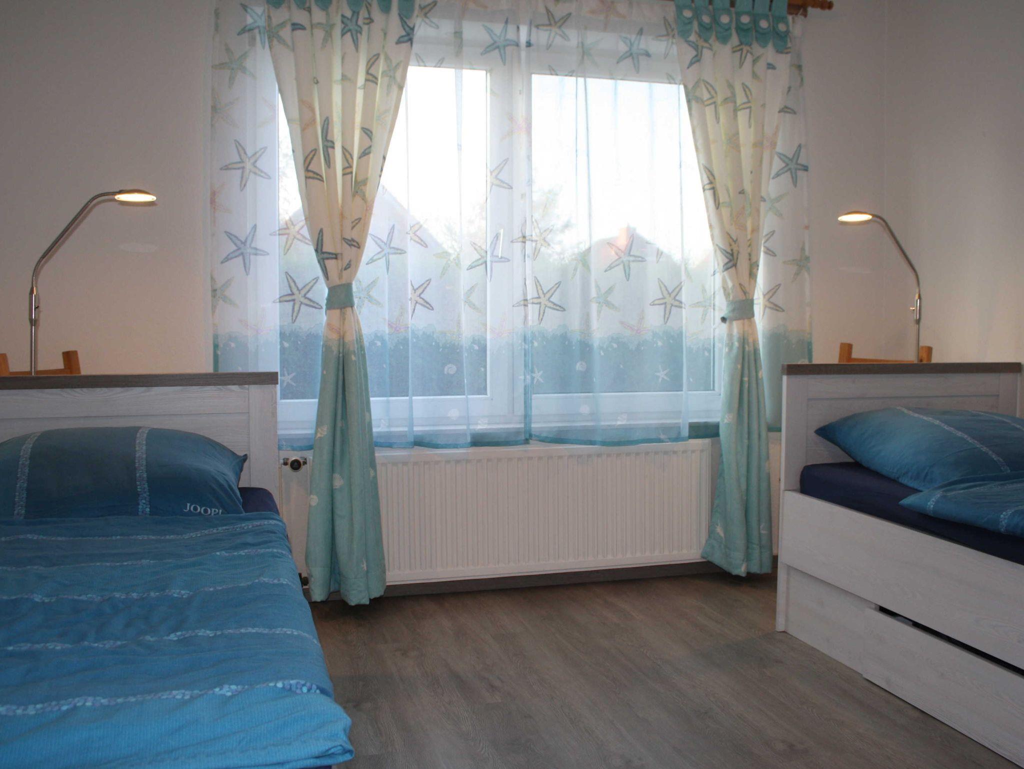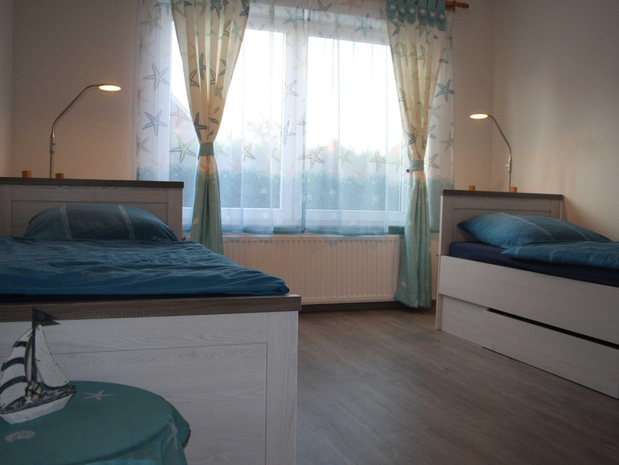 Ein Schlafzimmer mit Doppelbett 2x90x200cm ohne Fußteil, ein Schlafzimmer mit getrennten Betten 2x90x200cm mit Fußteil und ein stabiles Klappbett, was bei Bedarf dazu gestellt werden kann.