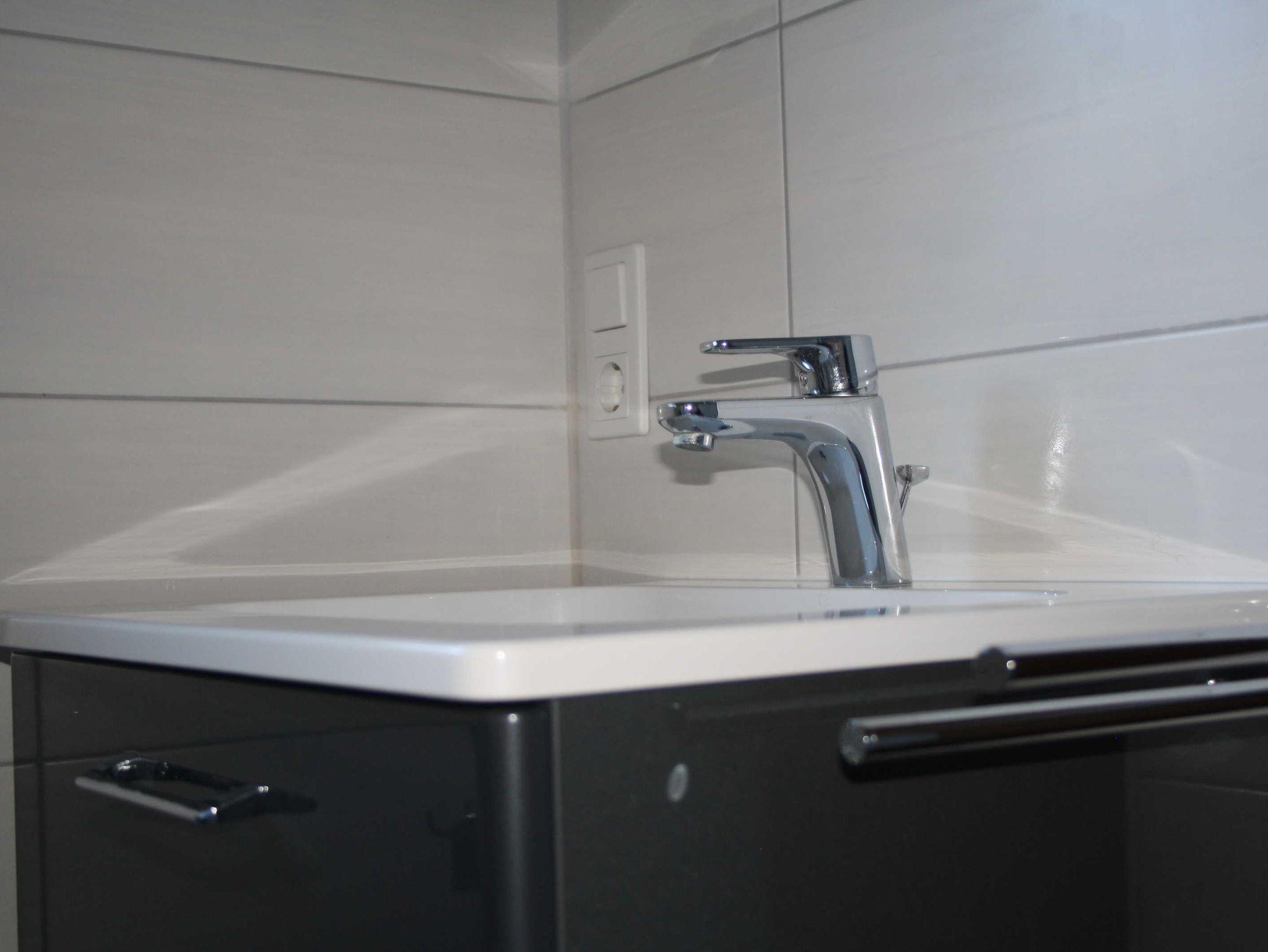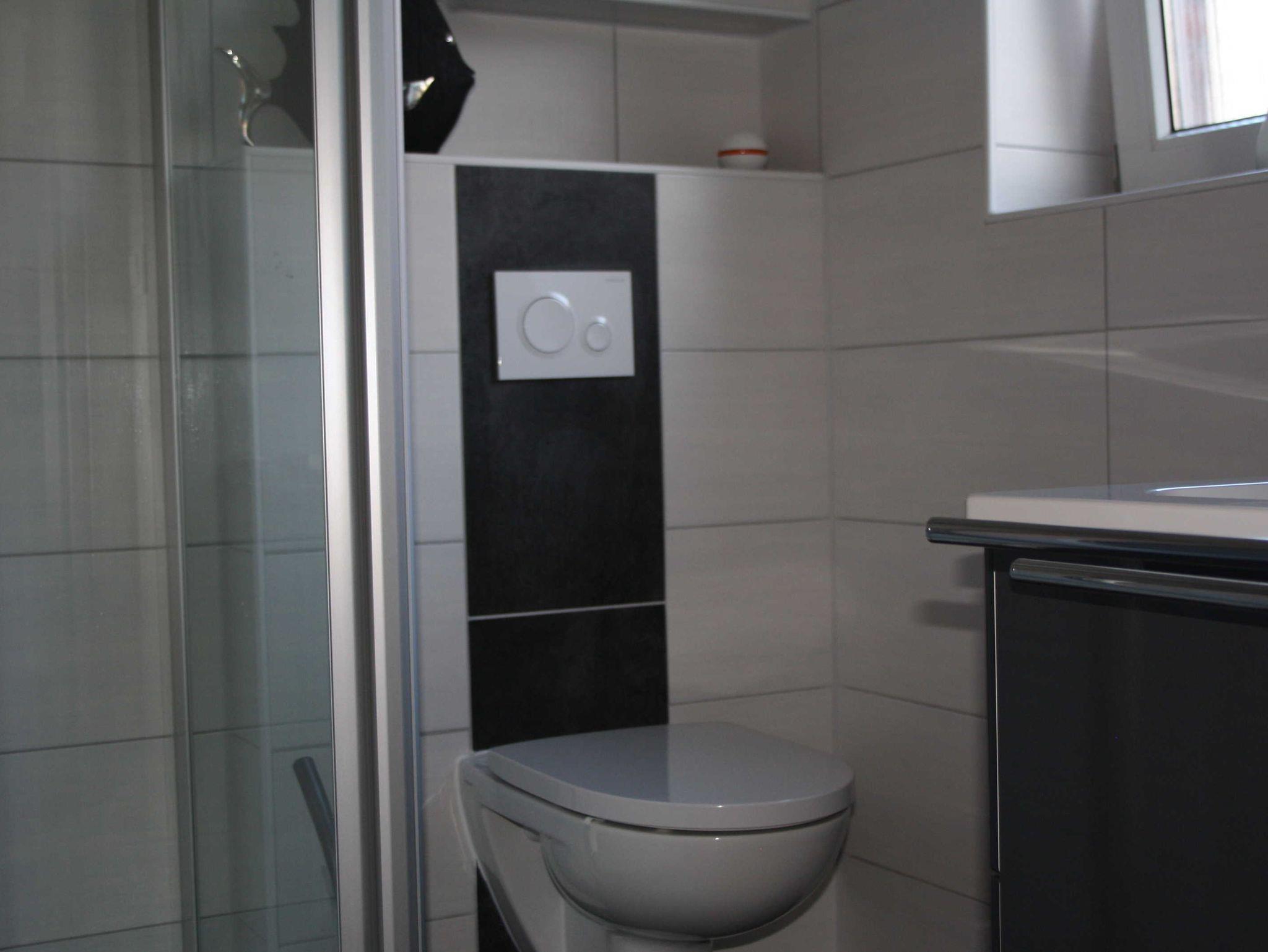 Neues Bad mit bodengleicher Dusche, hängende Toilette, Waschbecken mit Unterschrank und Spiegelschrank, Handtuchheizkörper und Fußbodenerwärmung.