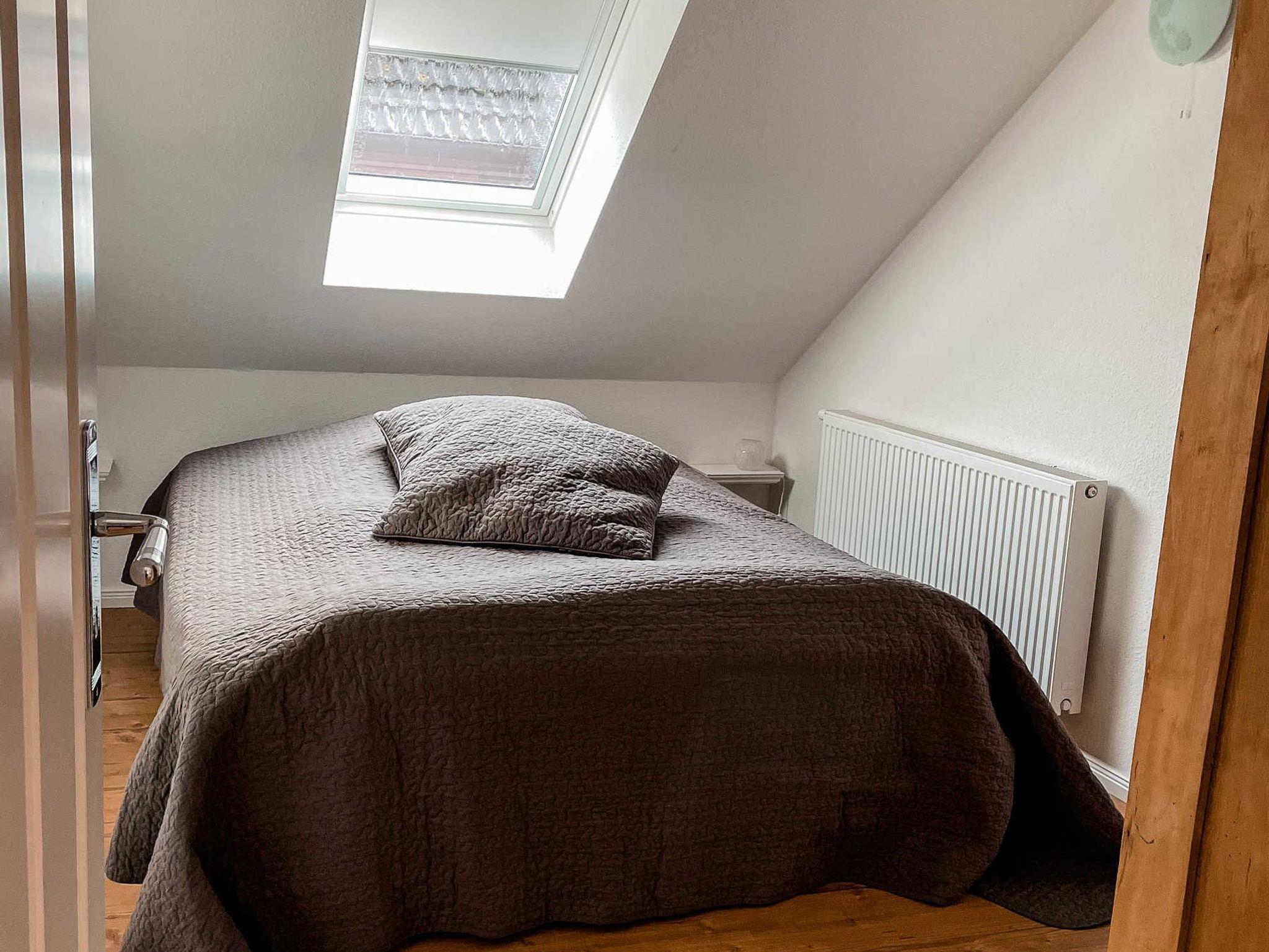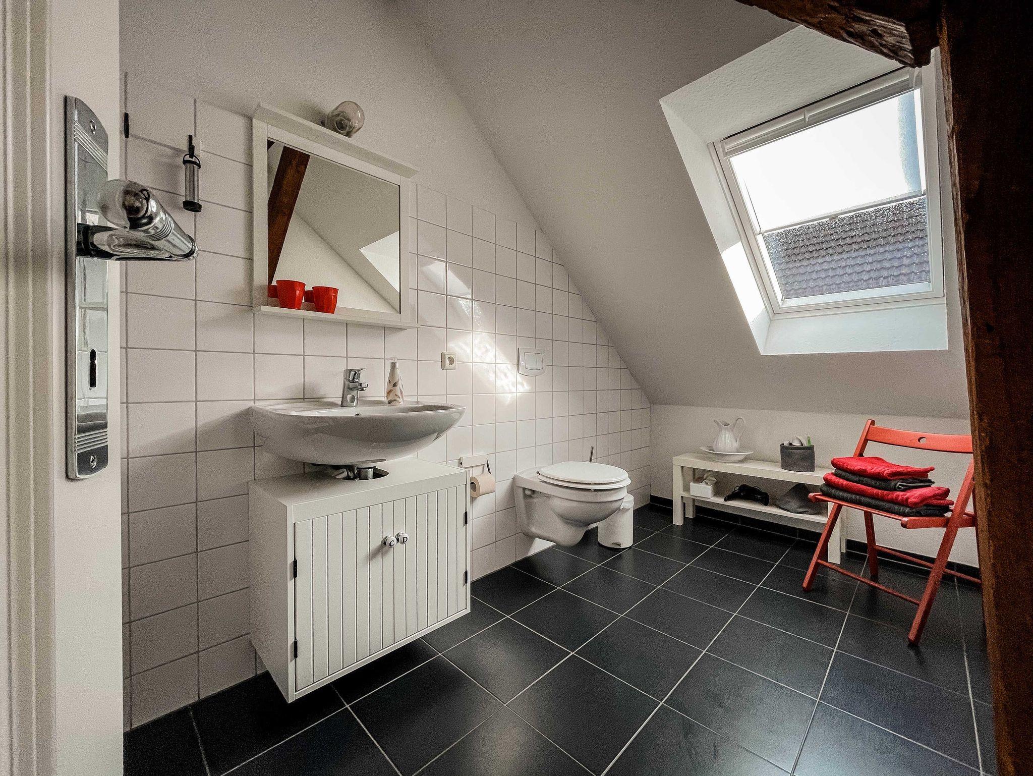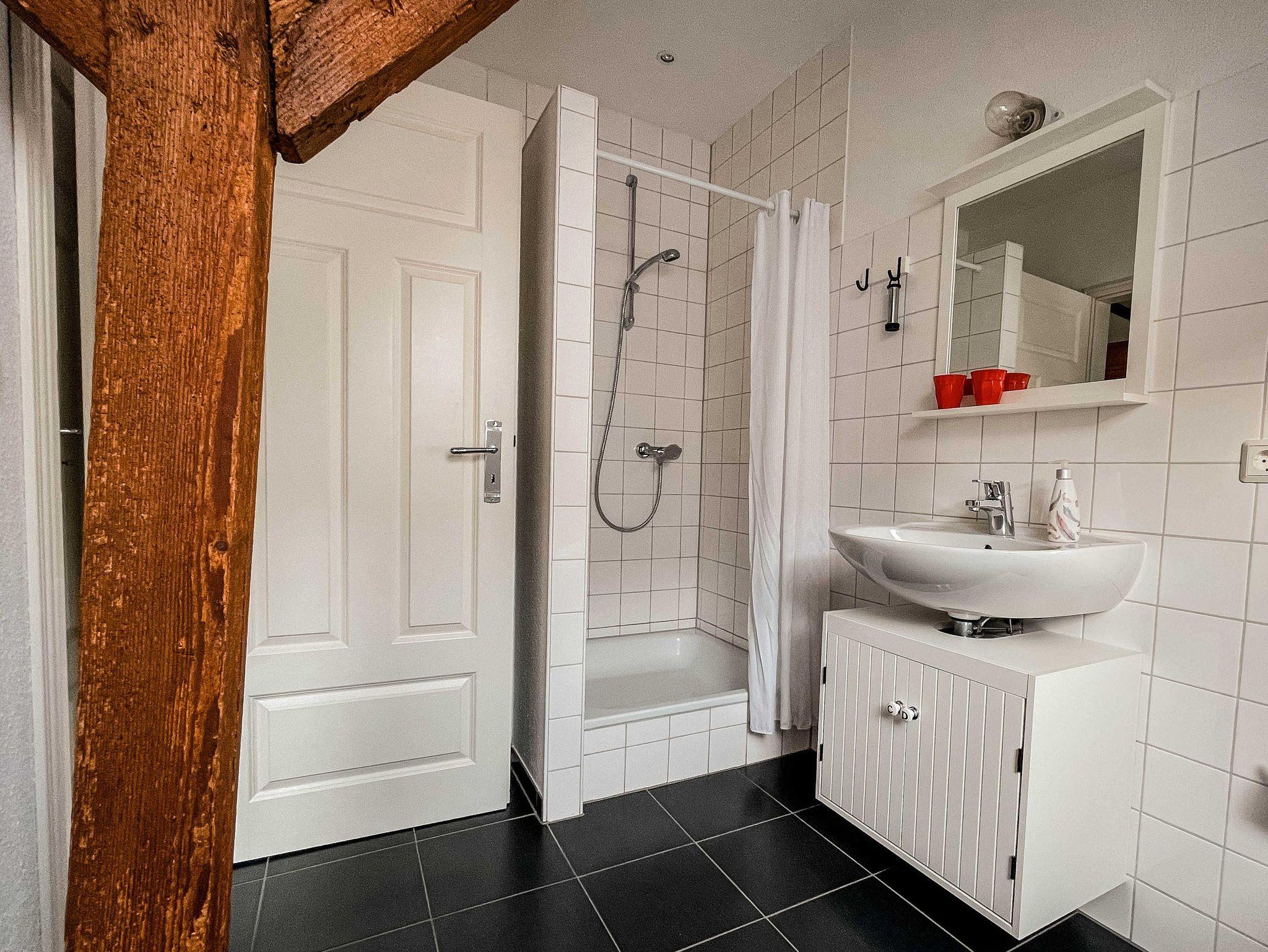 Die Nichtraucherwohnung ist 38qm groß, hat einen 6qm Balkon in Südlage und ist bis in die Dachspitze offen ausgebaut. Die Wohnung ist geeignet für max. zwei Erwachsene Personen und einem Kind bis zum Alter von drei Jahren. Das alte Balken- und Mauerwerk ist in Sicht und gibt der Wohnung in dem denkmalgeschützten Gebäude eine besondere Atmosphäre. Sie besteht aus Wohn-/Essraum, Schlafzimmer, Bad mit Dusche und WC. Küche mit Geschirrspüler, Kühlschrank, Backofen, Herd, Mikrowelle.