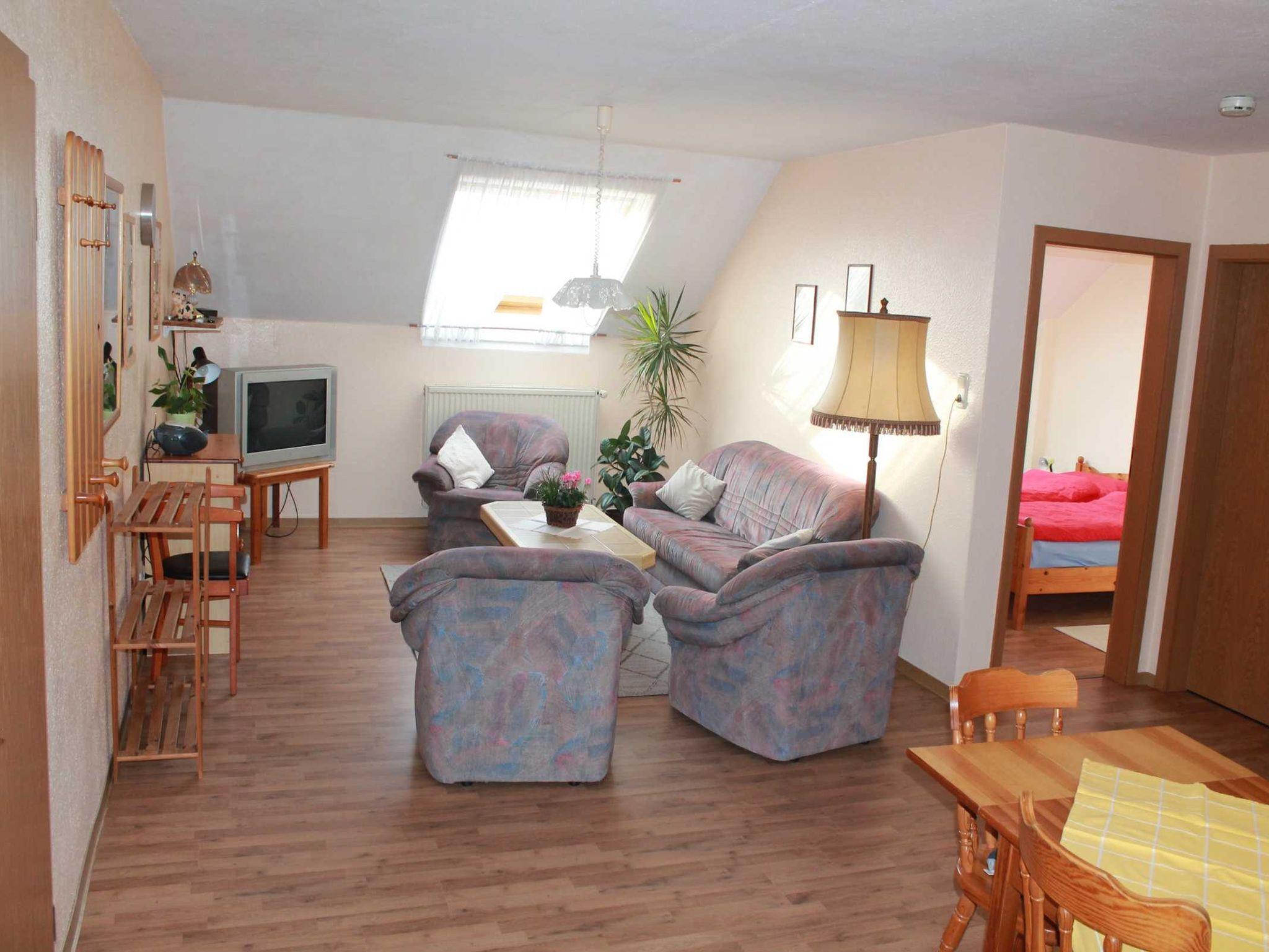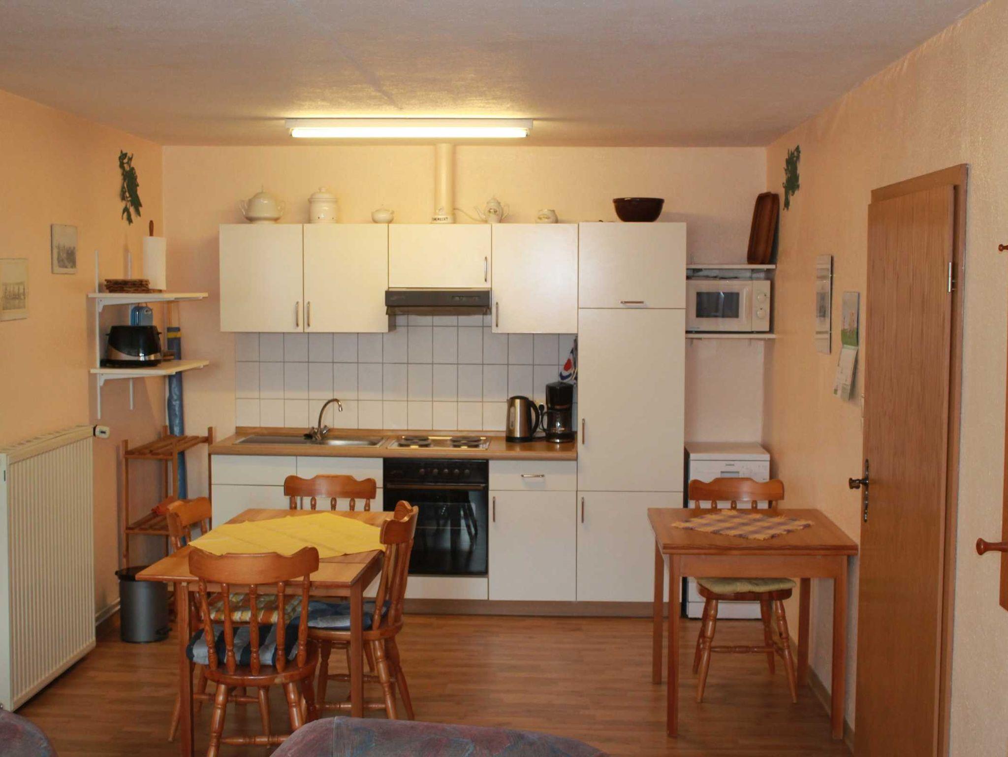 Die Ferienwohnung 1 hat eine Wohnfläche von ca. 65 m² mit zwei separaten Schlafzimmern, einem Doppelzimmer und einem weiterem Zimmer mit 3 Betten (ein Hochbett und ein normales Bett). Badezimmer mit Dusche und WC. Komplett eingerichtete Küchenzeile mit Kaffeemaschine, Wasserkocher, Mikrowelle, Mixer, Toaster, Eierkocher, Herd & Backofen, Kühlschrank und sonstigem Hausrat. Das Wohnzimmer ist mit einem Farbfernseher (Sat-Anlage) und Radiogerät ausgestattet. Für die kleinen Gäste steht ein Reisebettchen oder Kinderbett einschließlich Bettwäsche sowie ein Hochstuhl, Spielzeug und ein Spielplatz zur Verfügung. Hunde sind bei uns auch gern gesehene Gäste.