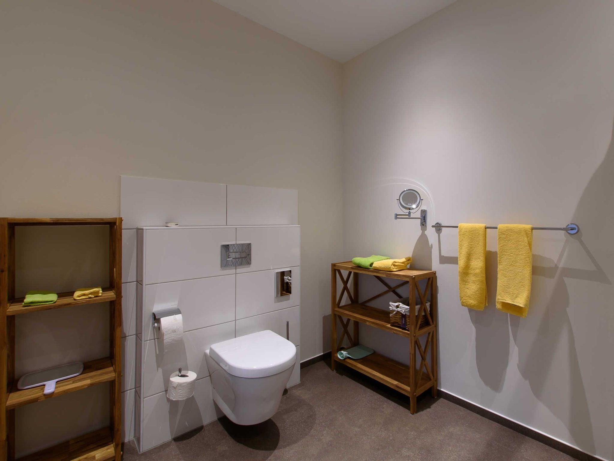 Auch hier gilt: Freie Fahrt für Rollstuhl und Rollator! Genau wie in Wohnung 1 genießen Sie viel Bewegungsfreiheit und erstklassige sanitäre Annehmlichkeiten. Auch immer mehr Gäste ohne Behinderungen wissen diesen außergewöhnlichen Komfort zu schätzen.Sie befindet sich im Erdgeschoss und verfügt über 2 Terrassen, die einmal westseitig, einmal nordseitig ausgerichtet sind. Wohnzimmer und Küche sind durch eine offene Bauweise verbunden. Fußbodenheizung in der ganzen Wohnung kostenfreies WLAN