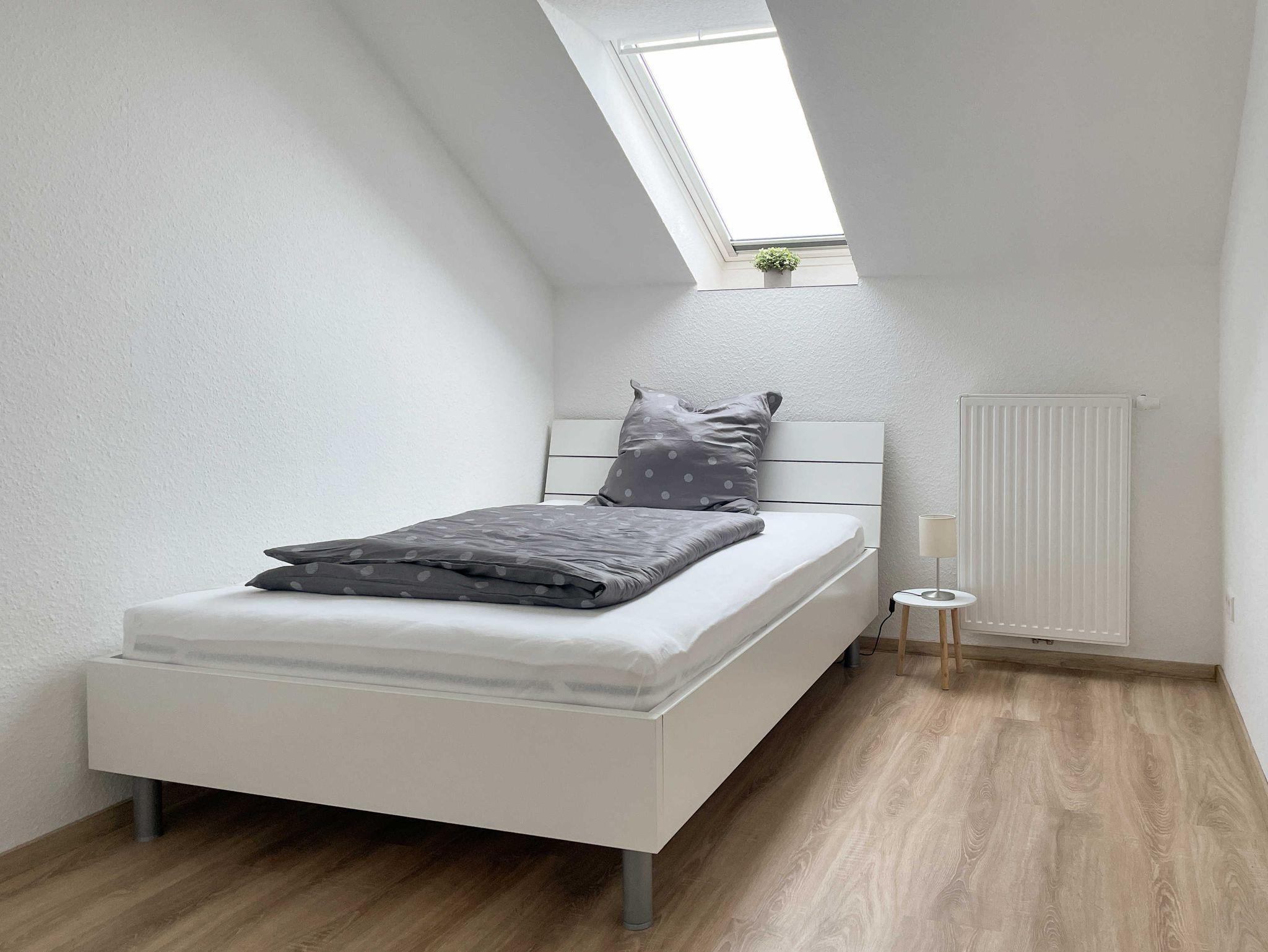 • Schlafzimmer mit Doppelbett und Kleiderschrank