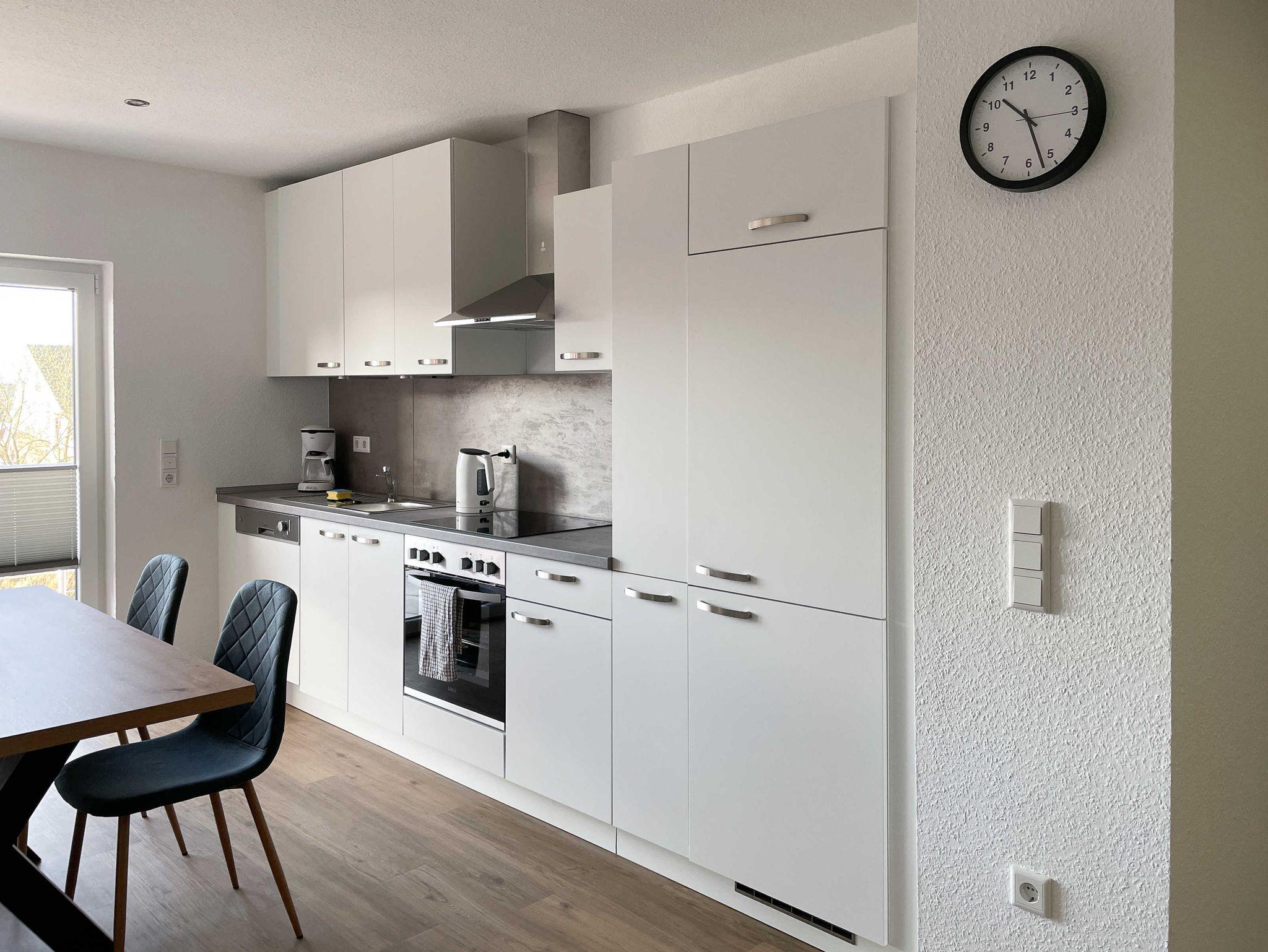 • Großzügige Wohnküche mit Sofa, Küche mit Spülmaschine und Backofen und großem Esstisch