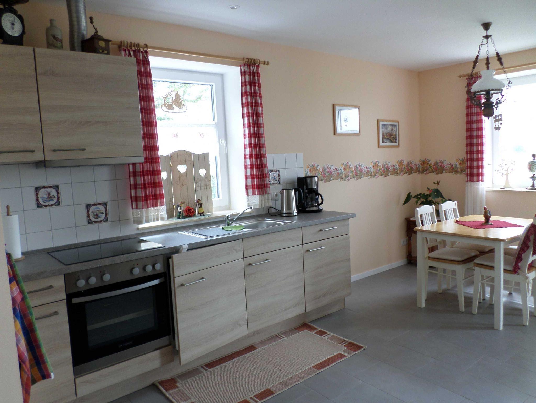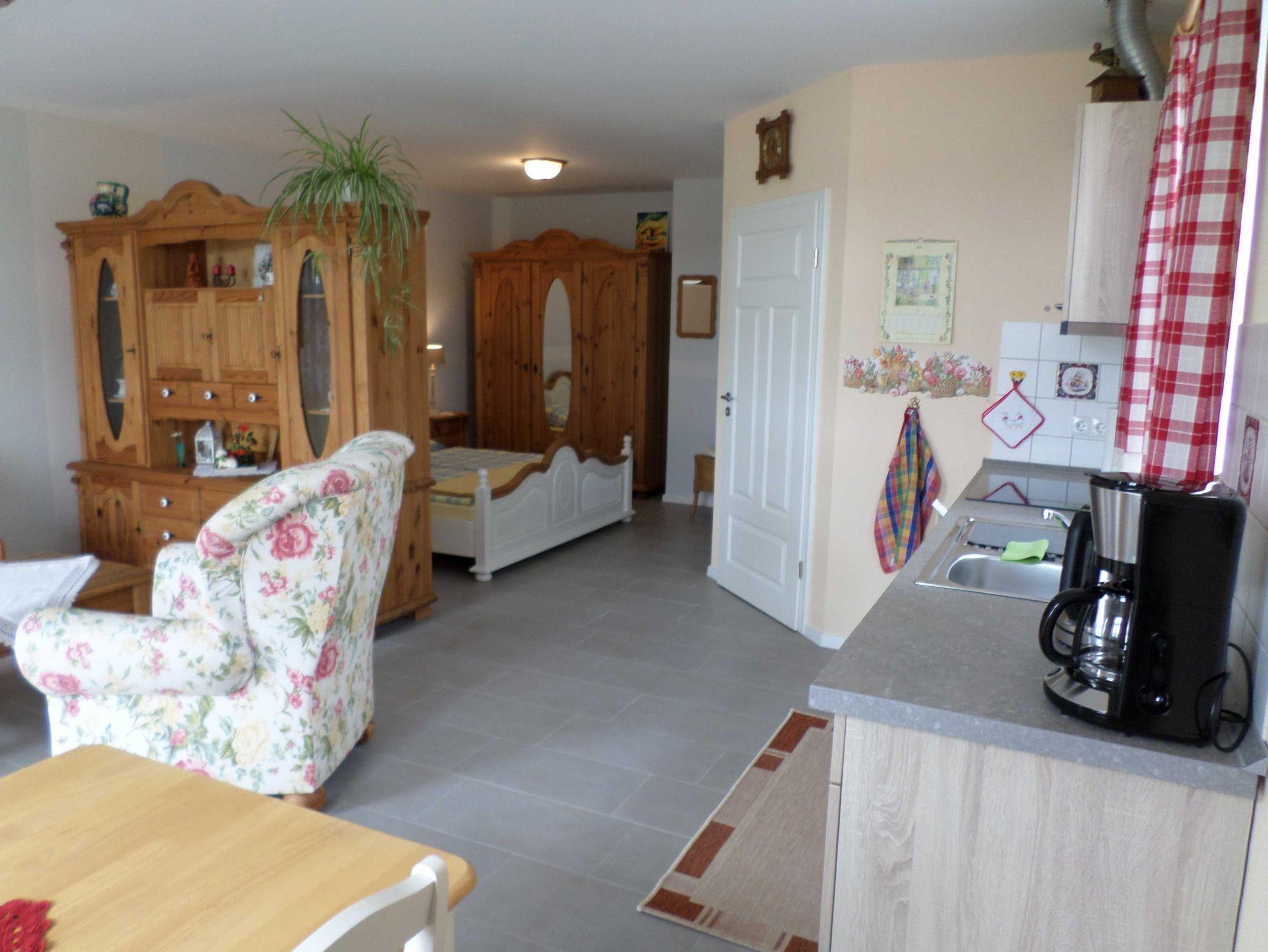 Schönes Apartment (1) für 2 Personen in gemütlich, eingerichtetem Landhausstil. Das Apartment verfügt über einen offenen Grundriss. Der Wohnraum besteht aus einer komplett ausgestatteten Küchenzeile mit Essecke und Flachbild-TV (SAT). Der Schlafraum ist abgetrennt mit Doppelbett. Das separate Bad hat eine ebenerdige Dusche und ein WC. Das Apartment ist für Allergiker geeignet, barrierefrei und mit Fußbodenheizung ausgestattet.