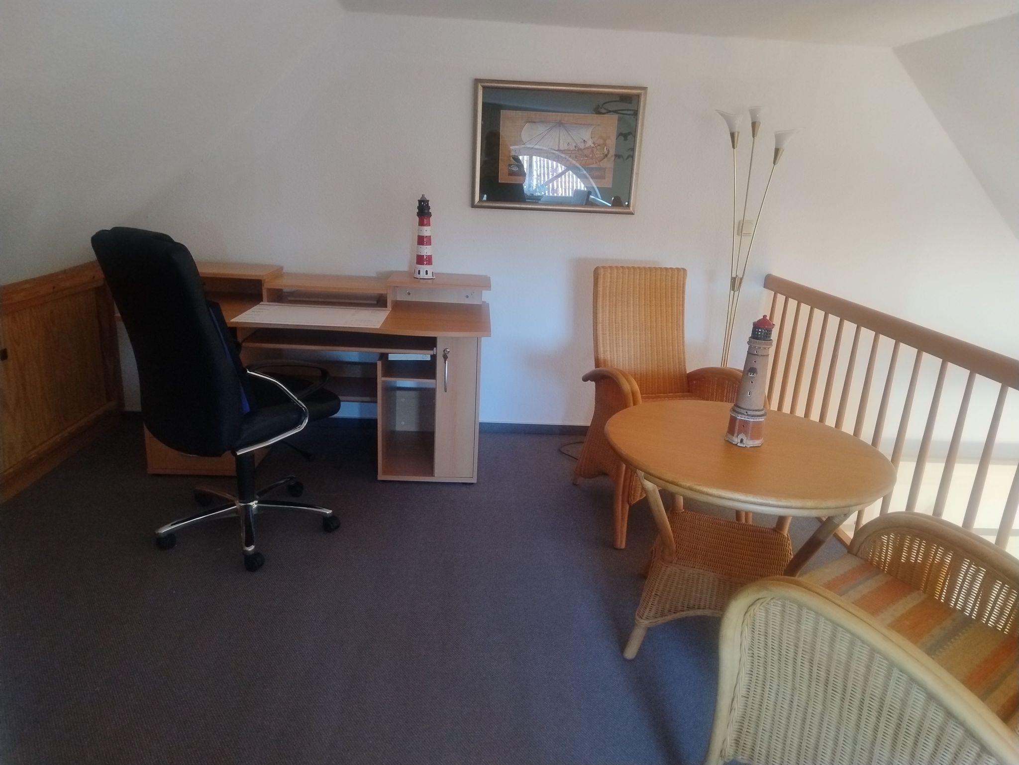 Unsere FeWo bietet eine voll ausgestattete Küche. Entspannen Sie auf dem Balkon oder im gemütlichen Wohnzimmer mit Relaxsesseln, TV und freiem W-Lan. Die Wohnung hat ein Tageslichtbad mit Dusche/WC, im Schlafzimmer befindet sich ein Boxspringbett (2x2m). Oben in der offenen Galerie lädt eine gemütliche Leseecke am Fenster zum Verweilen ein. Sollten Sie beruflich unterwegs sein, ist oben ein Schreibtisch vorhanden.