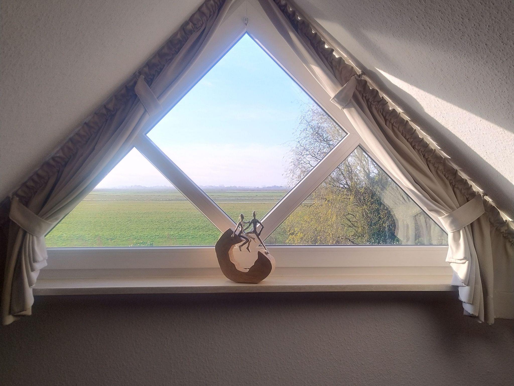 In Ostfriesland sagt man, das Land ist so platt, da sieht man morgens, wer nachmittags zum Tee kommt. Wenn man aus dem dreieckigen Fenster der FeWo Fernkieker blickt, könnte das zutreffen. Ein wunderschöner Ausblick in die Natur, Ruhe, Entspannung und Erholung bietet diese hochwertige und voll ausgestattete Oberwohnung.
