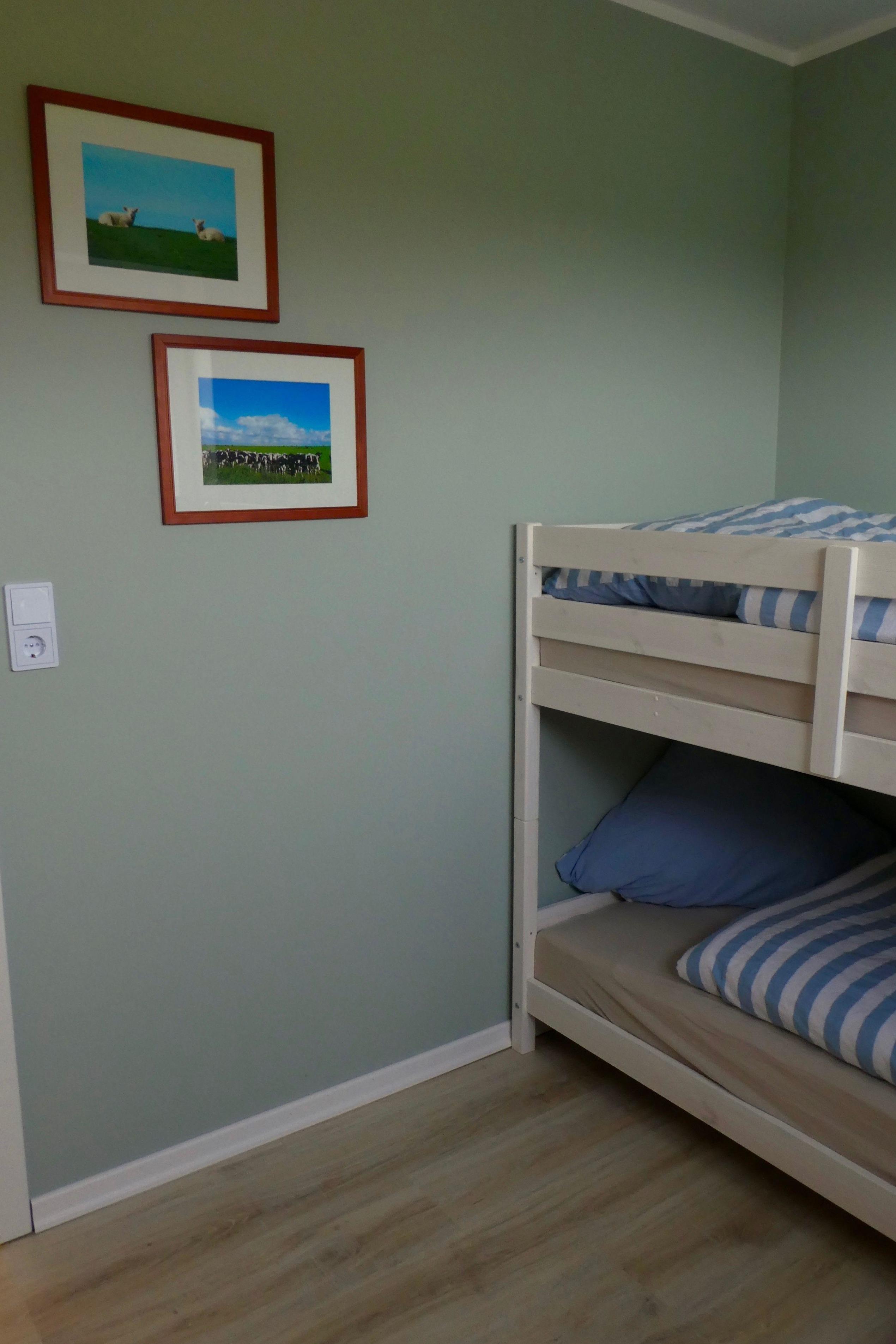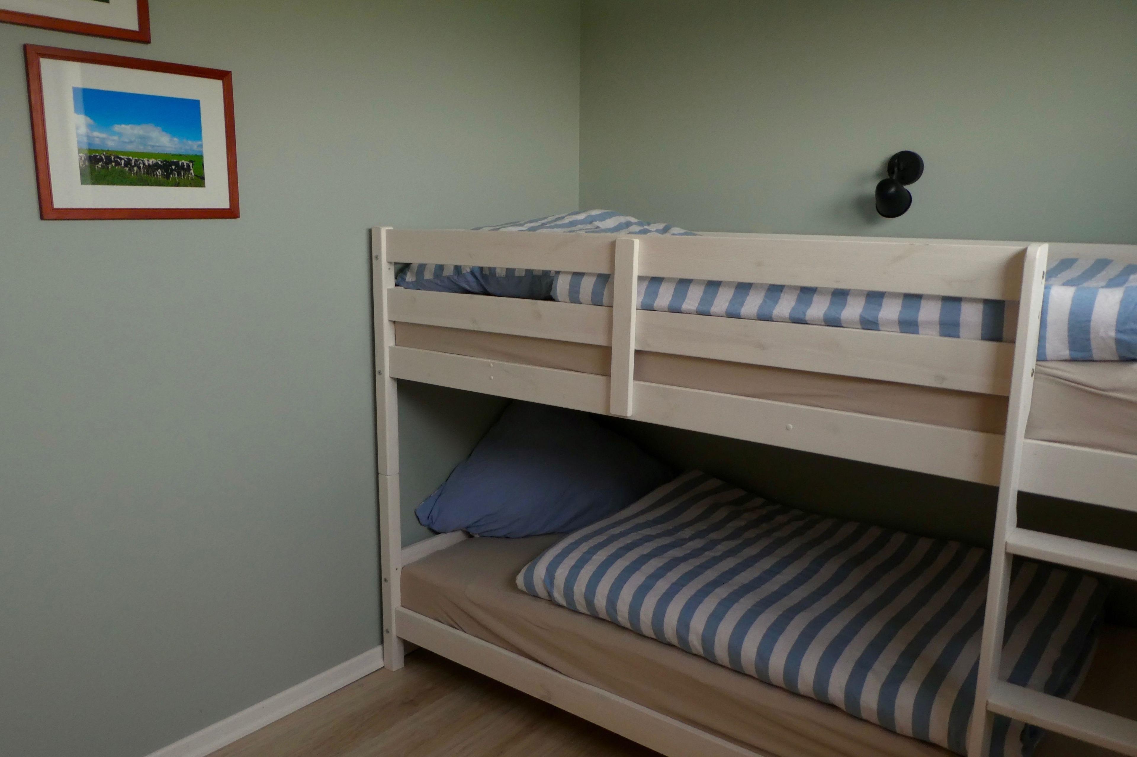 Mit ca 55 qm verfügt sie über ein Elternschlafzimmer mit Doppelbett (160 cm), ein Kinderzimmer mit Etagenbett, ein Bad und einen gemütlichen Ess-/Wohnbereich mit integrierter Küchenzeile und bequemen Sitzmöglichkeiten. Die Küche ist ausgestattet mit Mikrowelle, Wasserkocher, Cerankochfeld, Backofen, Toaster und einer Kombi Senseo Kaffeemaschine.