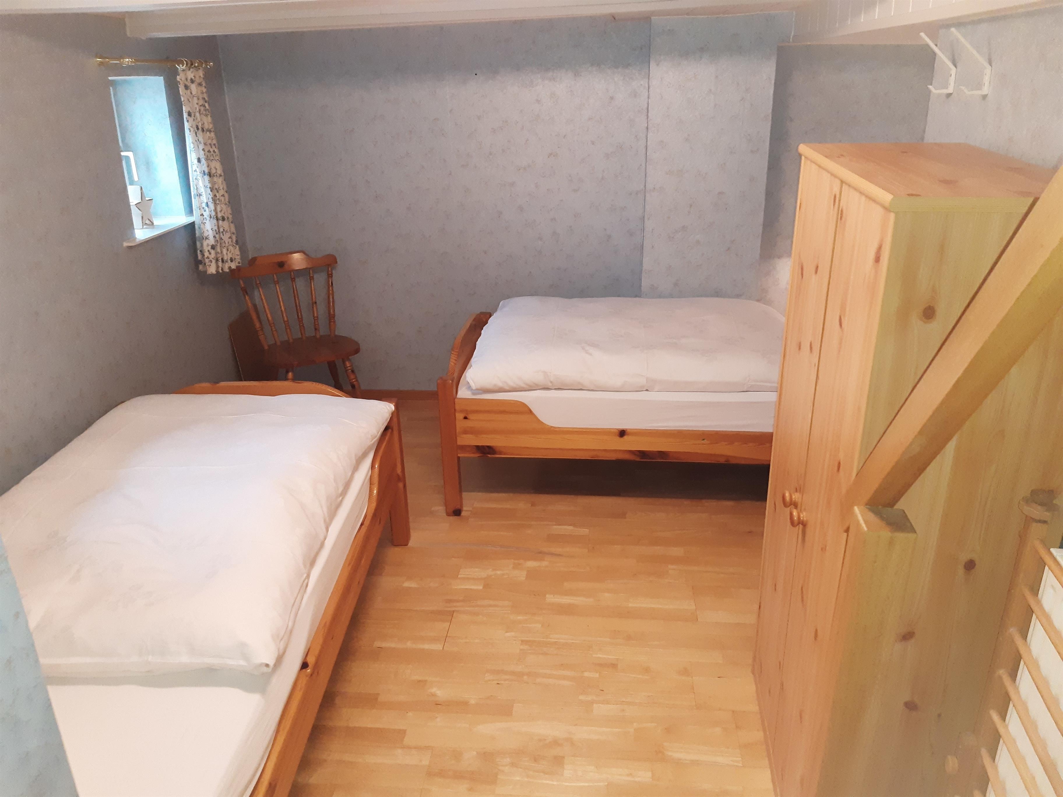 Das Schlafzimmer mit den zwei Einzelbetten ist über eine steile Treppe (siehe Fotos) zu erreichen, die oben im Flur mit einem Kindersicherheitsgitter abgetrennt werden kann (oder man schließt einfach die Tür).