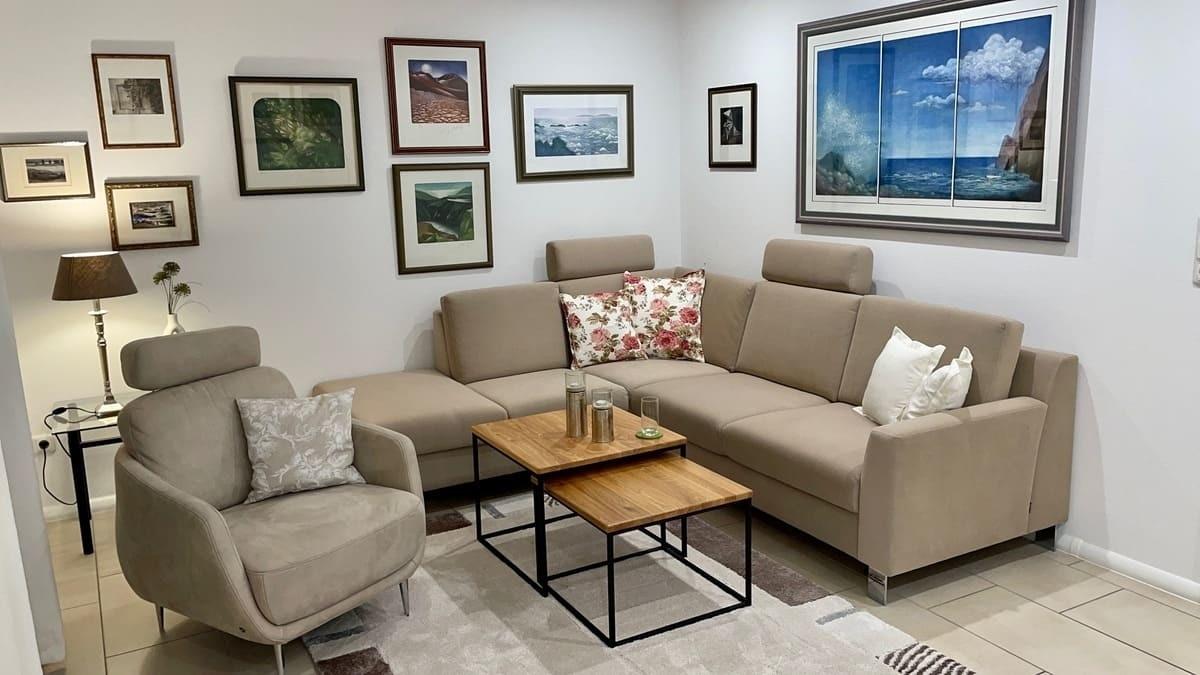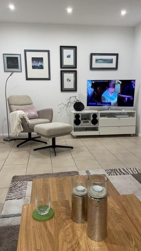 Gemütliche Abende sind im Wohnzimmer mit Sofa, Fernsehsessel und SAT-TV möglich.