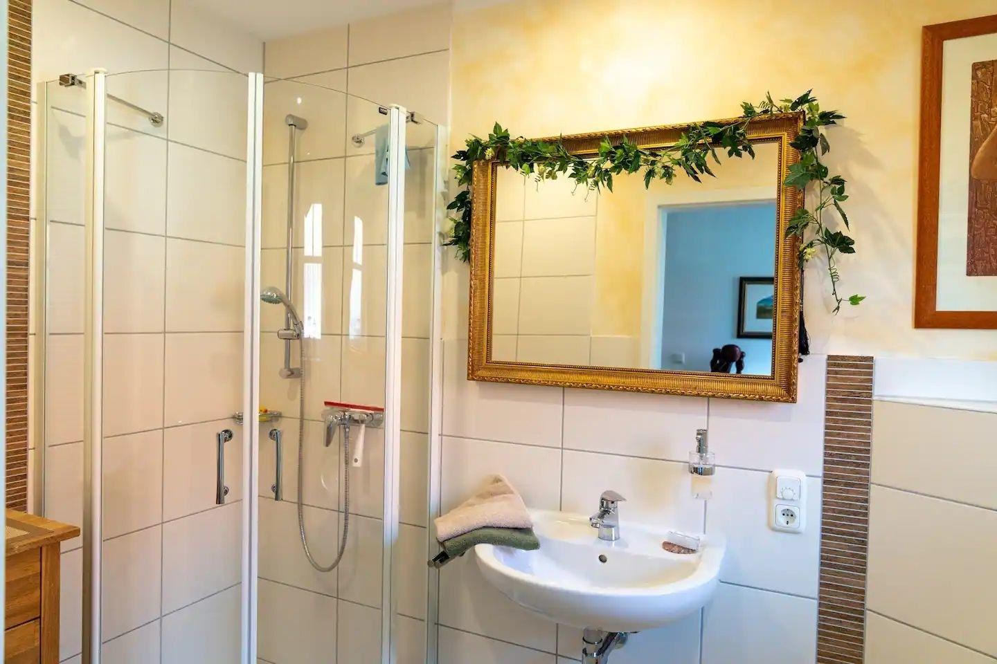 Die beiden Bäder sind jeweils mit Dusche und WC ausgestattet. Im "Bad en Suite" befindet sich eine geräumige, ebenerdige Dusche mit Sitz.