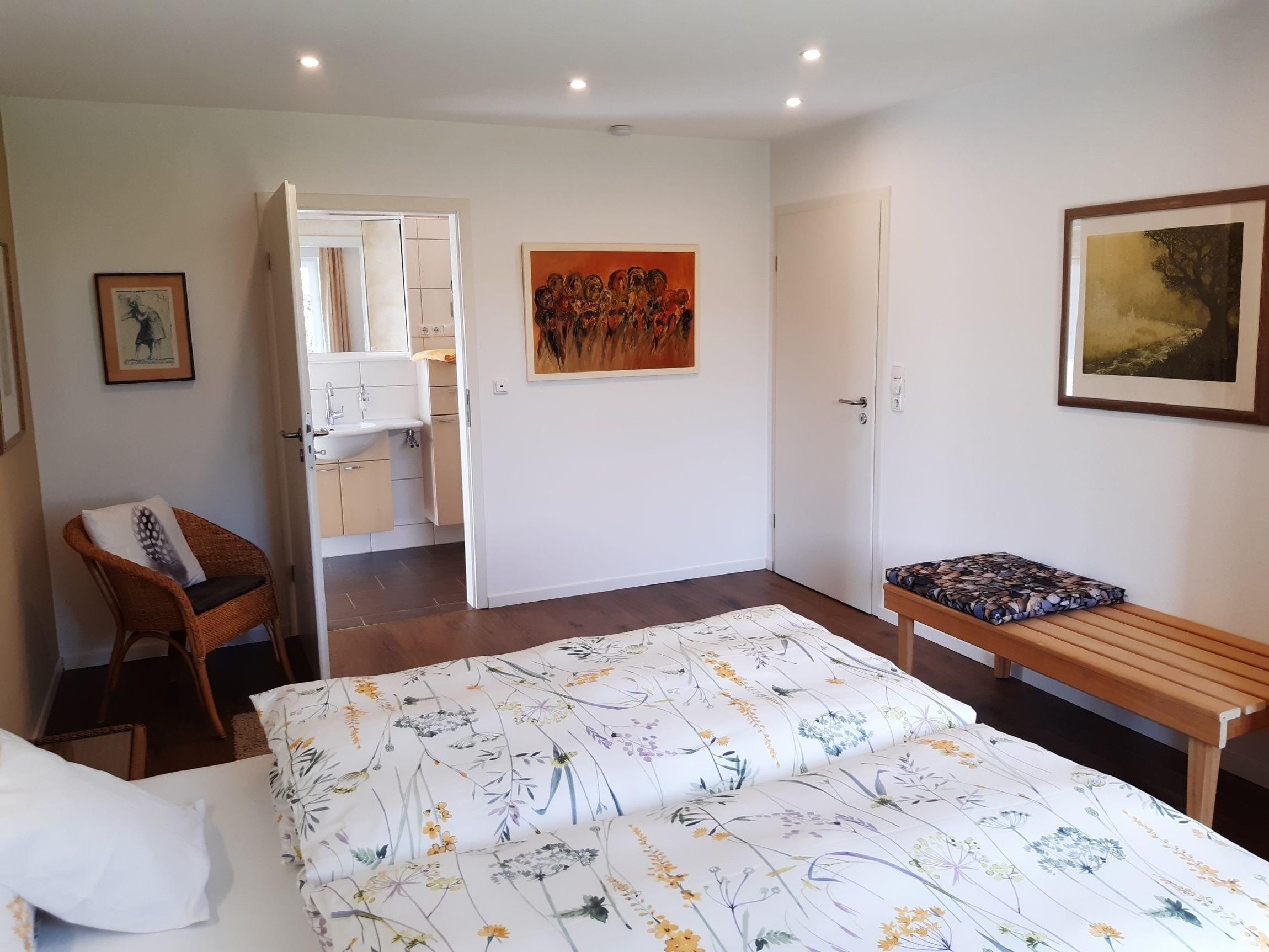 Das große Schlafzimmer bietet ein "Bad en Suite" sowie ein gemütliches Doppelbett (1,6 x 2m) und einen Kleiderschrank. Im etwas kleineren Schlafzimmer stehen zwei Einzelbetten mit Kleiderschrank und Schreibplatz zur Verfügung.