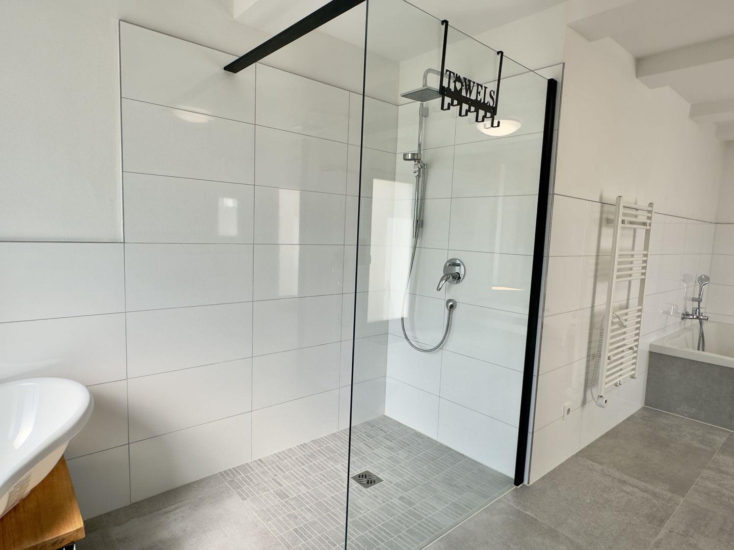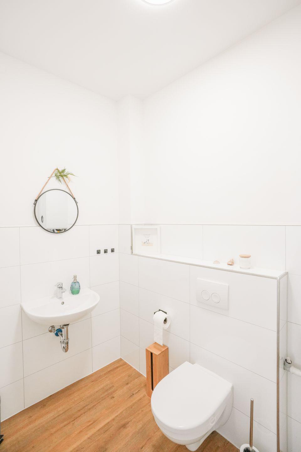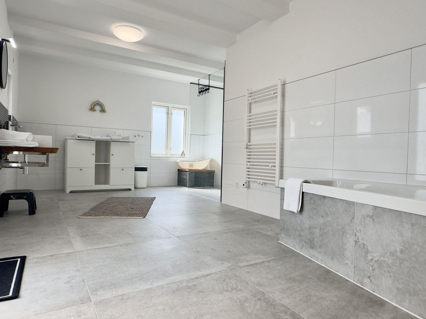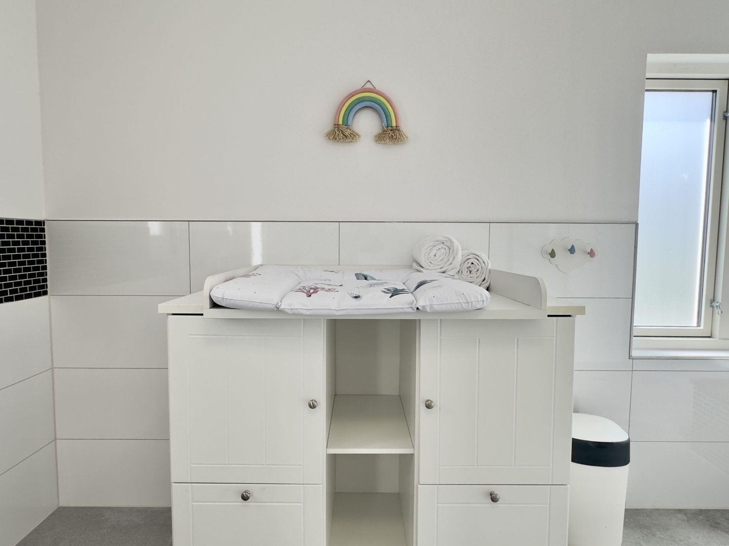 Das große Badezimmer im Erdgeschoss erstrahlt in heller, moderner Gestaltung und verfügt über eine bodenebene Dusche und eine Badewanne, die zu entspannten Momenten einladen. Auch an die Kleinsten wurde gedacht: Eine Wickelkommode sorgt für zusätzlichen Komfort.