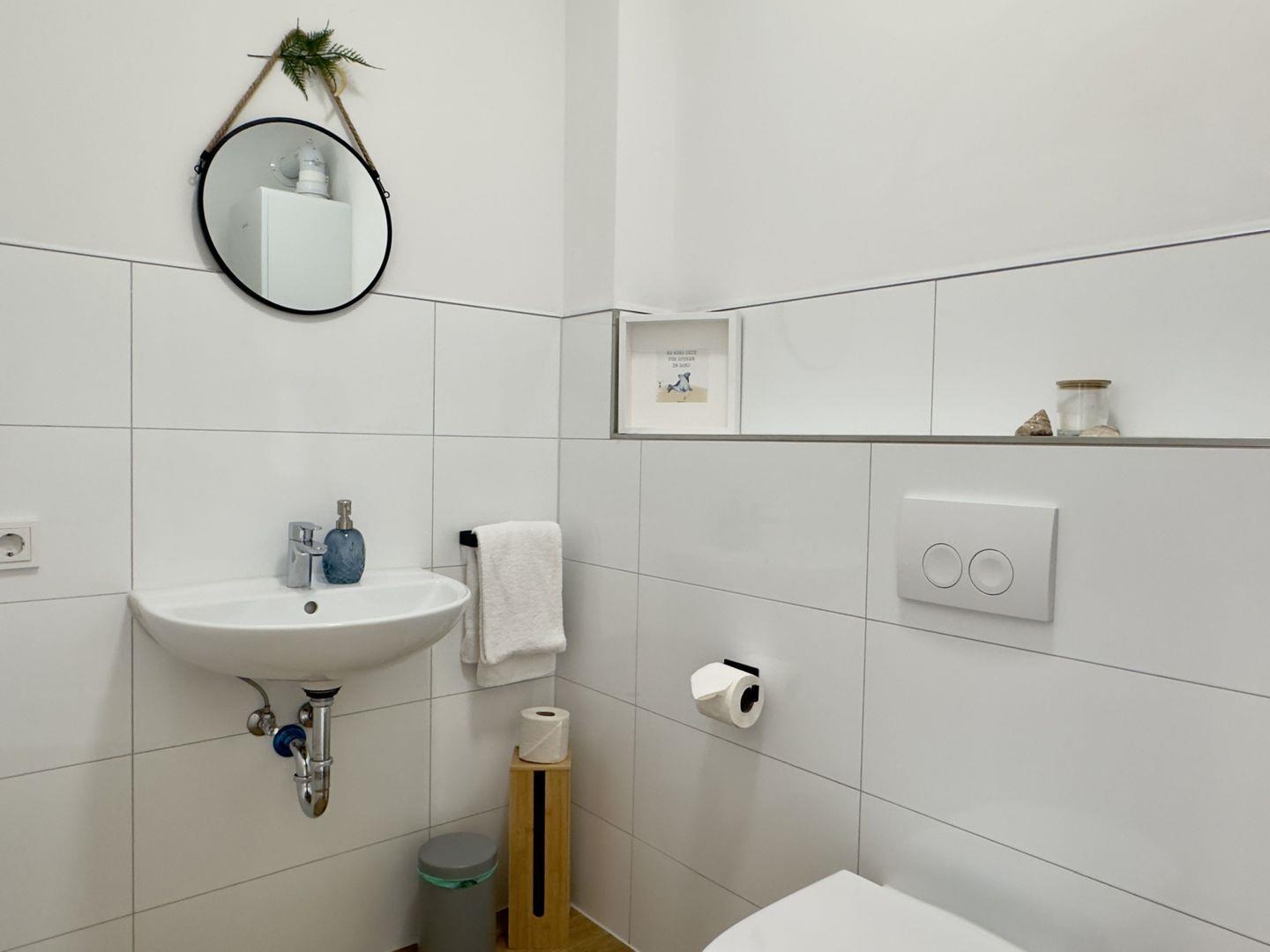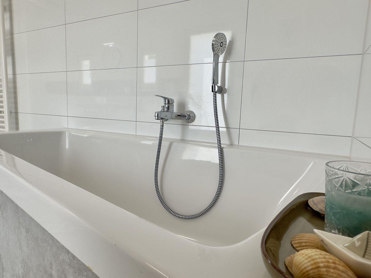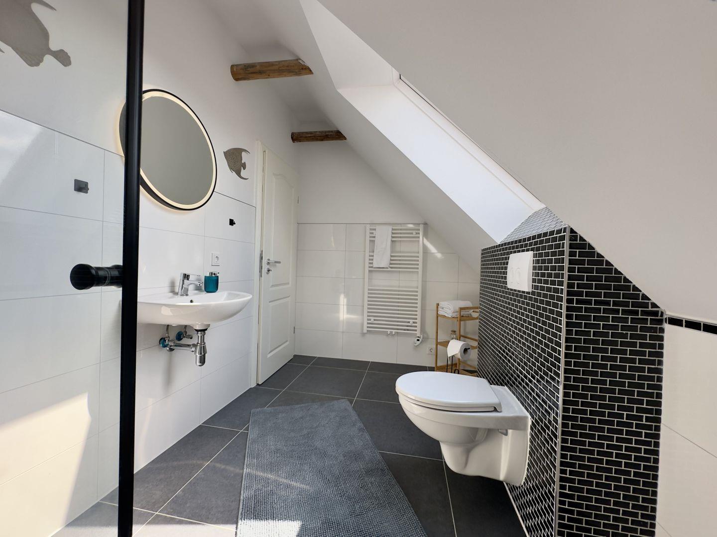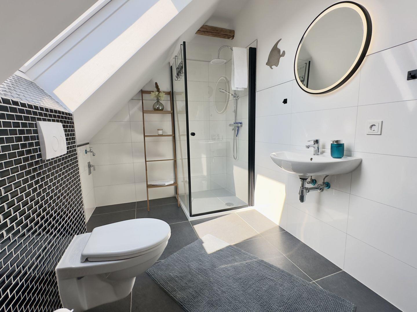 Das große Badezimmer im Erdgeschoss erstrahlt in heller, moderner Gestaltung und verfügt über eine bodenebene Dusche und eine Badewanne, die zu entspannten Momenten einladen. Auch an die Kleinsten wurde gedacht: Eine Wickelkommode sorgt für zusätzlichen Komfort.