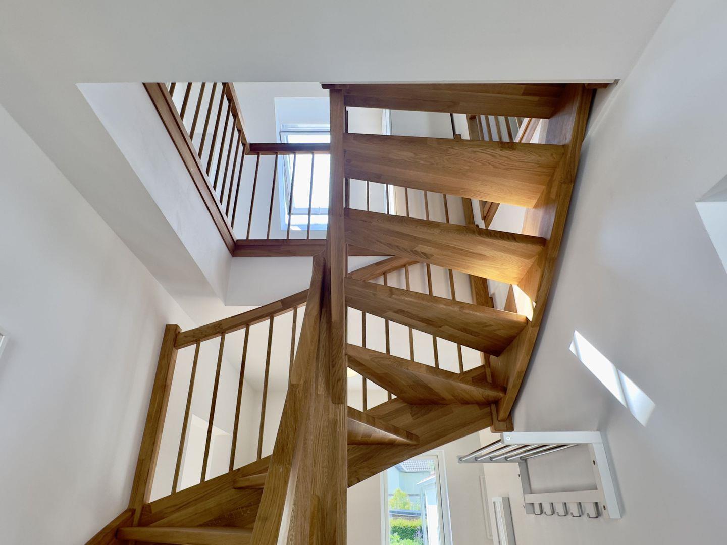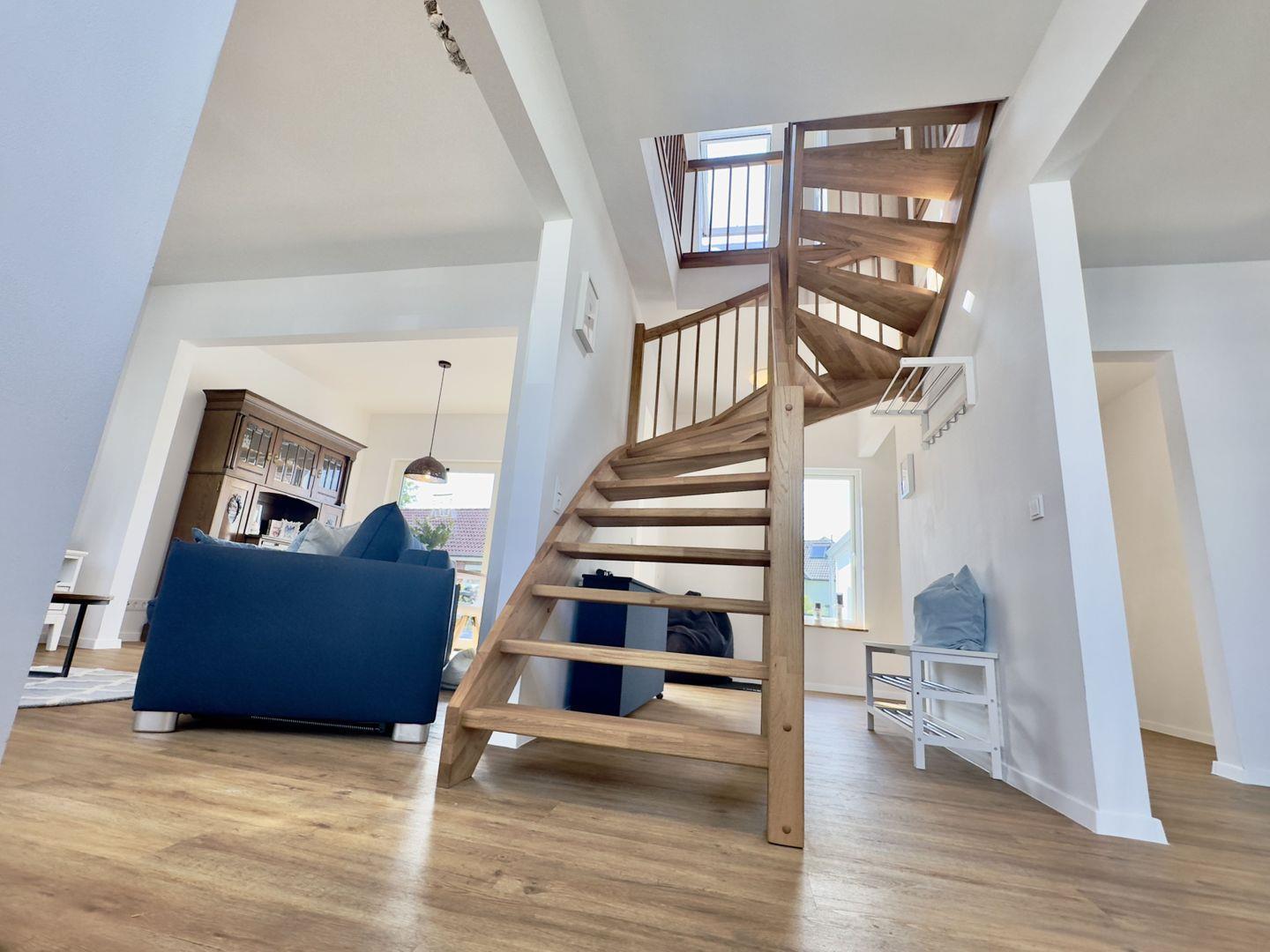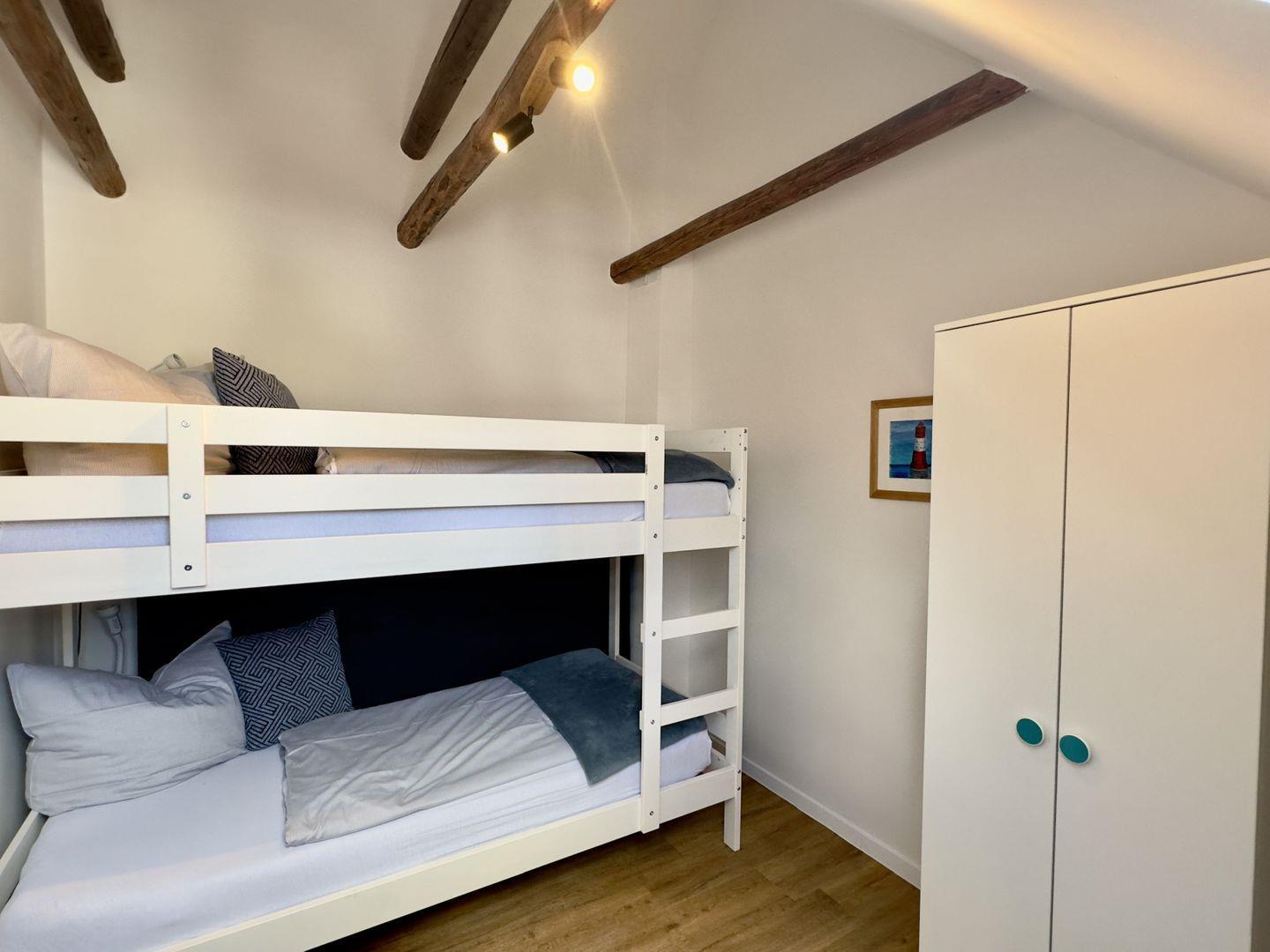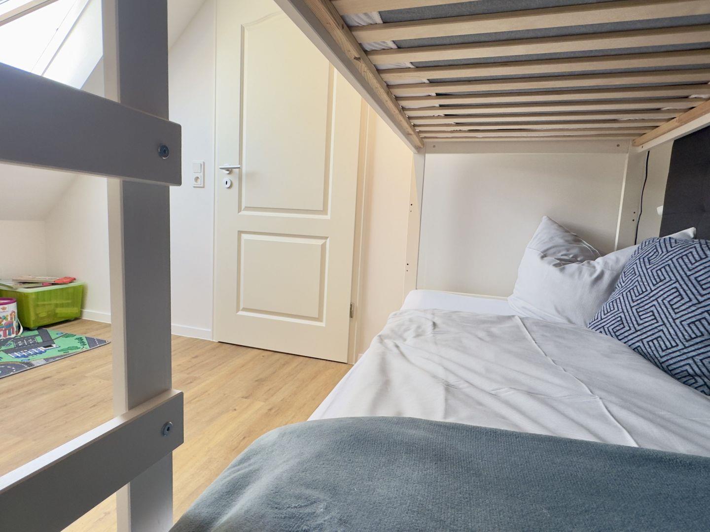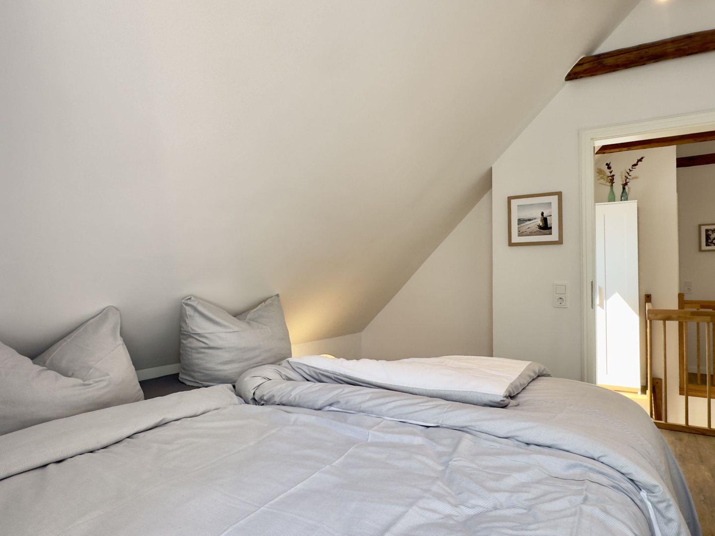 Über eine wunderschöne, massive Holztreppe gelangen Sie ins Obergeschoss, wo drei Schlafzimmer und ein zusätzliches Badezimmer auf Sie warten. Die beiden Schlafzimmer sind mit hochwertigen Boxspringbetten und Kleiderschränken ausgestattet, während das Kinderzimmer mit einem Etagenbett und einer weiteren Spielecke Platz für zwei weitere Personen bietet. Das zusätzliche Badezimmer im Obergeschoss verfügt über eine weitere Dusche und besticht durch Helligkeit und Modernität.