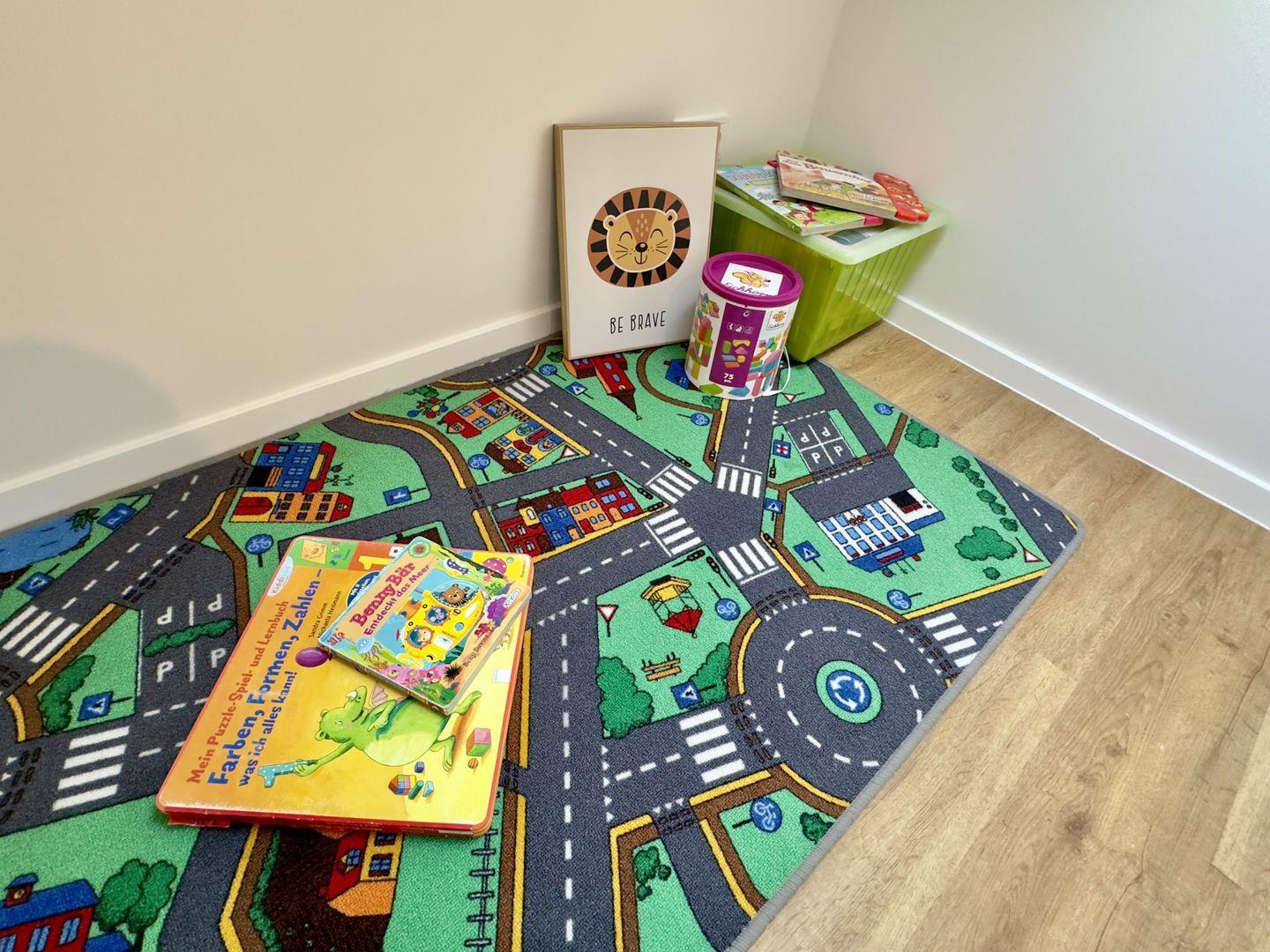 Das geräumige Wohnzimmer beeindruckt mit großen Fensterfronten, die viel Licht hereinlassen. Eine gemütliche Sofa-Ecke und ein Sessel laden zu entspannten Abenden vor dem TV ein, während die Essgruppe im selben Raum zu gemeinsamen Mahlzeiten verführt. Auch für Ihren Hund ist gesorgt: Ein liebevoll gestalteter Hundeplatz mit Körbchen bietet Ihrem Vierbeiner einen schönen Platz bei der Familie. Für die kleinen Gäste gibt es eine Spielecke, die sie begeistern wird.